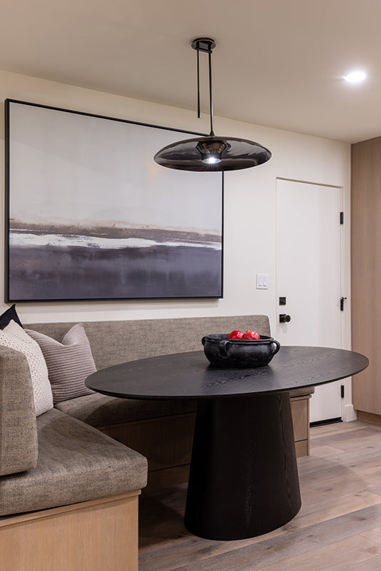The large canvas painting creates a powerful focal wall for the cozy banquette. Framed in ebony, the pale blues and charcoals bring out the black accents throughout the space.