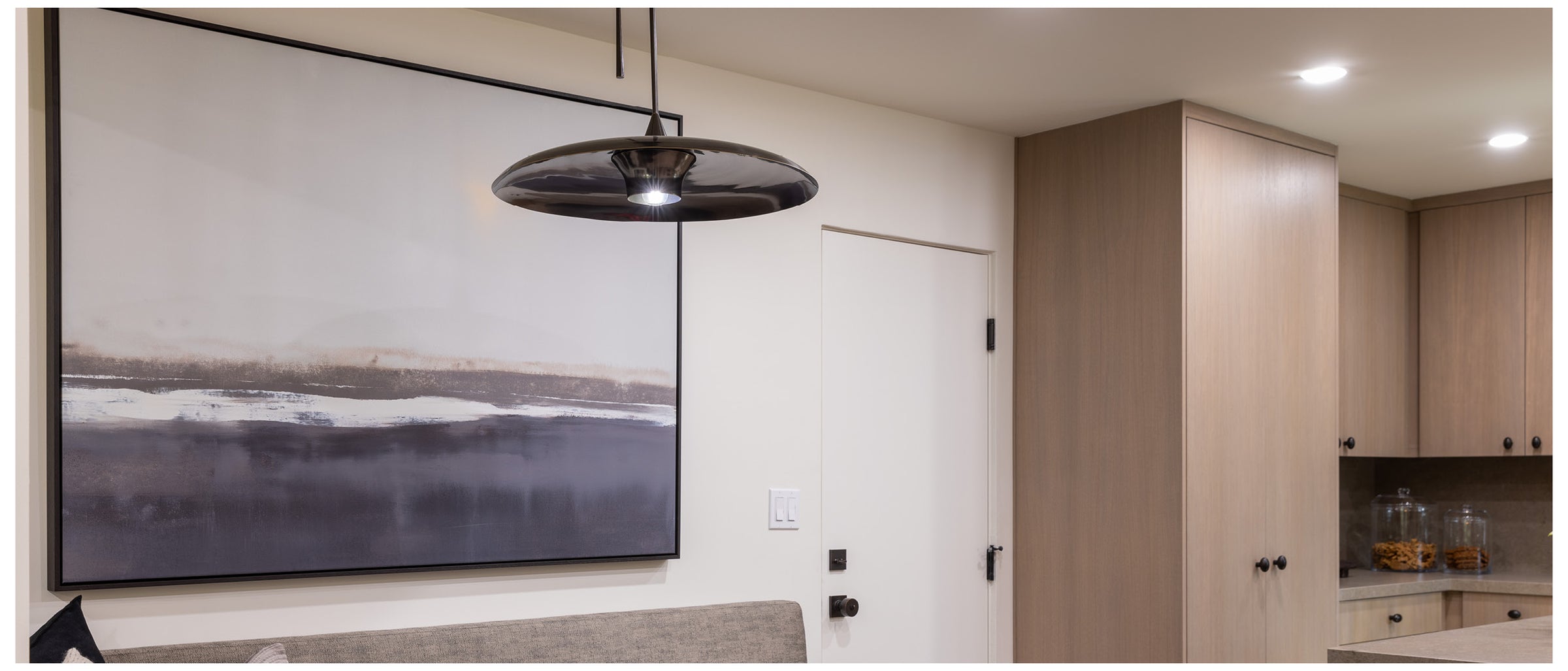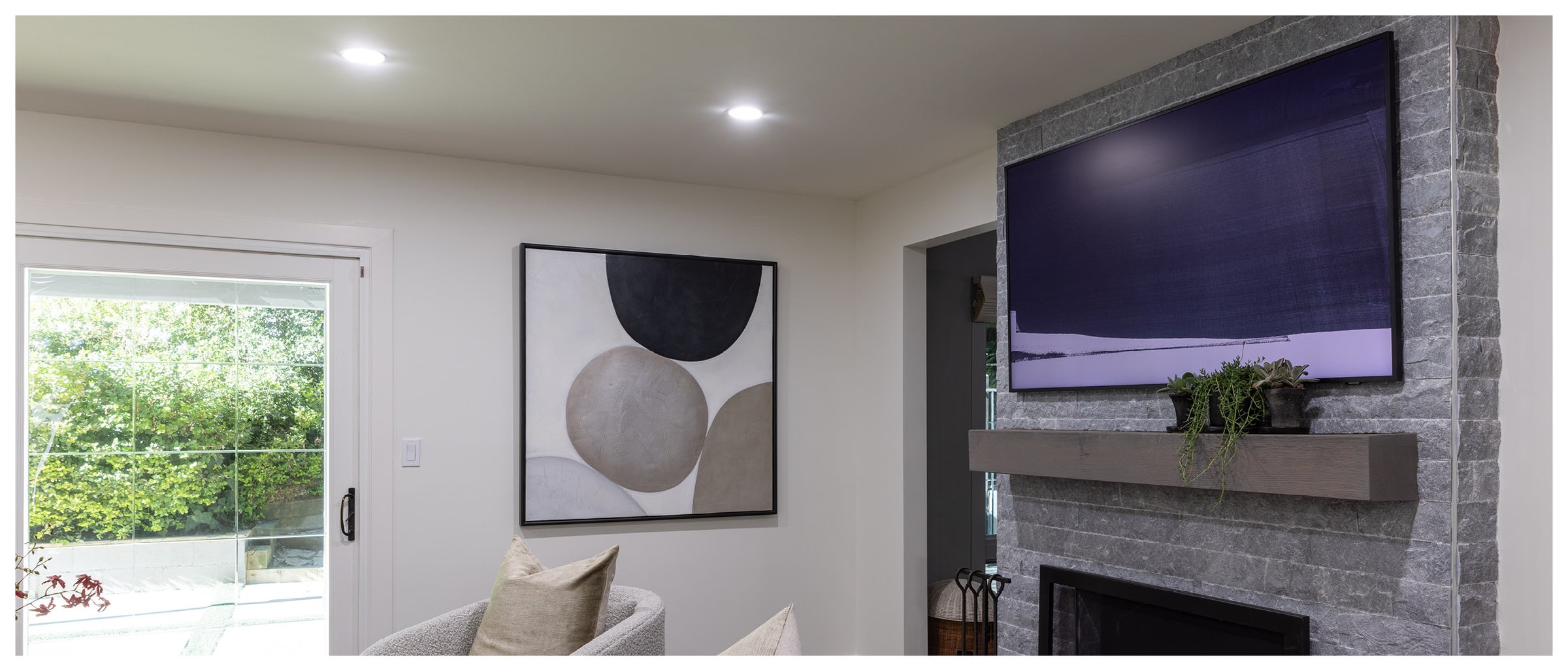 The bold black and white artwork is used digitally to enhance the living space when the television is not in use. This is a great way to hide the less desirable screen and add interest with a changeable digital art collection.