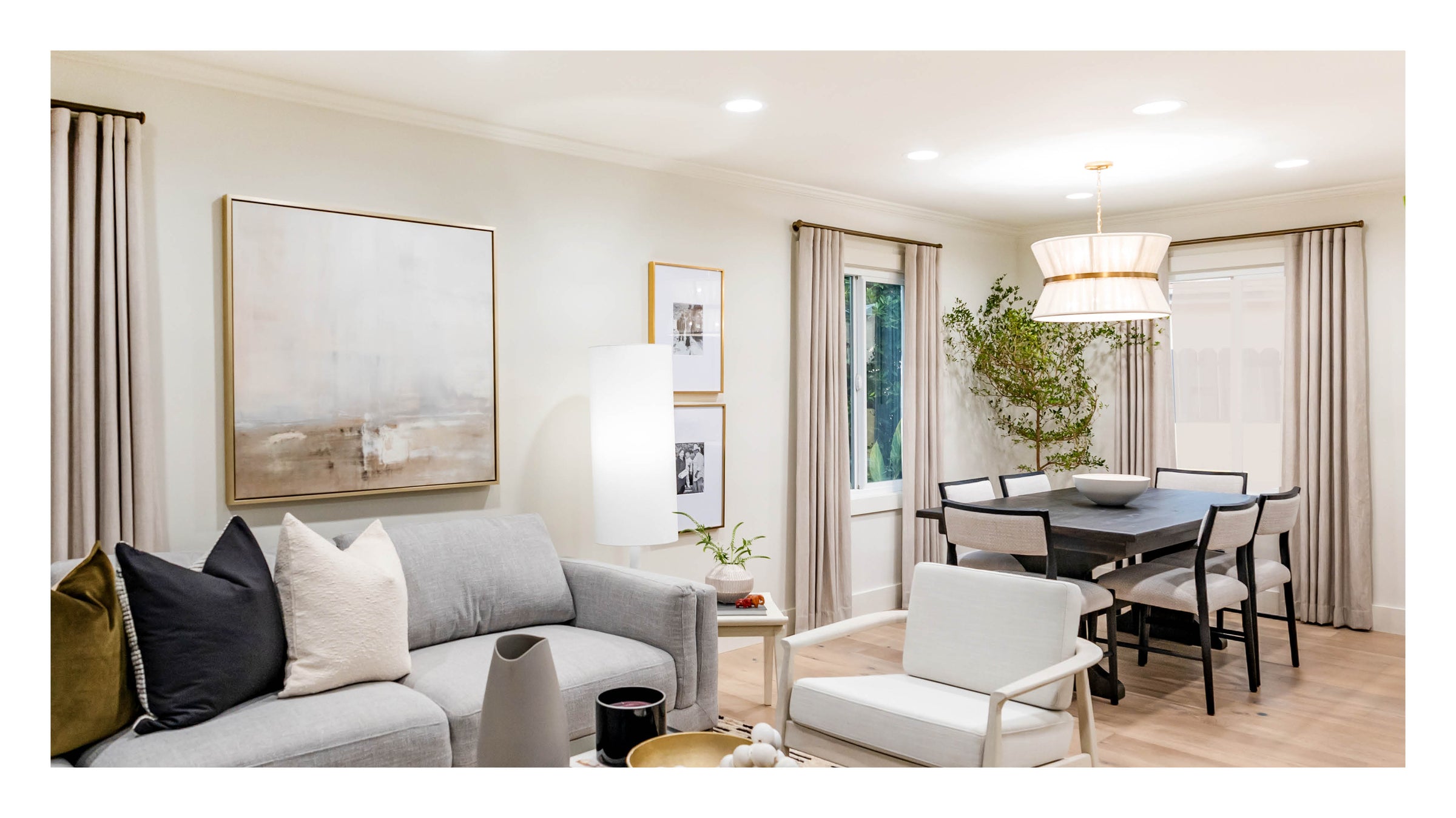 The design team selected a custom Dune canvas in a champagne gold frame as the focal wall for the living room reveal.