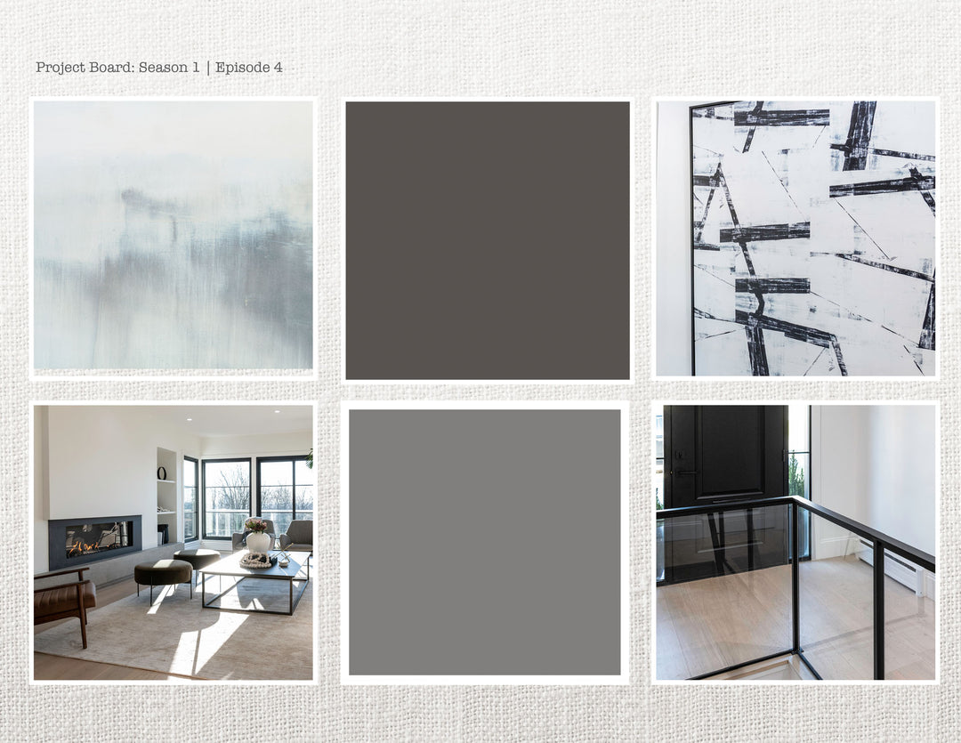 The custom 39x57" canvas hangs in the entry, inspired by architectural elements. The canvas is framed in ebony for added detail.