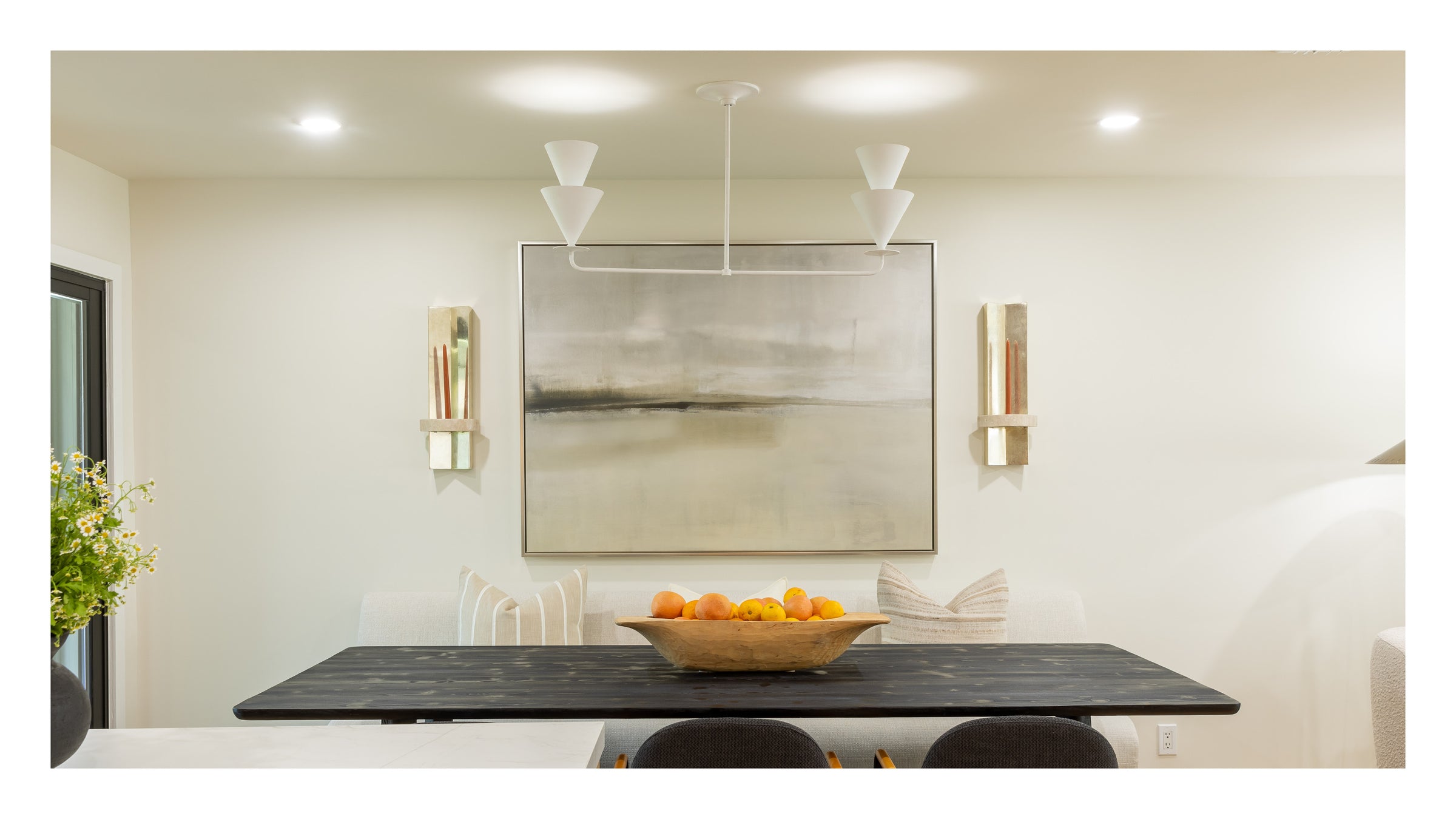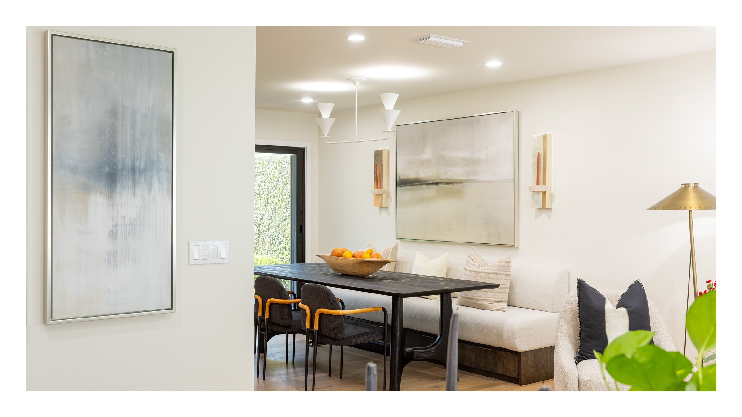 Winter's End creates a strong focal point, balanced by the custom built-in banquet. The canvas contrasted beautifully with the dark table and chairs.