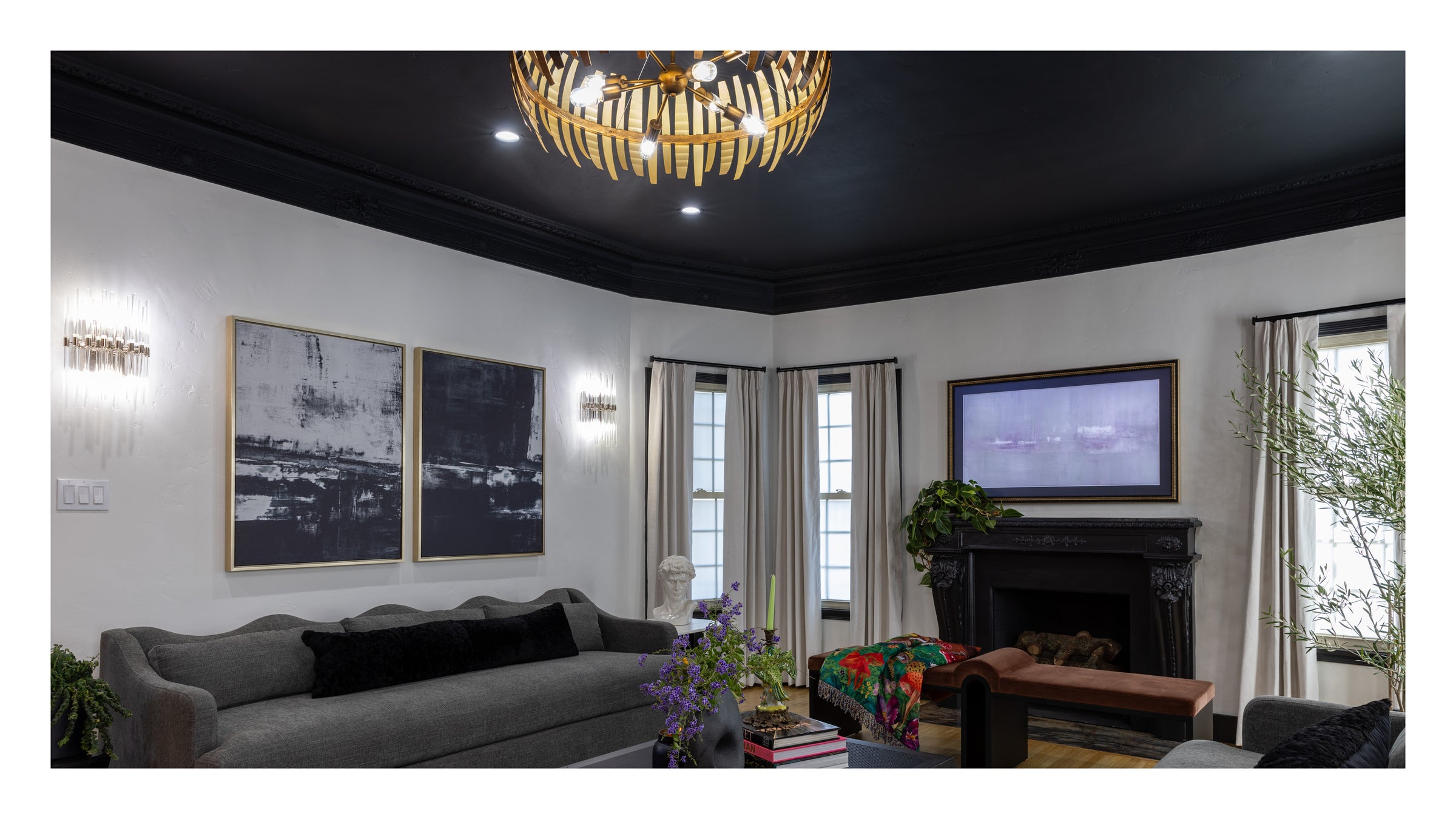Rosario Dawson's project created a moody living room with Halos and Shallow in Charcoal balancing the space. Each canvas is framed in champagne gold.