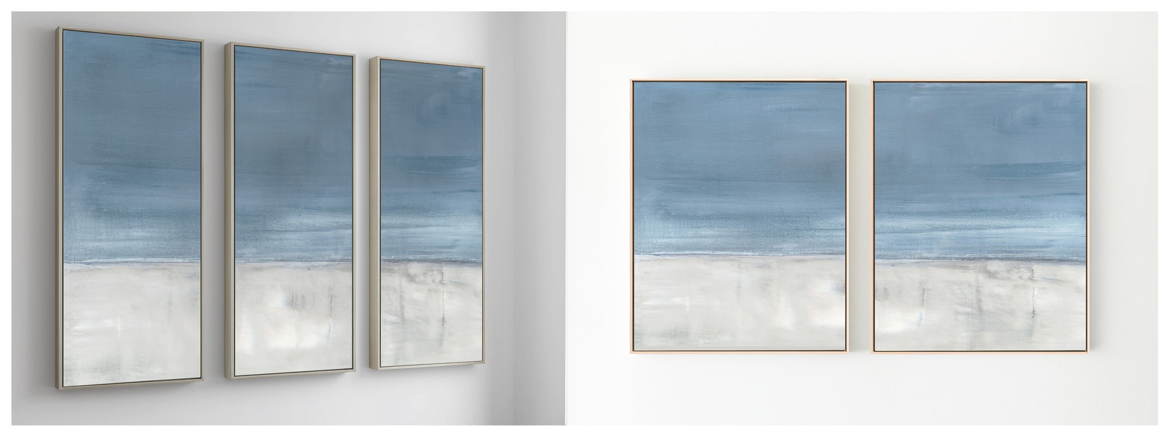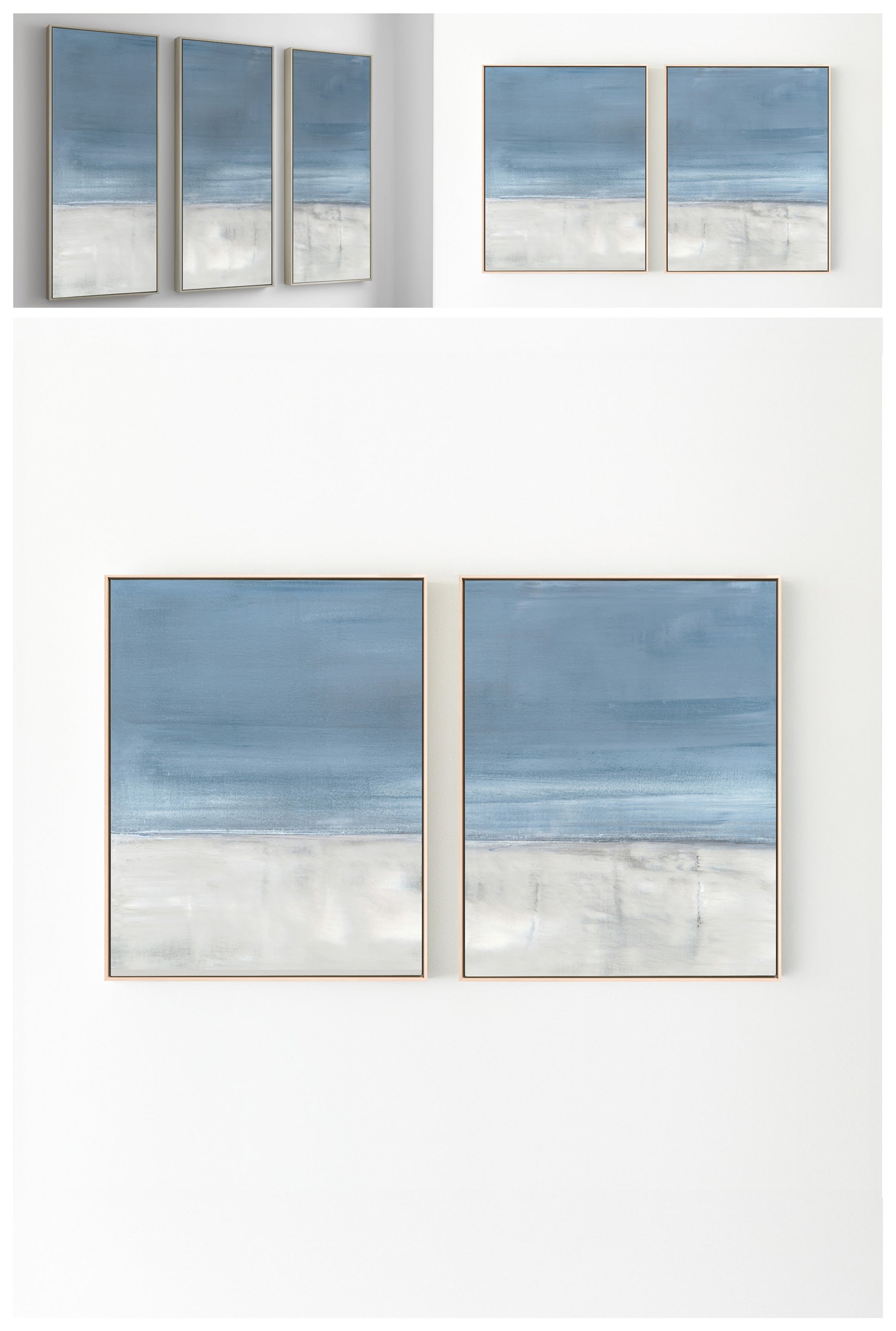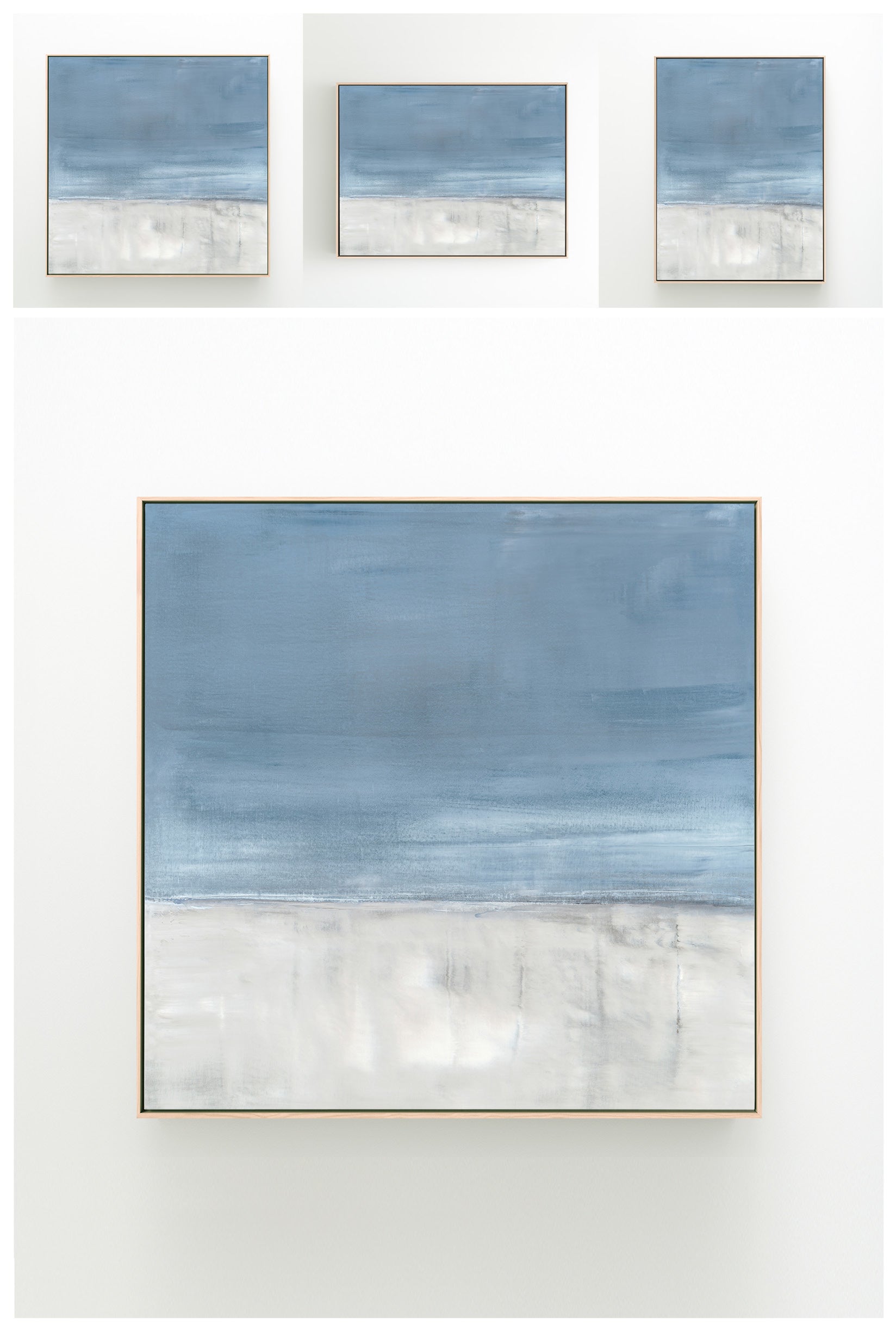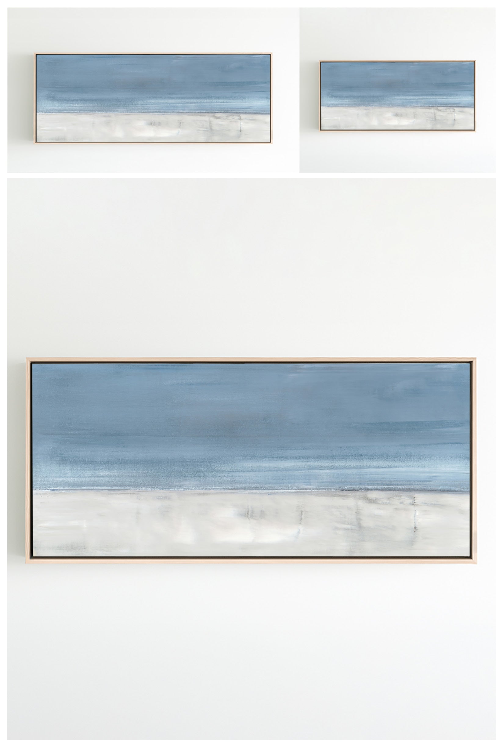 An abstract landscape in soft periwinkles. The Collection offers the painting in several options, from the canvas basics in square, horizontal, and vertical formats, to canvas sets and a narrow adaptation in a range of sizes. Additional customization is available as a hand-finished mixed media canvas.