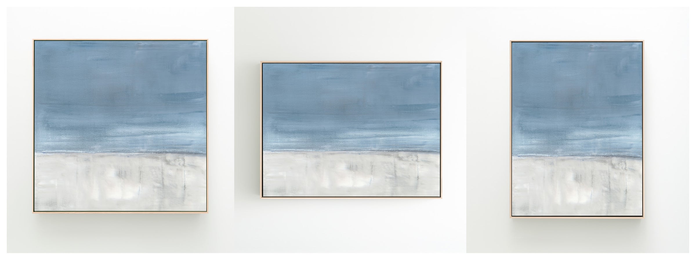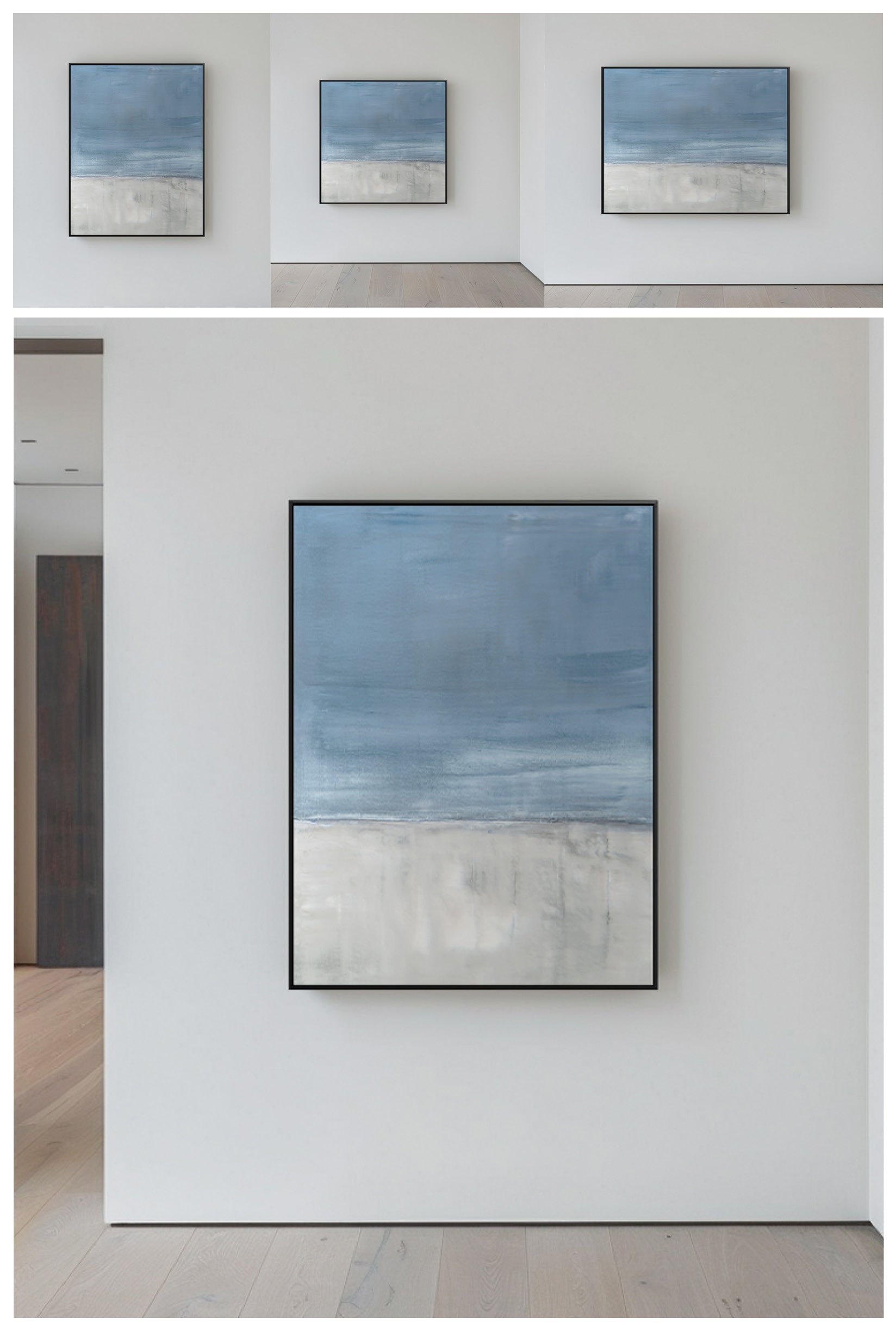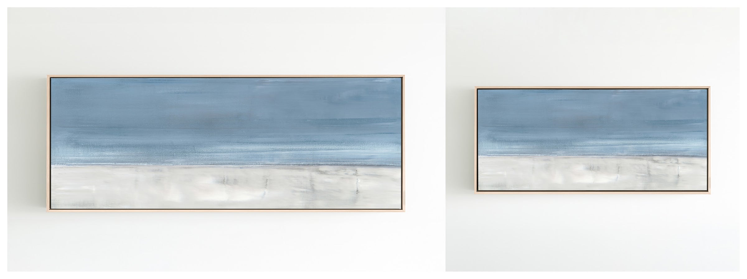 An abstract landscape in soft periwinkles. The Collection offers the painting in several options, from the canvas basics in square, horizontal, and vertical formats, to canvas sets and a narrow adaptation in a range of sizes. Additional customization is available as a hand-finished mixed media canvas.