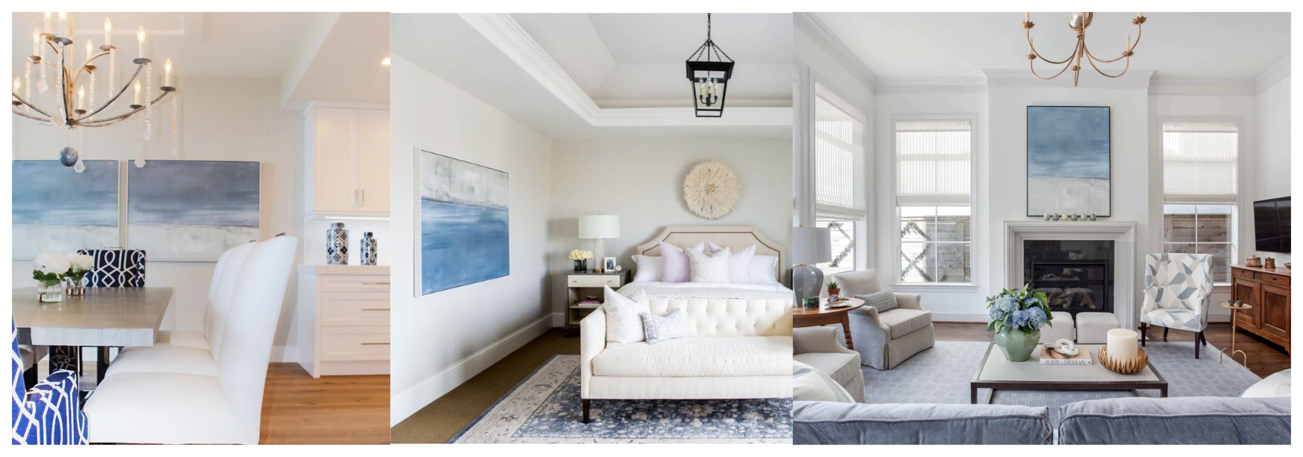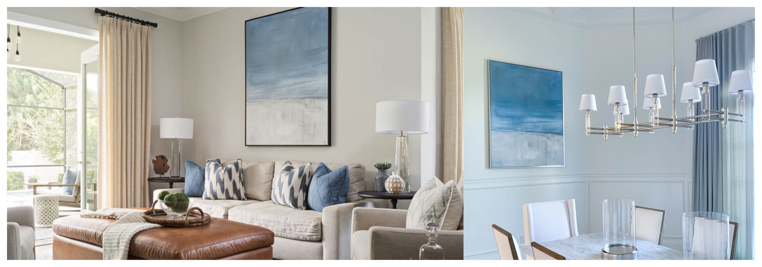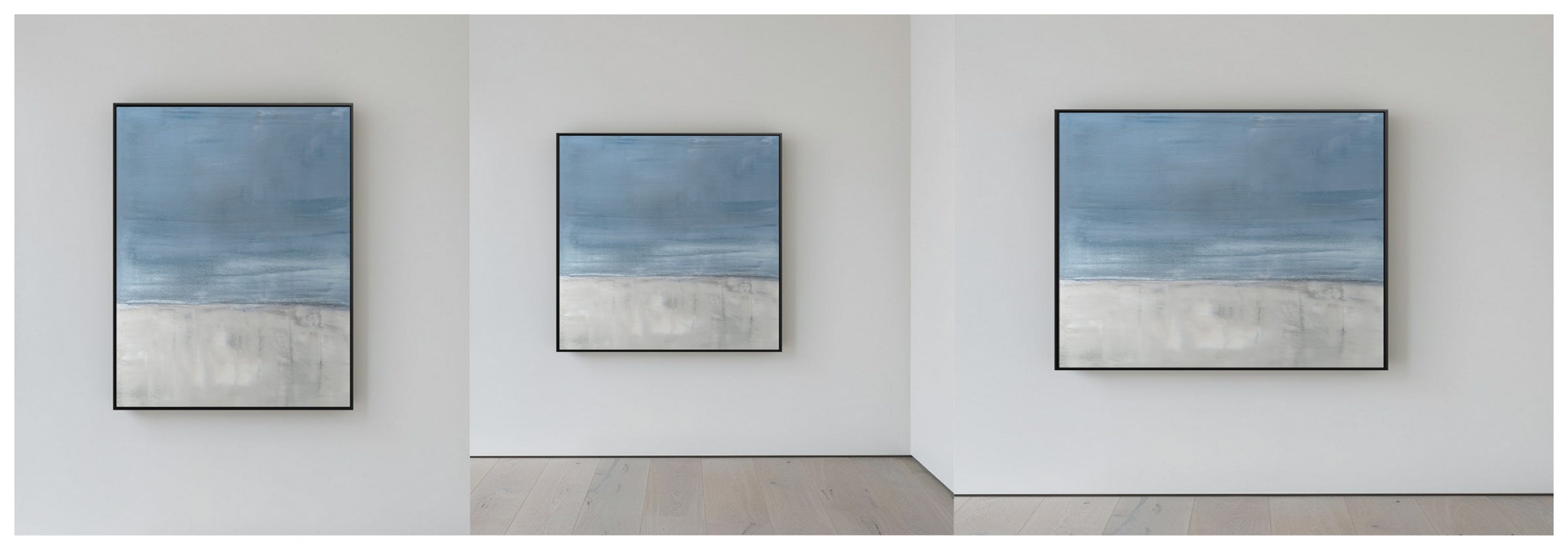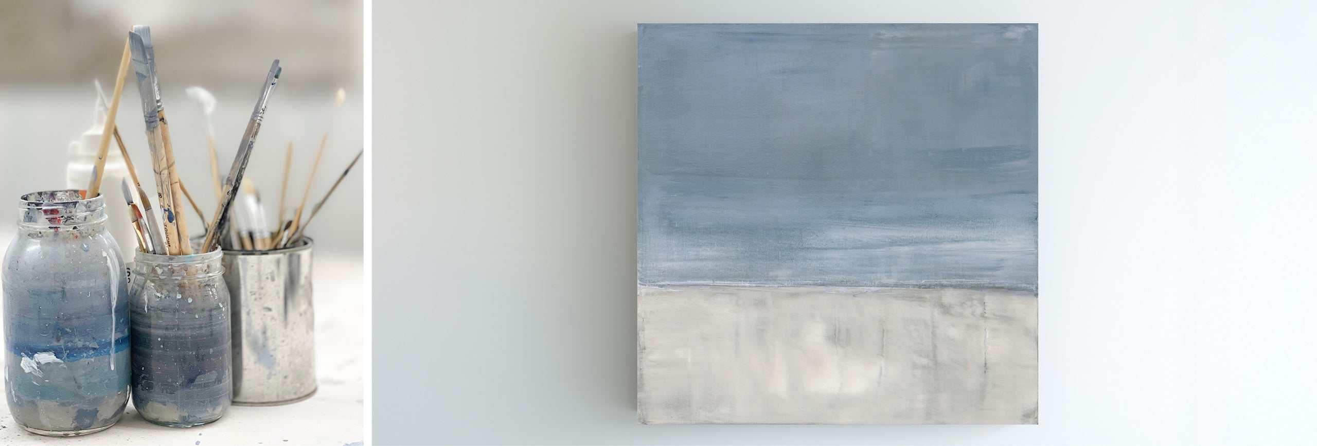 An abstract landscape in soft periwinkles. The Collection offers the painting in several options, from the canvas basics in square, horizontal, and vertical formats, to canvas sets and a narrow adaptation in a range of sizes. Additional customization is available as a hand-finished mixed media canvas.