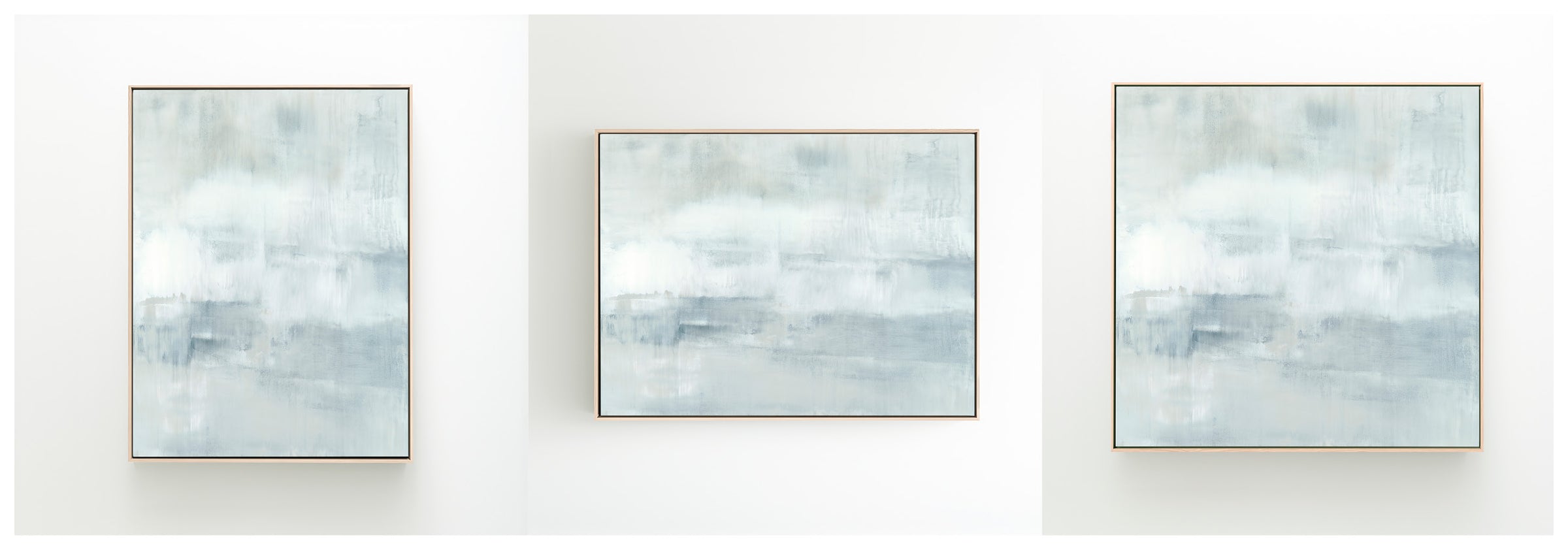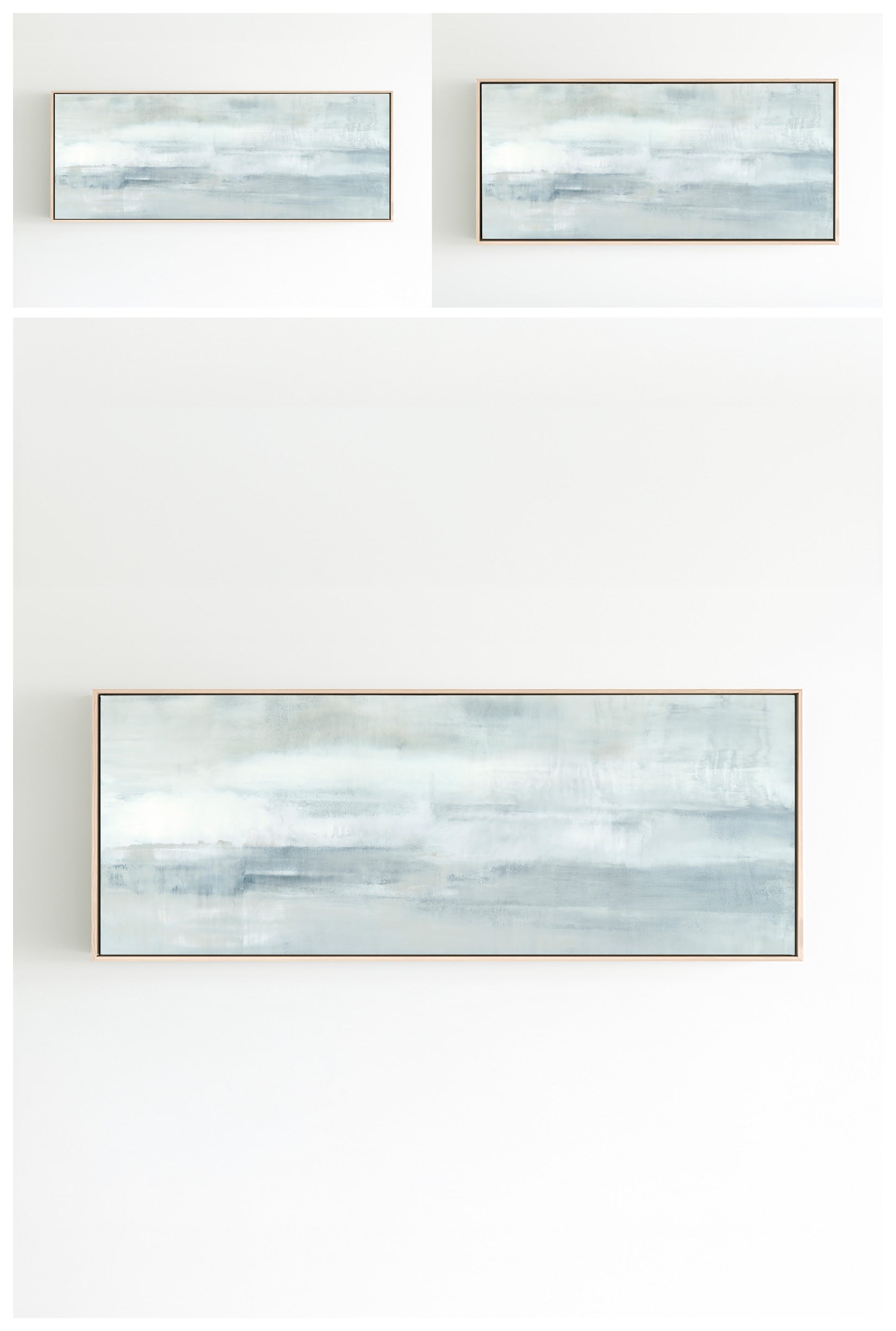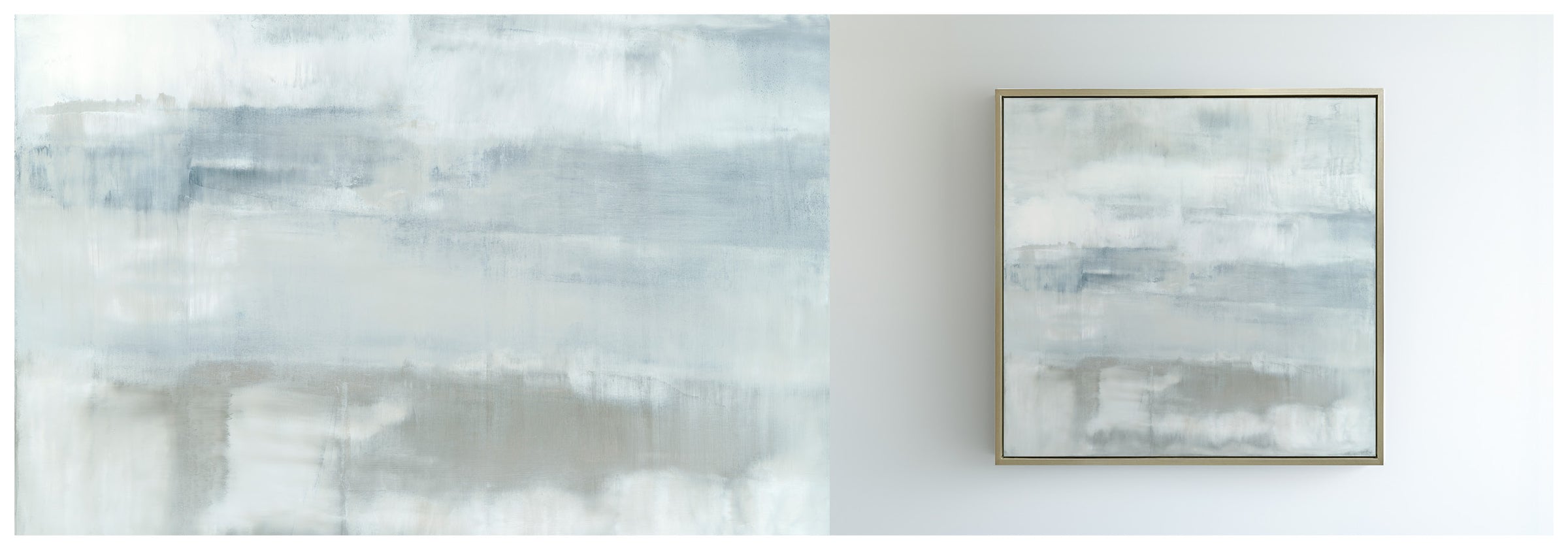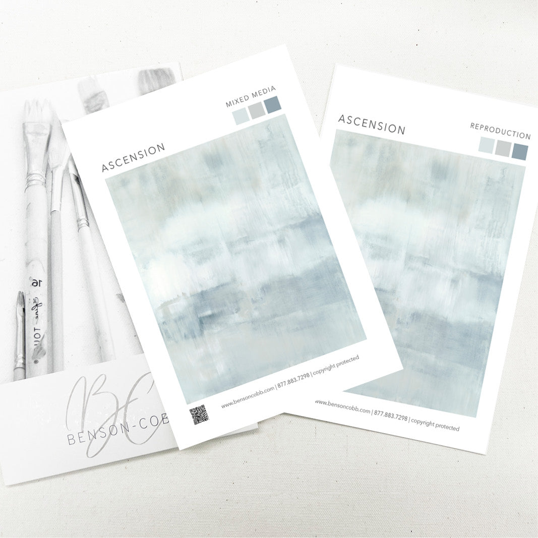 Minty blues and whites with undertones of grays, the composition has an elevated feeling of motion. The Collection offers the work in many forms as a reproduction. The Canvas Basics format the work in square, horizontal, and vertical canvases. The Large Canvases offer our most impactful sizes. The Canvas Sets extend the painting across multiple canvases as a diptych or triptych. The Narrow Canvas is a great solution for hard to fill spaces, available in a range of sizes. Additional sizing is available as a hand-finished and signed mixed media canvas.