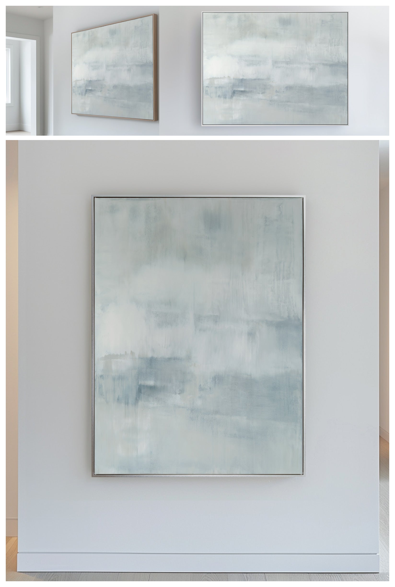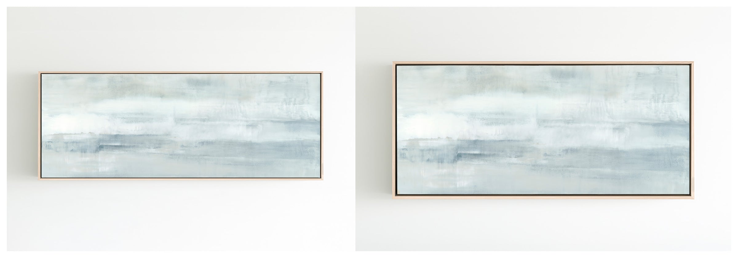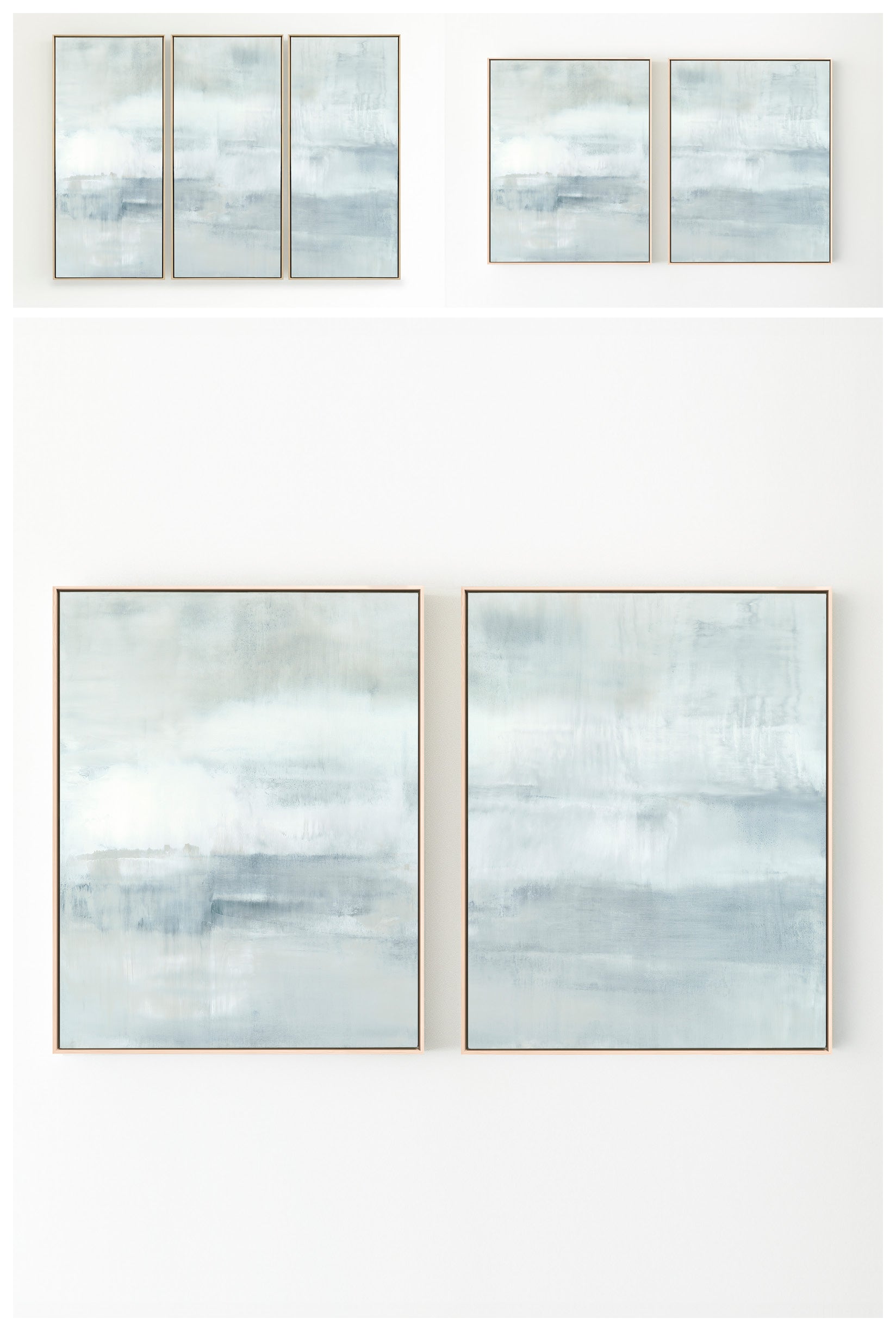 Minty blues and whites with undertones of grays, the composition has an elevated feeling of motion. The Collection offers the work in many forms as a reproduction. The Canvas Basics format the work in square, horizontal, and vertical canvases. The Large Canvases offer our most impactful sizes. The Canvas Sets extend the painting across multiple canvases as a diptych or triptych. The Narrow Canvas is a great solution for hard to fill spaces, available in a range of sizes. Additional sizing is available as a hand-finished and signed mixed media canvas.