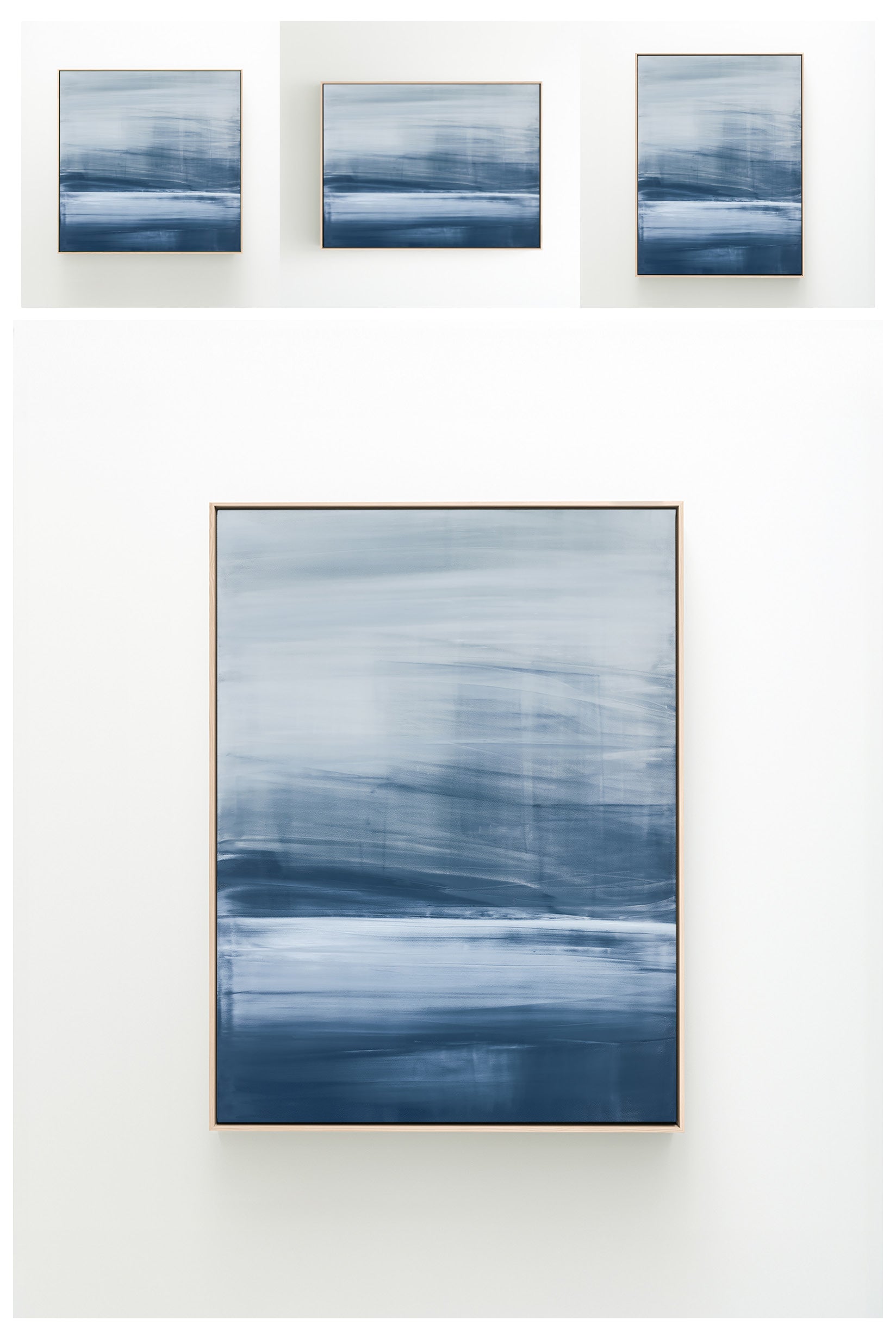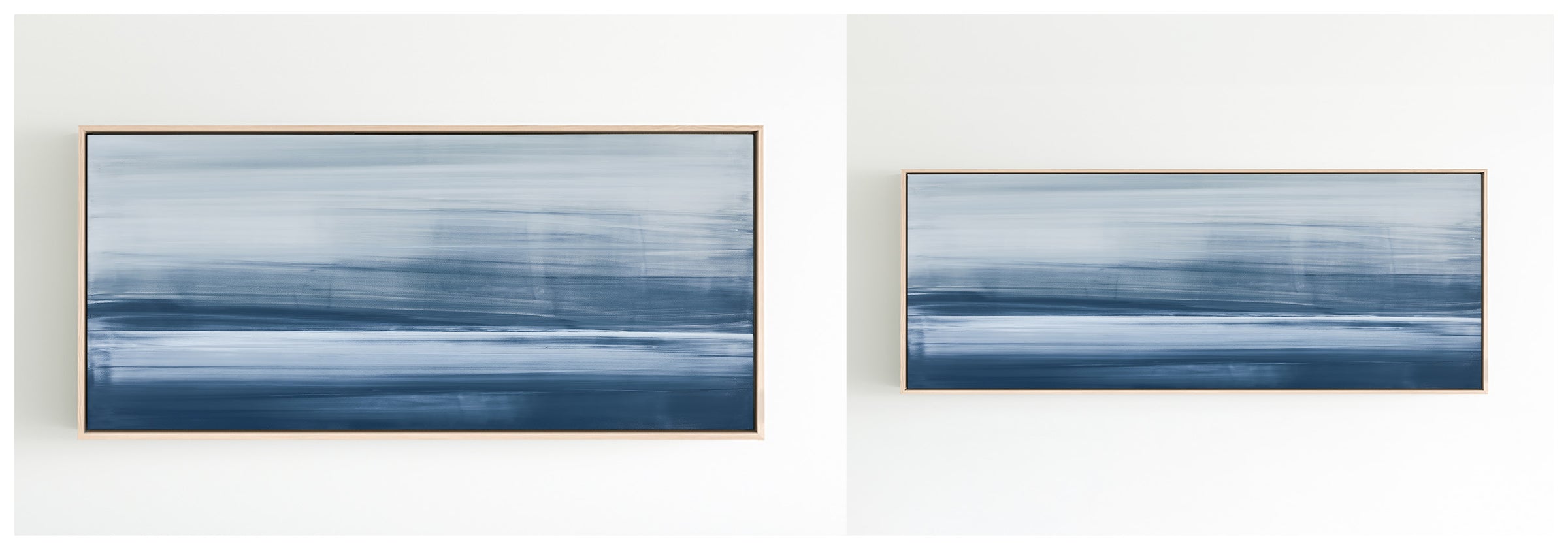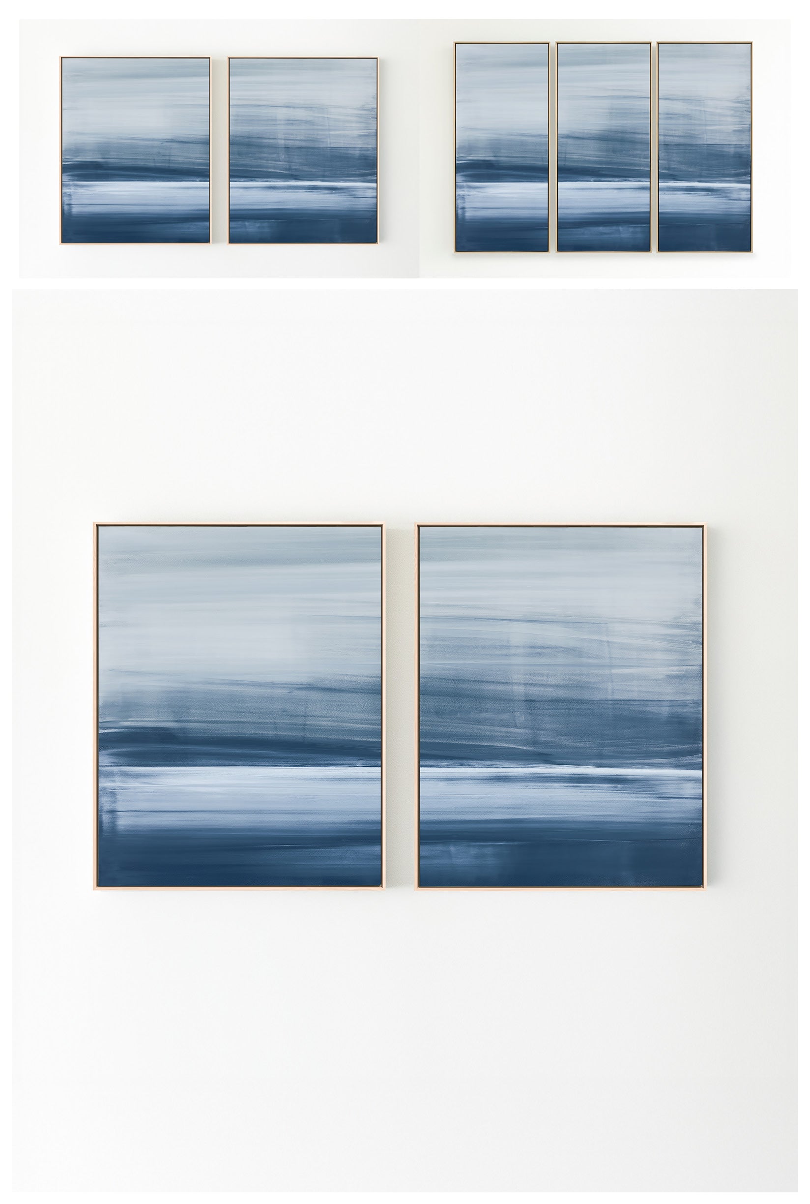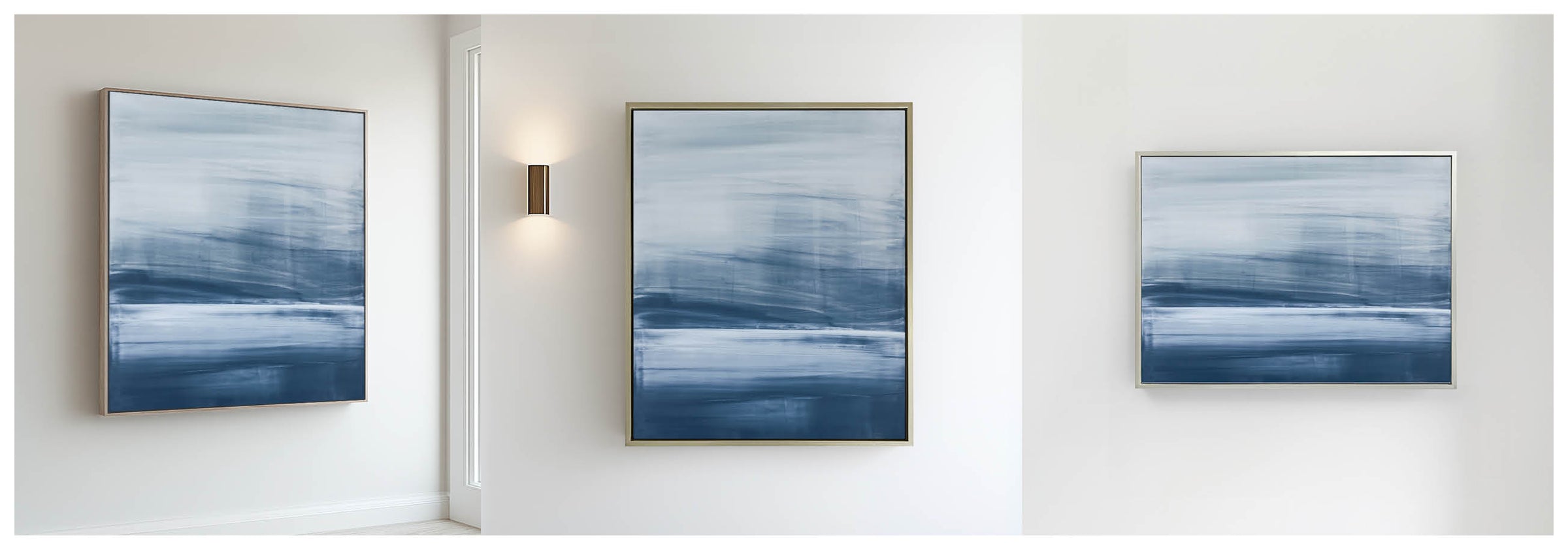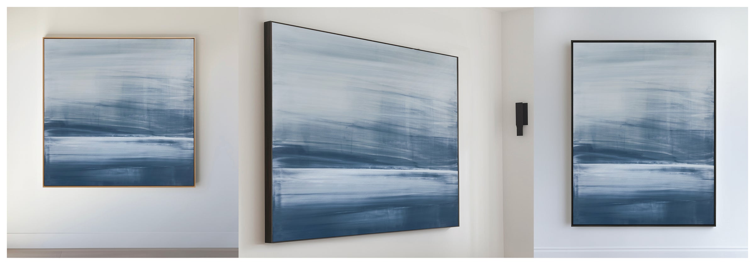 Deep navy blues interlaced in a rhythmic flow. Coastal Threads emphasizes interplay between stillness and action. The contrast between the dark navy background and the vibrant, dynamic lines emphasizes a tension between calm and motion, inviting viewers to explore the painting’s intricate pathways and experience the interplay of stillness and action. The Coastal Threads Collection offers the work in various forms. The Canvas Basics format the work in square, horizontal, and vertical canvases. The Large Canvases offer our most impactful sizes. The Canvas Sets extend the painting across multiple canvases as a diptych or triptych. The Narrow Canvas is a great solution for hard to fill spaces, available in a range of sizes. Additional sizing is available as a hand-finished and signed mixed media canvas.
