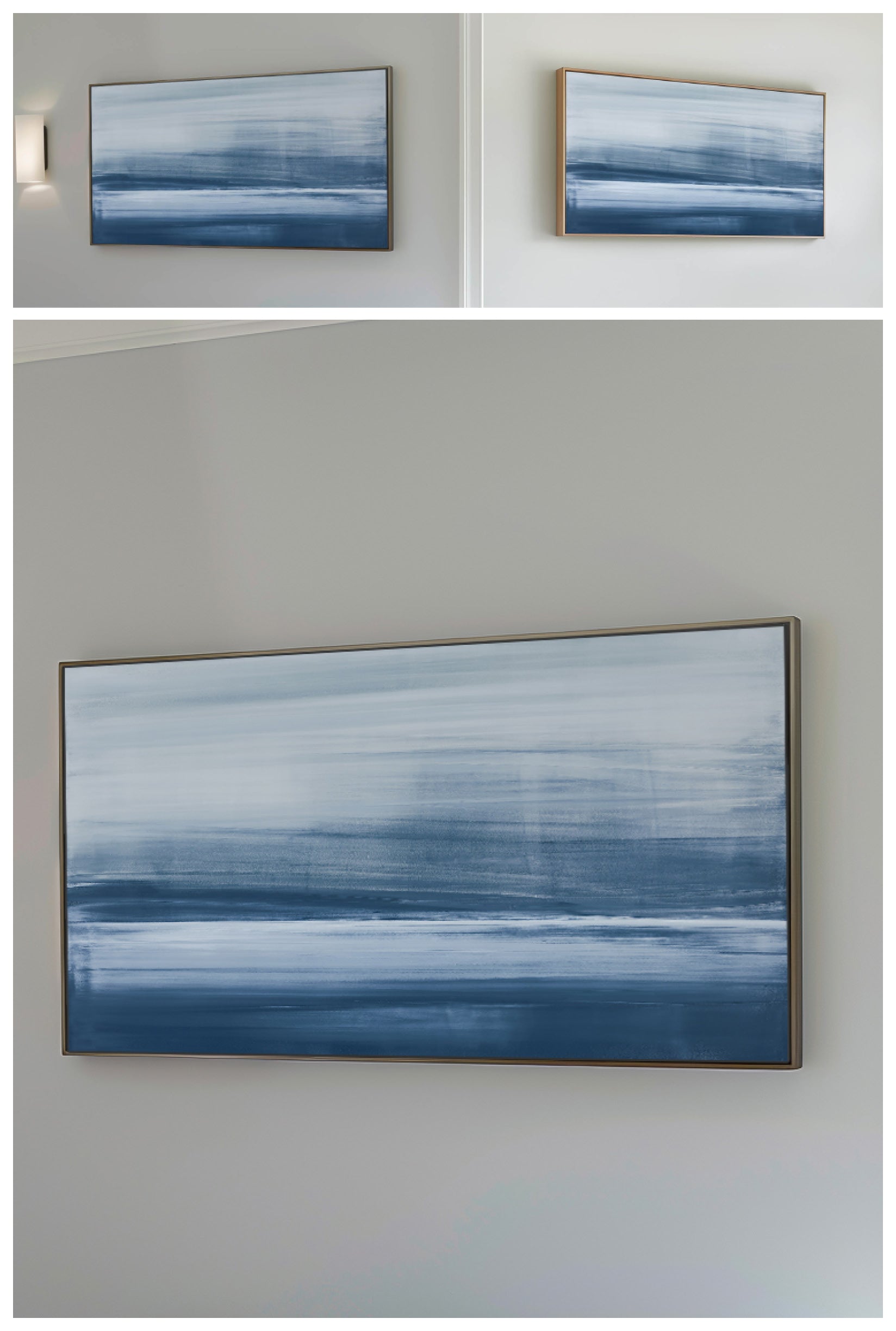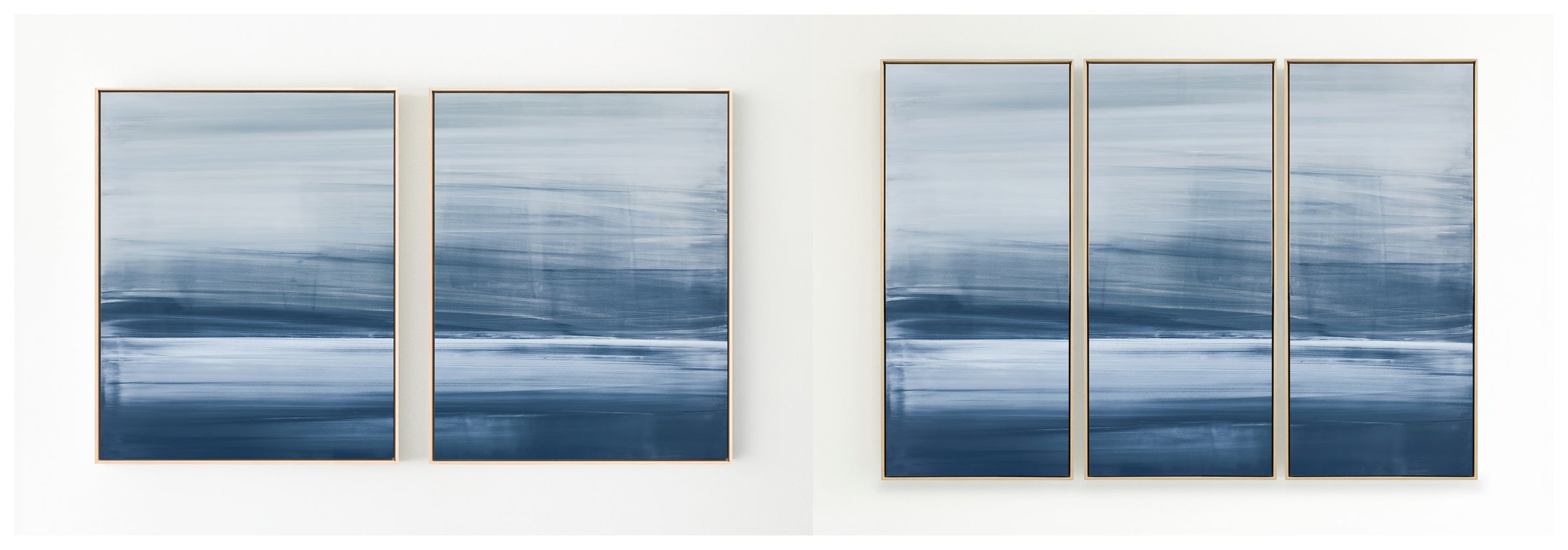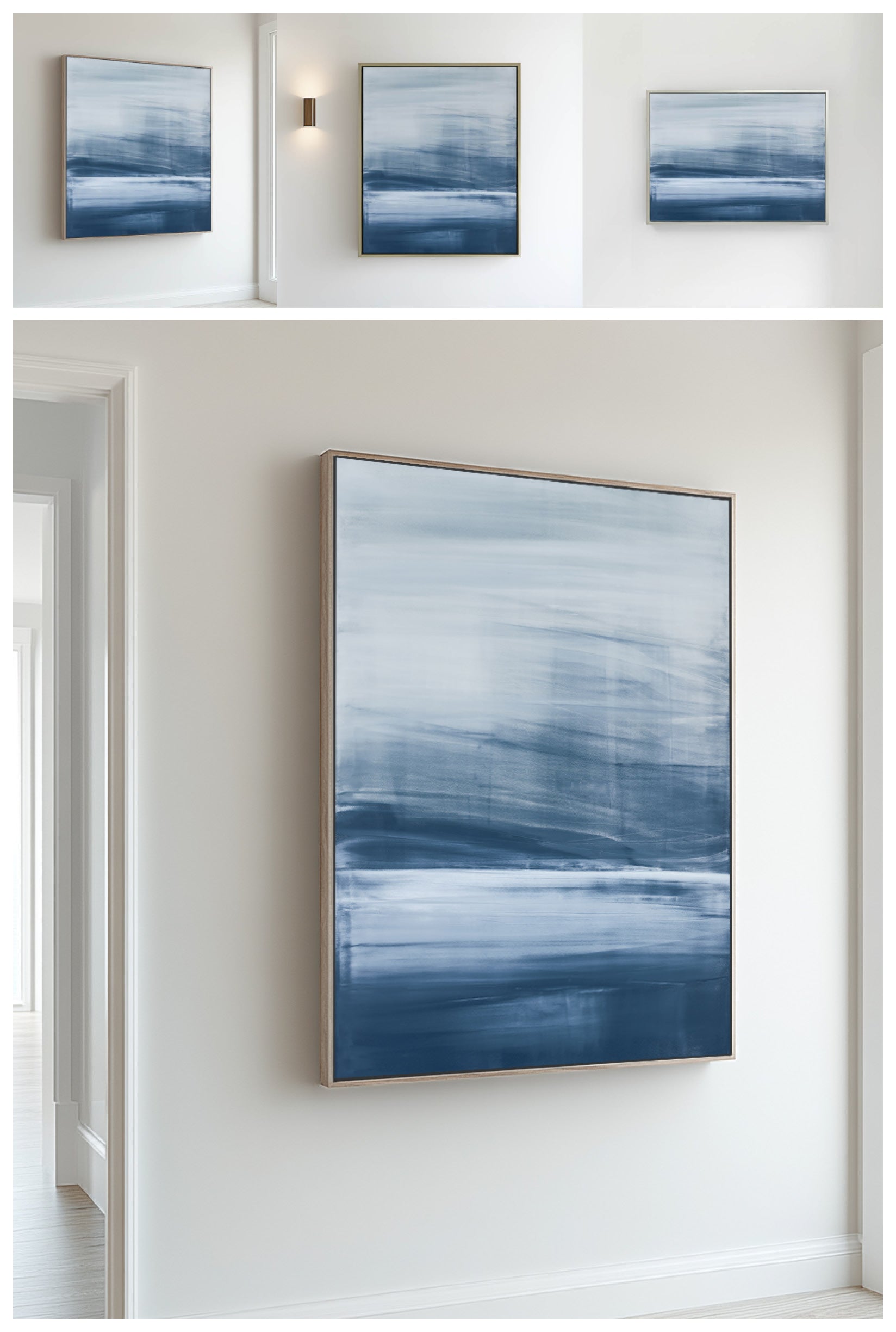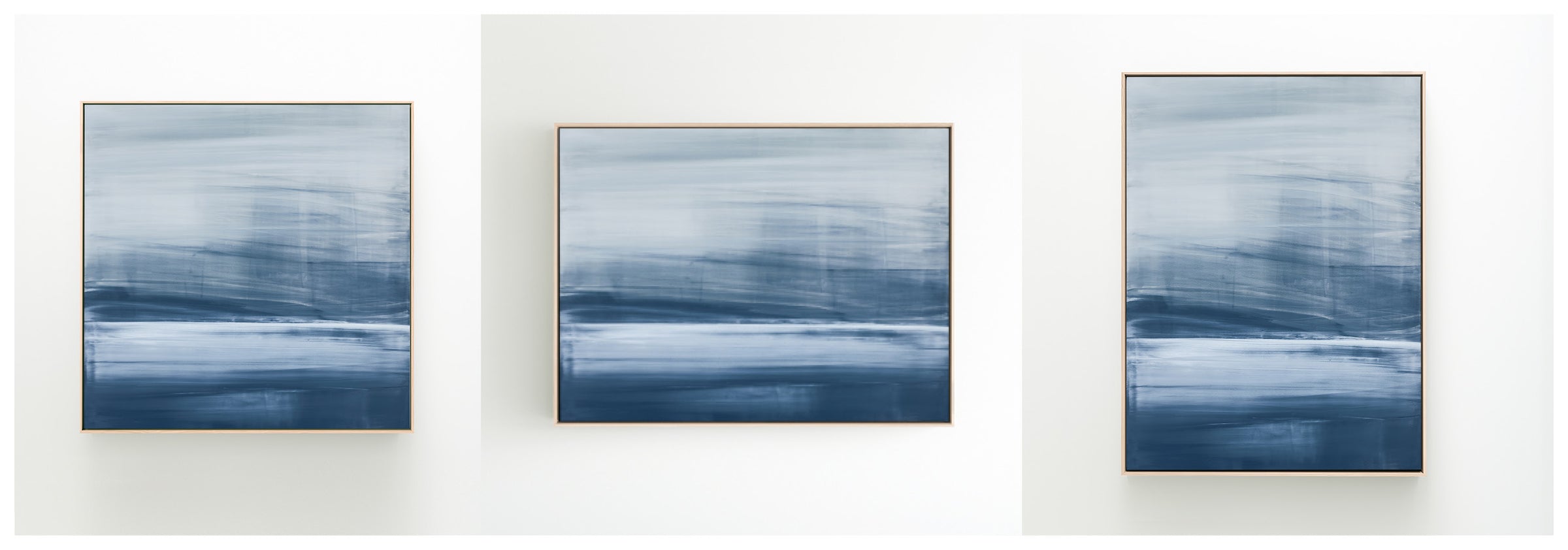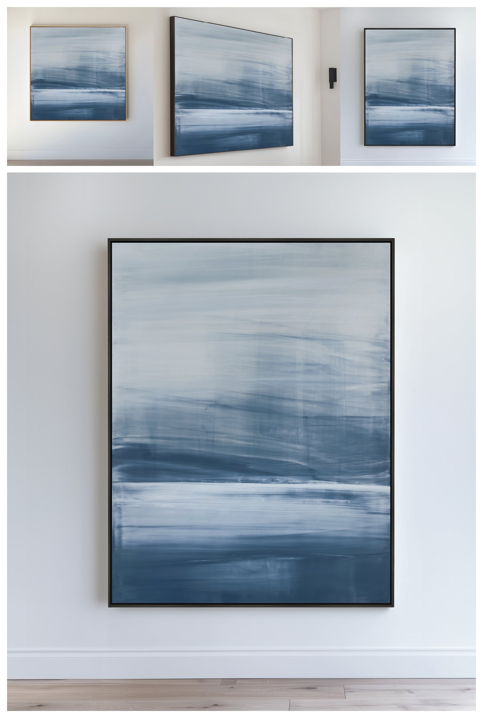 Deep navy blues interlaced in a rhythmic flow. Coastal Threads emphasizes interplay between stillness and action. The contrast between the dark navy background and the vibrant, dynamic lines emphasizes a tension between calm and motion, inviting viewers to explore the painting’s intricate pathways and experience the interplay of stillness and action. The Coastal Threads Collection offers the work in various forms. The Canvas Basics format the work in square, horizontal, and vertical canvases. The Large Canvases offer our most impactful sizes. The Canvas Sets extend the painting across multiple canvases as a diptych or triptych. The Narrow Canvas is a great solution for hard to fill spaces, available in a range of sizes. Additional sizing is available as a hand-finished and signed mixed media canvas.