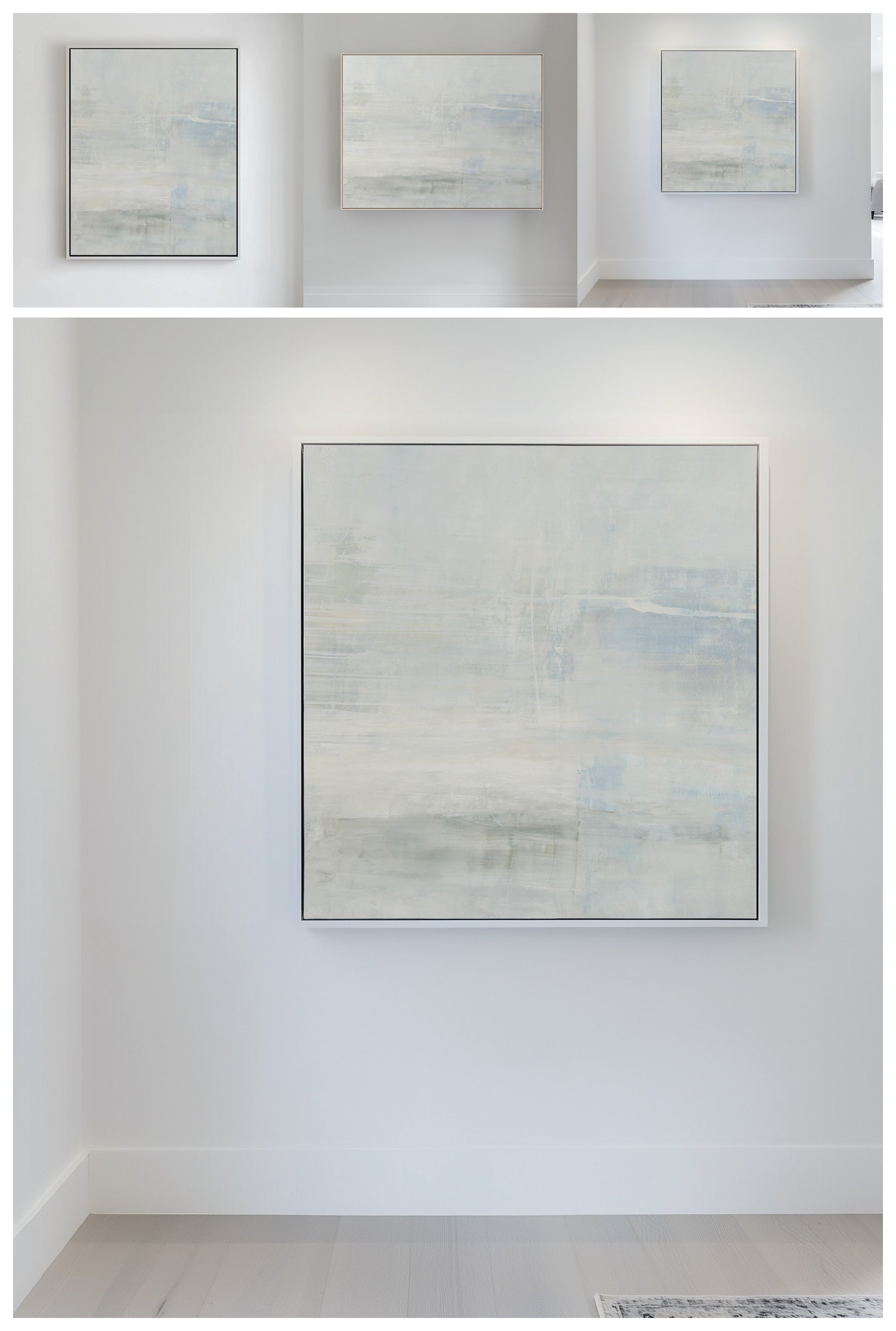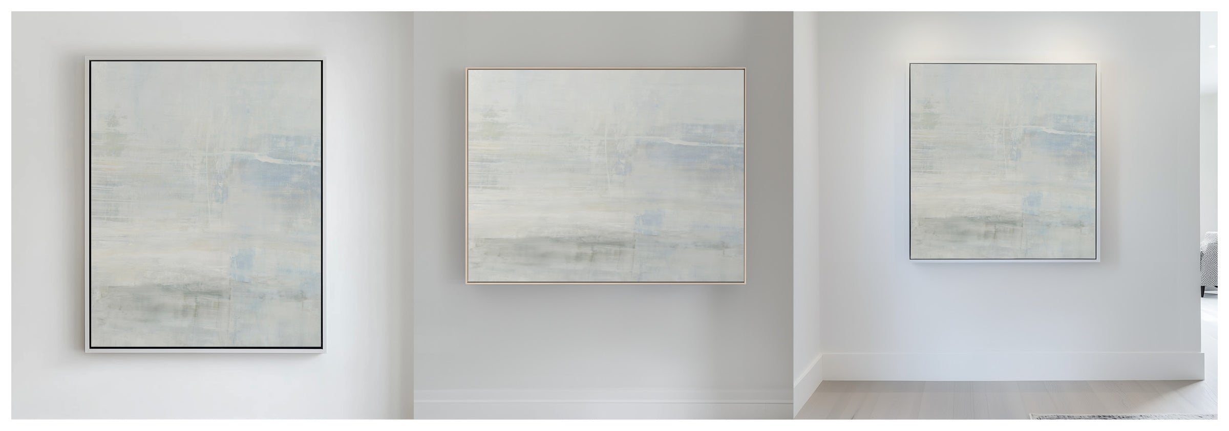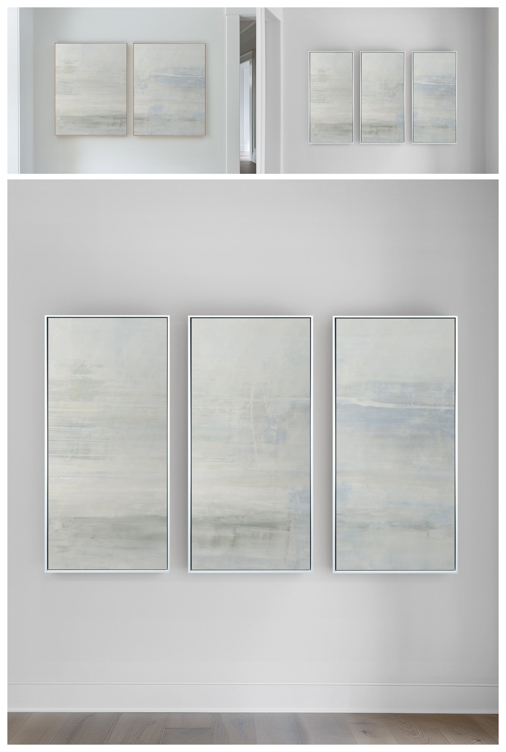 Inspired by a natural landscape, soothing color palette of blue-gray, periwinkle blue, white, sage green, and pale yellow. Available as a reproduction and as a signed mixed media canvas in several size and adaptation options.