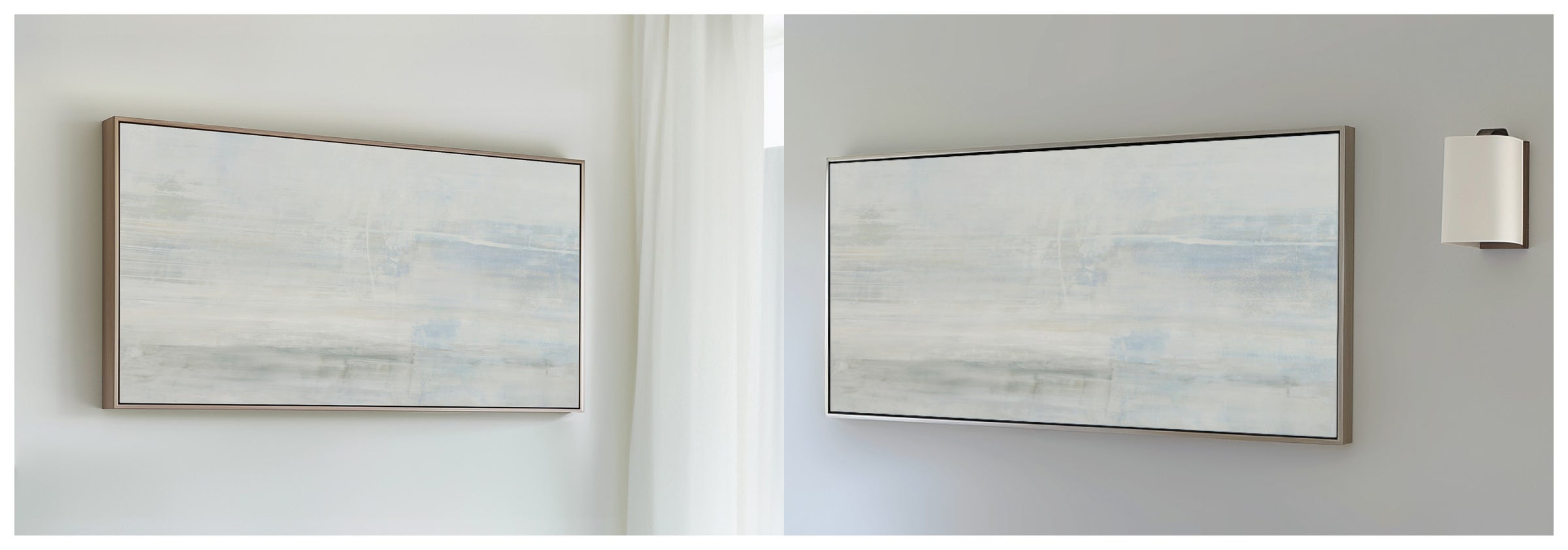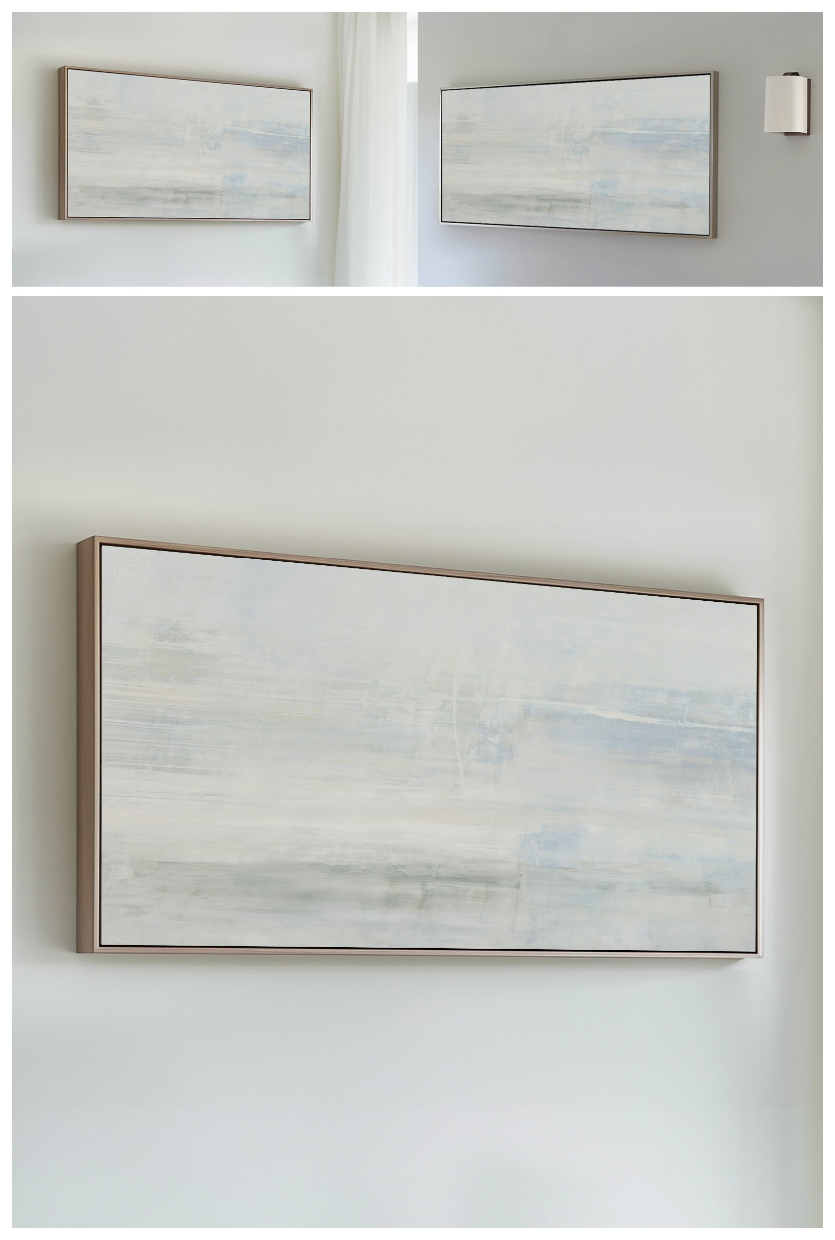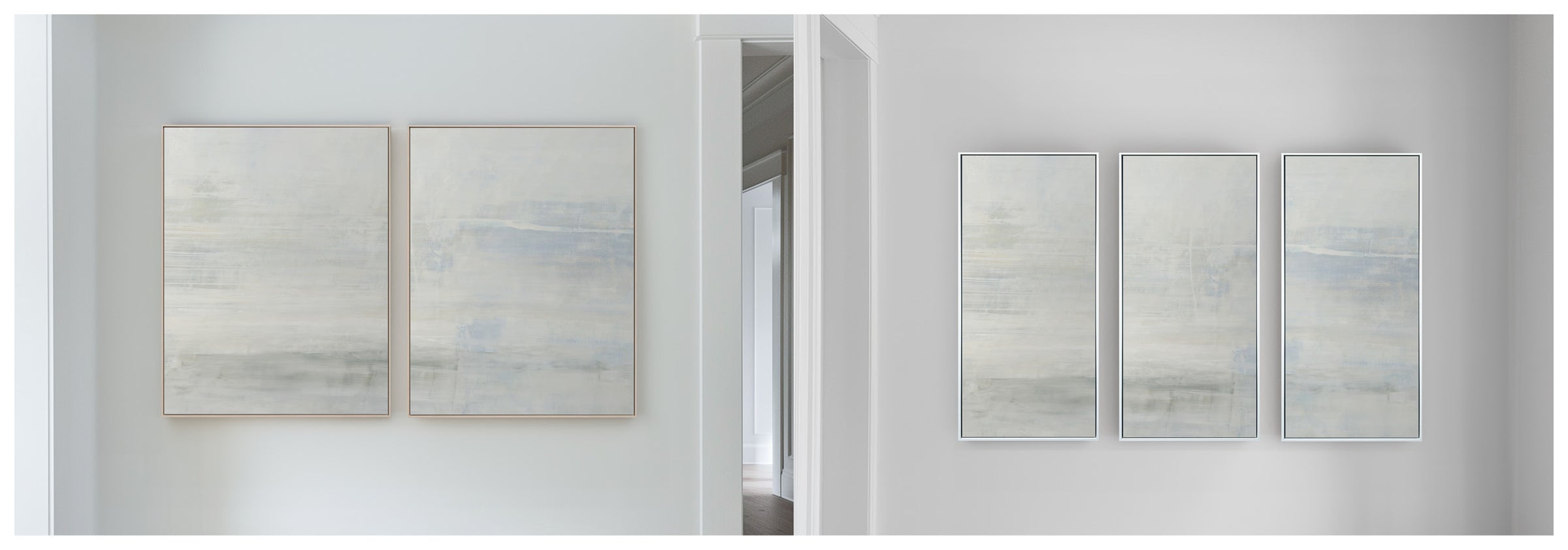 Inspired by a natural landscape, soothing color palette of blue-gray, periwinkle blue, white, sage green, and pale yellow. Available as a reproduction and as a signed mixed media canvas in several size and adaptation options.