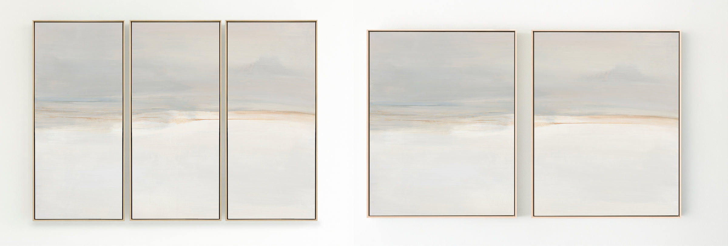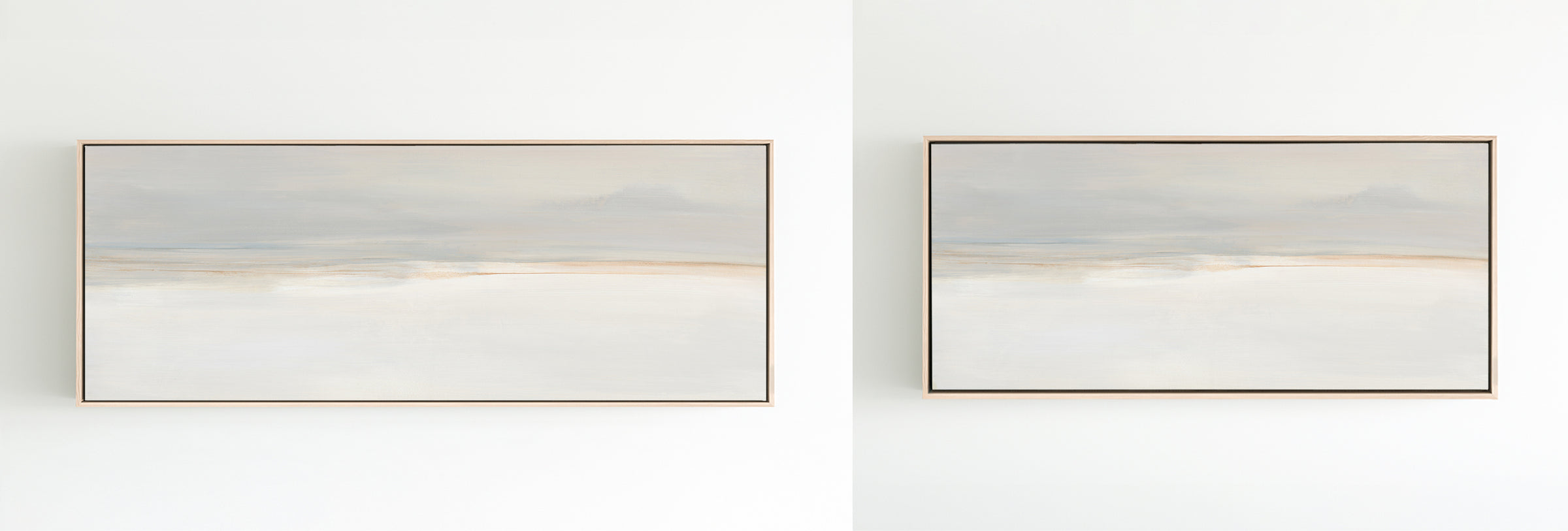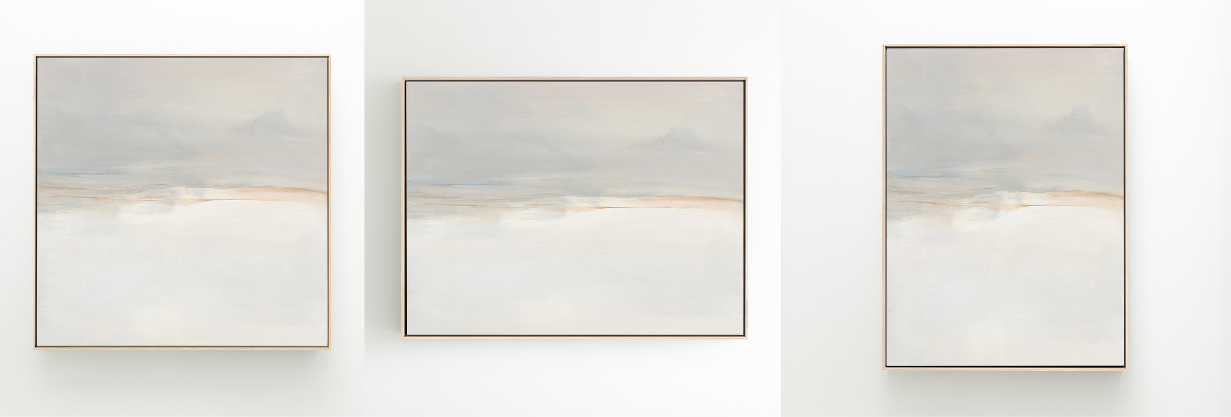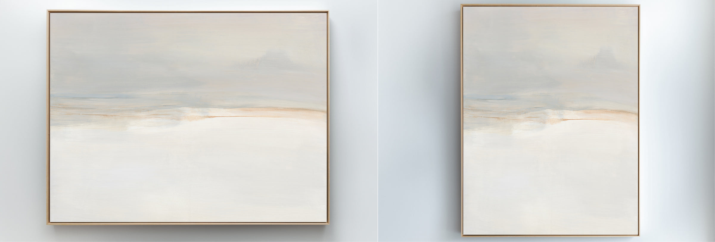 Companion to Endless Horizon, the expansive landscape is inverted to reveal an alternative focus. Hints of pale blue tones accent the horizon. Blues and whites create dramatic contrast within the horizon. The Endless Sky Collection offers the work in various forms. The Canvas Basics format the work in square, horizontal, and vertical canvases. The Large Canvases offer our most impactful sizes. The Canvas Sets extend the painting across multiple canvases as a diptych or triptych. The Narrow Canvas is a great solution for hard to fill spaces, available in a range of sizes. Additional sizing is available as a hand-finished and signed mixed media canvas.