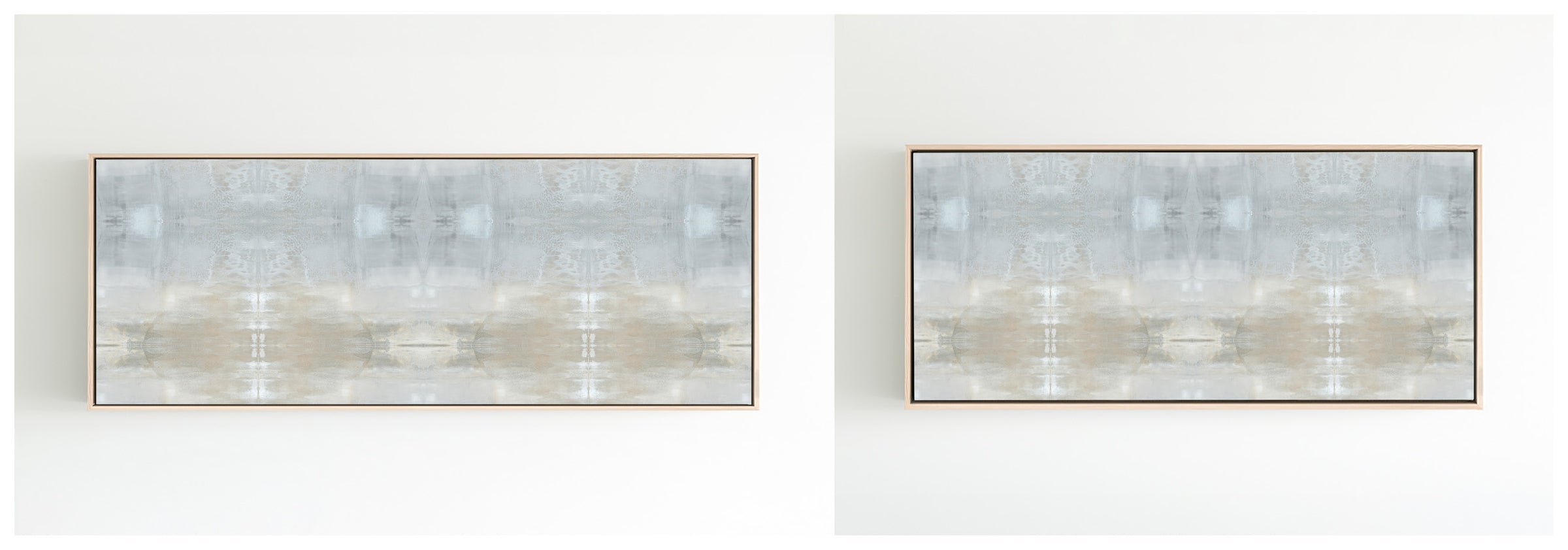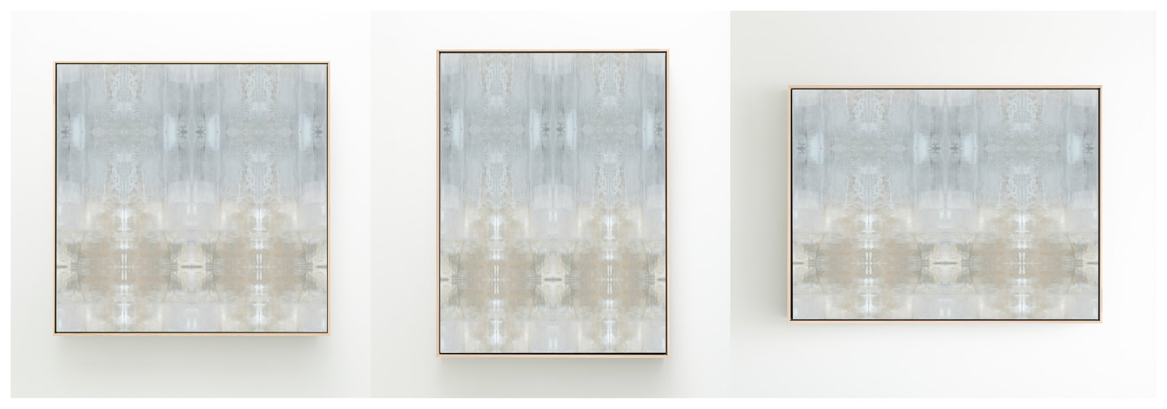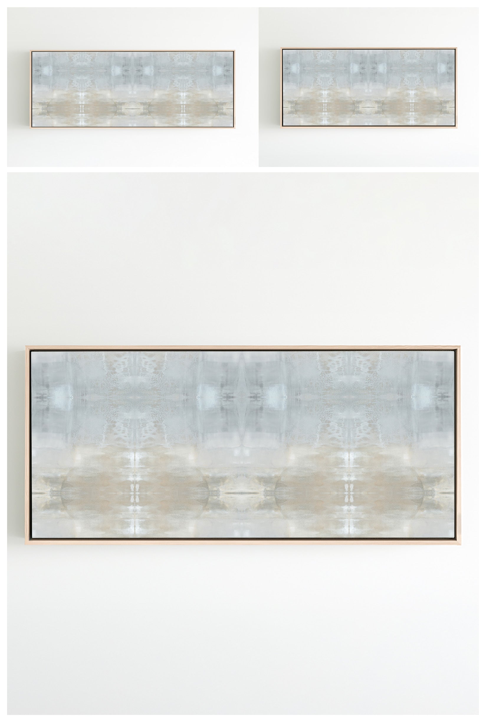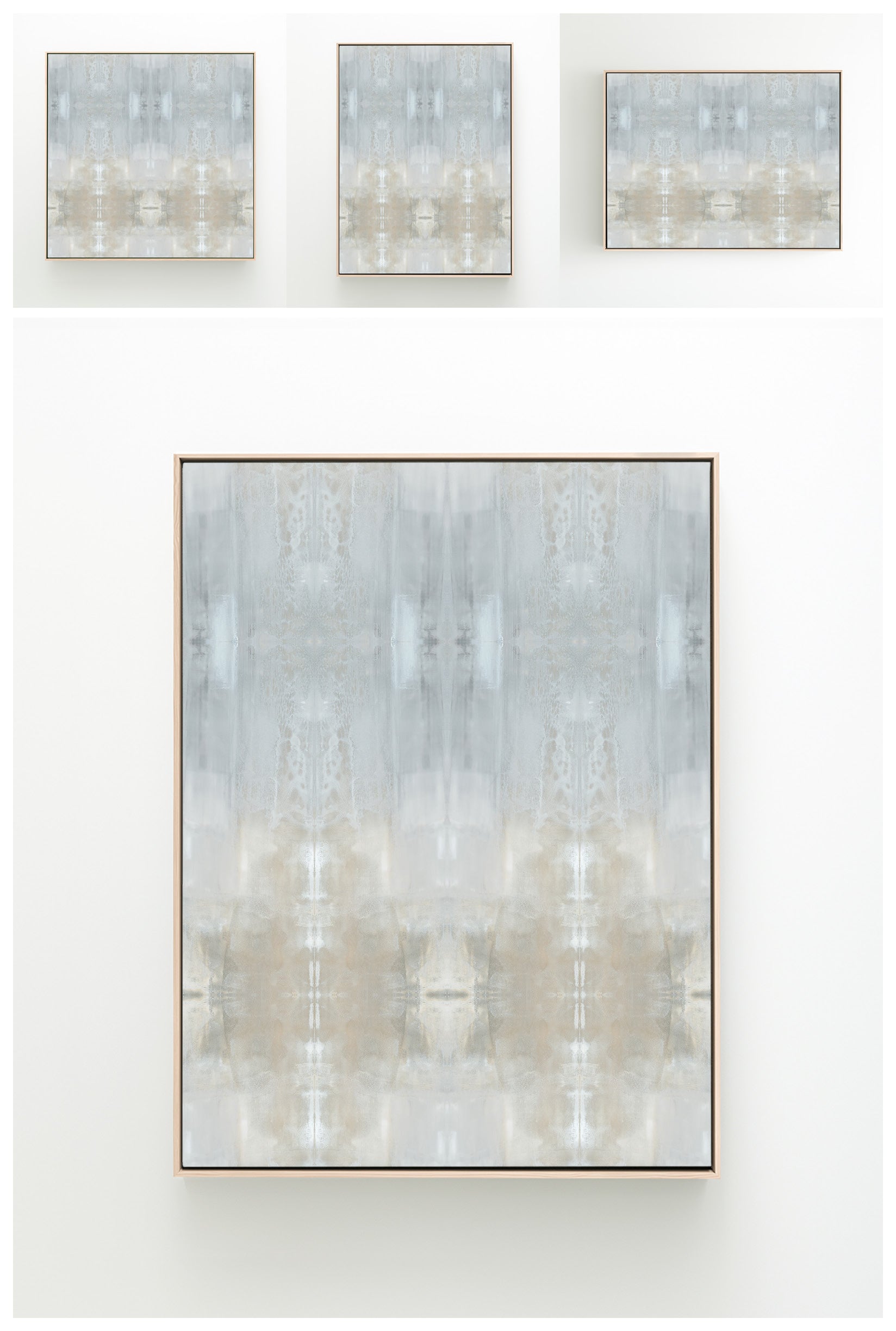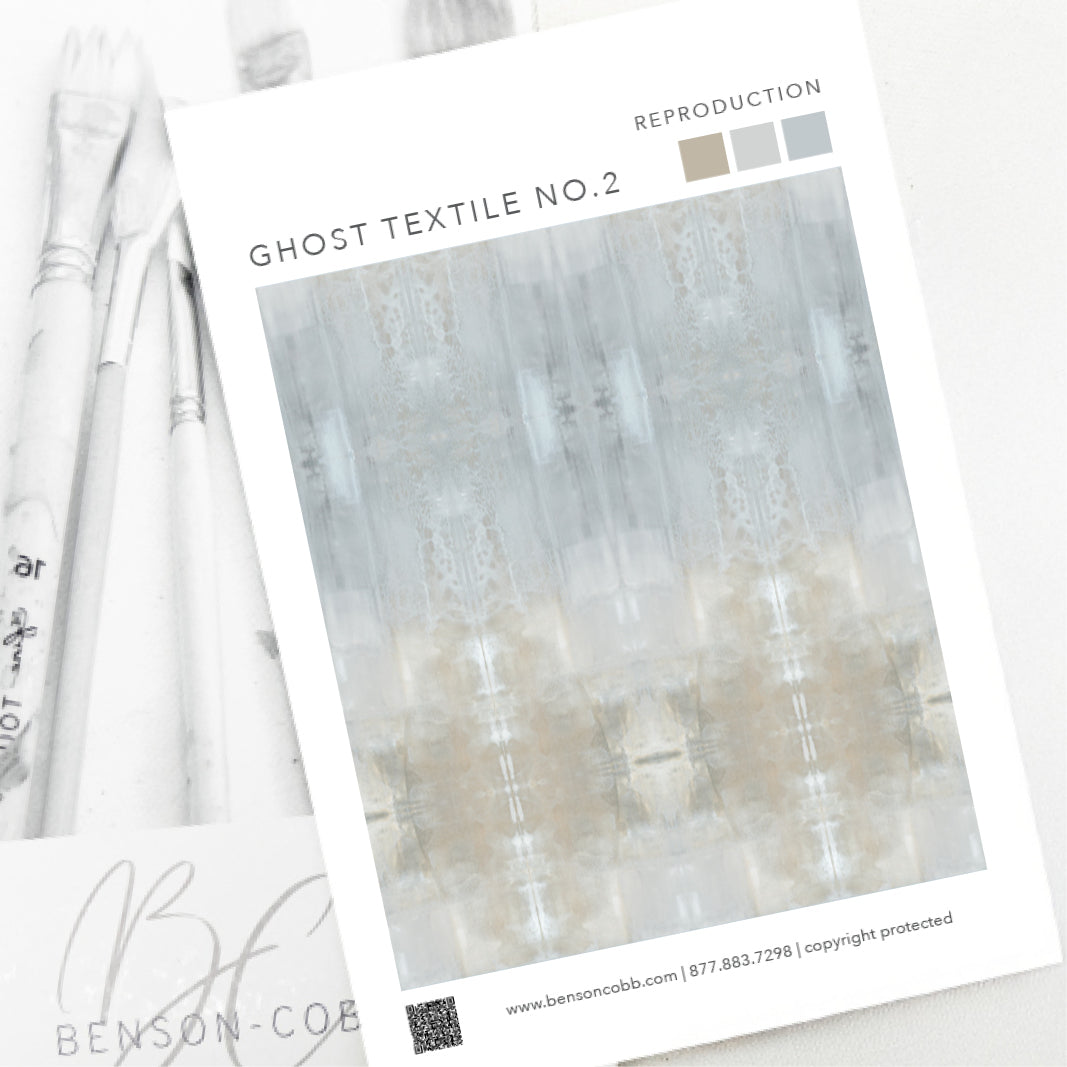 Ghost Textile is one of the first textile works printed in 2013. The artwork is created with layers from the original painting, Slated. The composition is an intricate pattern using the softer taupe and gray brush strokes. The collection offers the work in several forms as a reproductions in a range of small to medium sizes. The Canvas Basics format the work in square, horizontal, and vertical canvases. The Narrow Canvas options are ideal for smaller spaces. Additional sizing is available as a hand-finished and signed mixed media canvas.