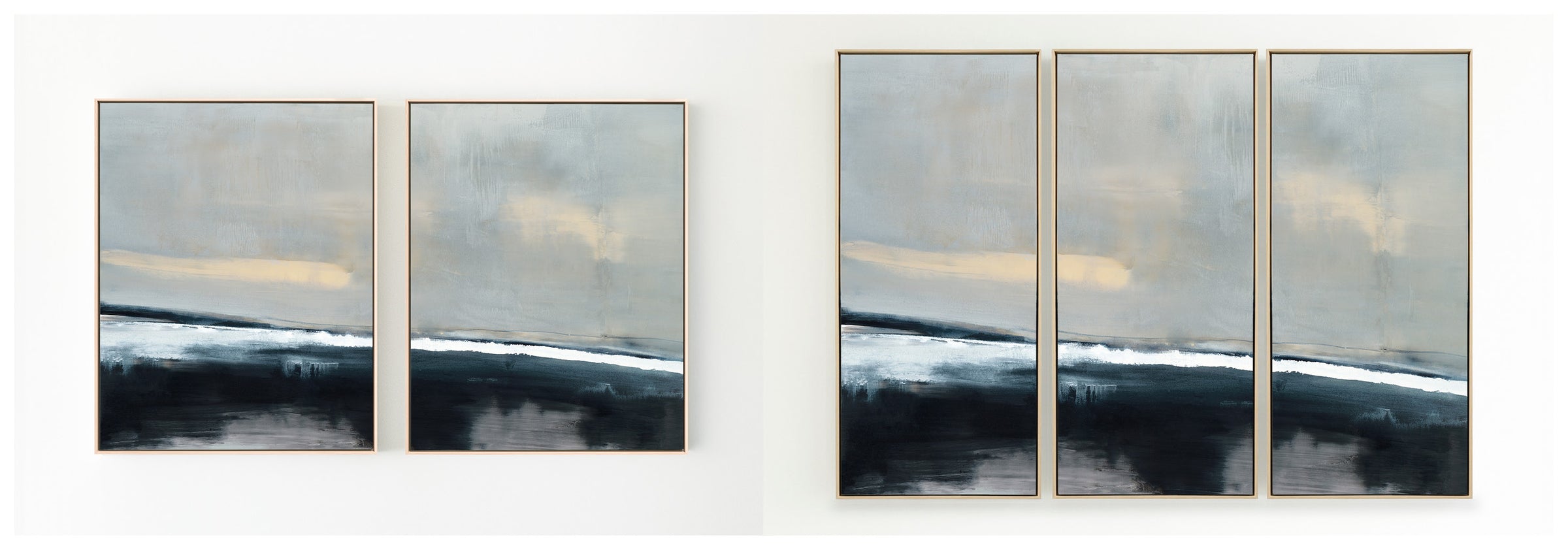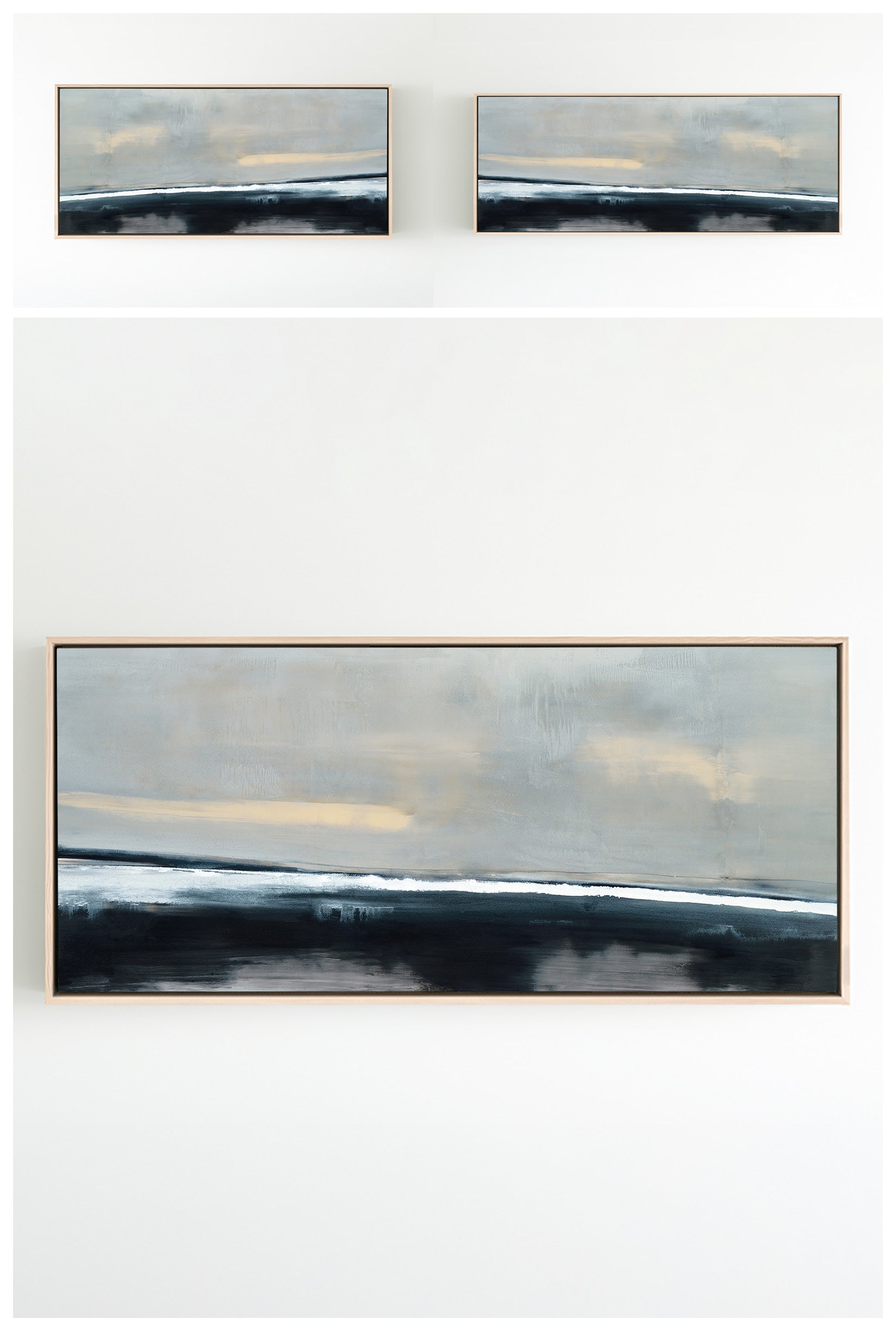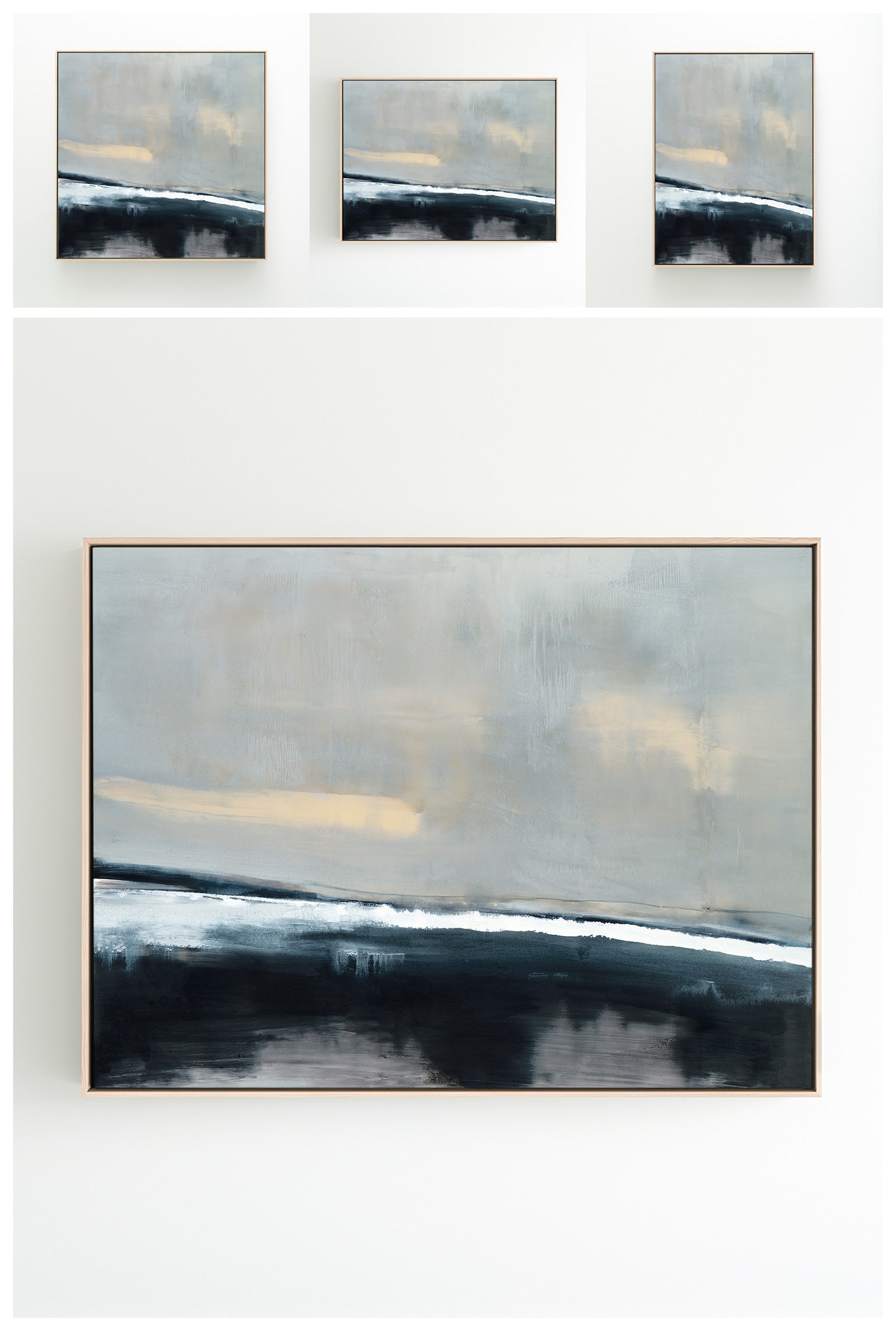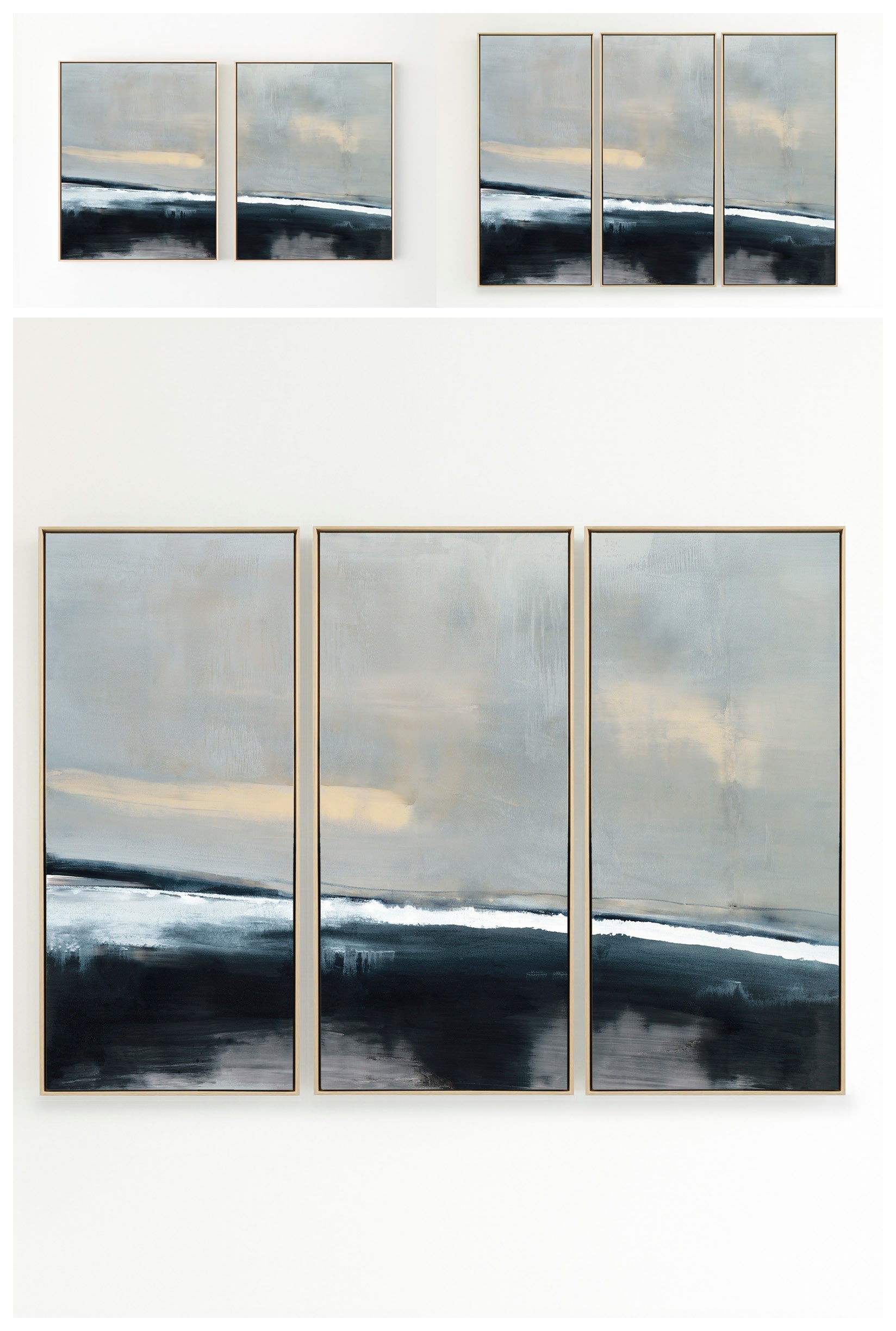 A nuance of the original painting, the soft gray version was released in 2022. The abstract landscape is bold and dramatic. The Collection offers the work in many forms, including the original canvas. Reproductions are offered in several formats.  The Canvas Basics format the work in square, horizontal, and vertical canvases. The Large Canvases offer our most impactful sizes. The Canvas Sets extend the painting across multiple canvases as a diptych or triptych. The Narrow Canvas is a great solution for hard to fill spaces, available in a range of sizes. Additional sizing is available as a hand-finished and signed mixed media canvas.