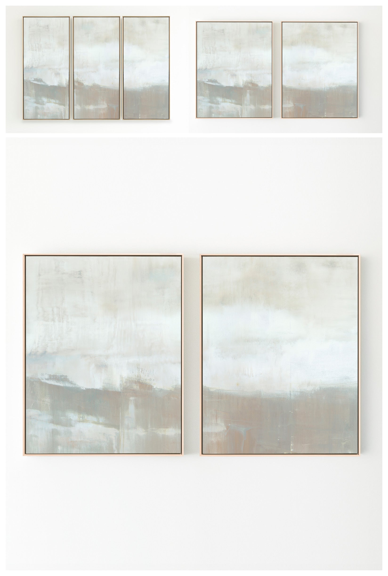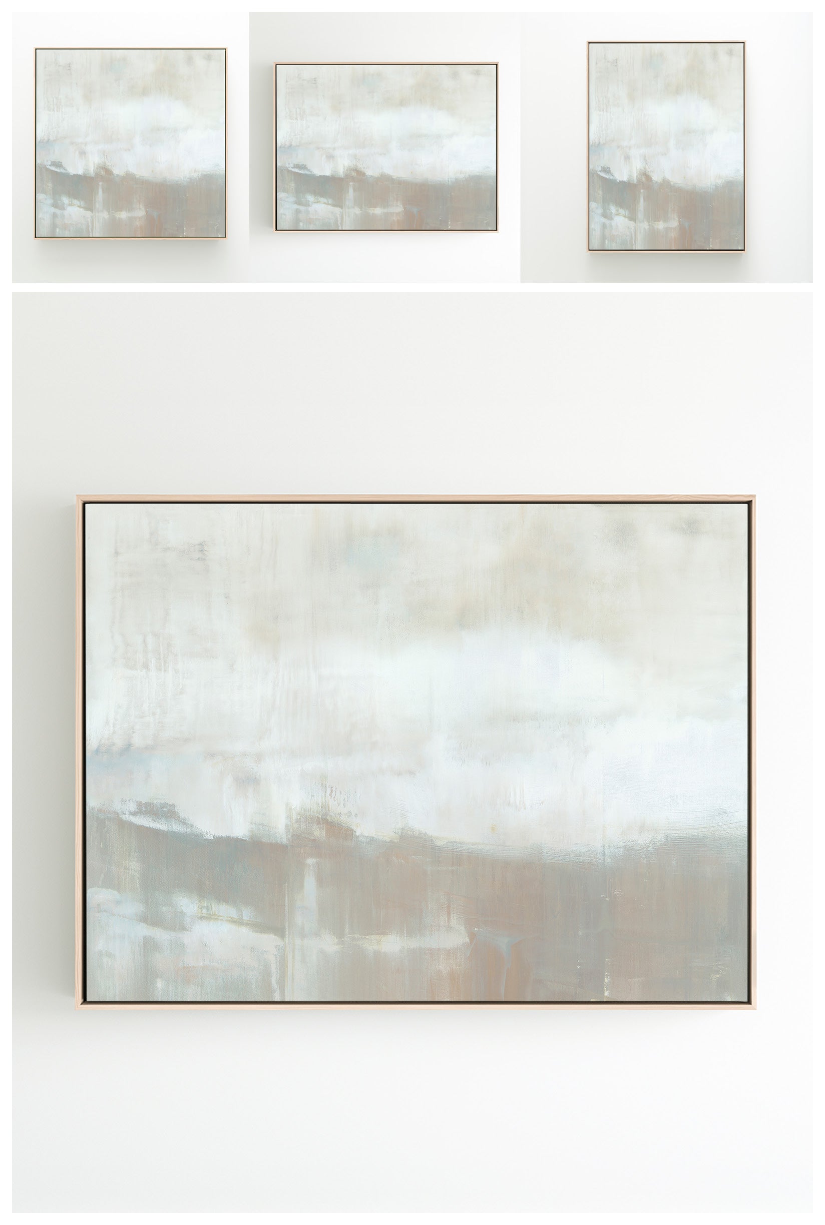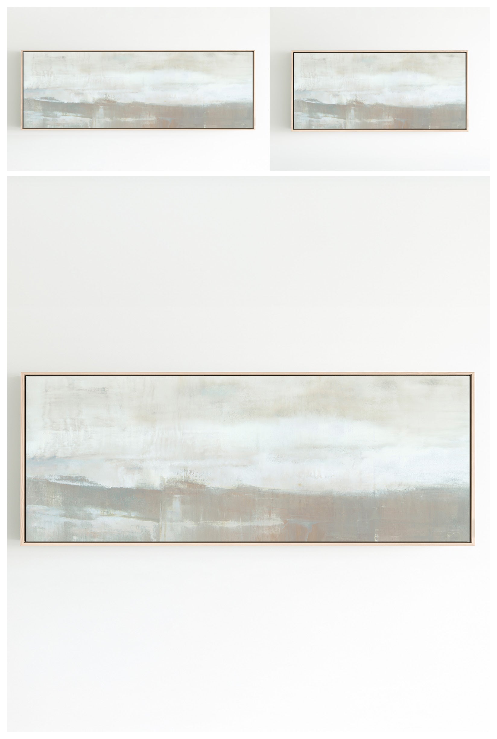 Soft taupes, creams and sage are layered to create a soft landscape. The Collection offers the range of options in various forms. The Canvas Basics format the work in square, horizontal, and vertical canvases. The Canvas Sets extend the painting across multiple canvases as a diptych or triptych. The Narrow Canvas is a great solution for hard to fill spaces, available in a range of sizes. Additional sizing is available as a hand-finished and signed mixed media canvas.