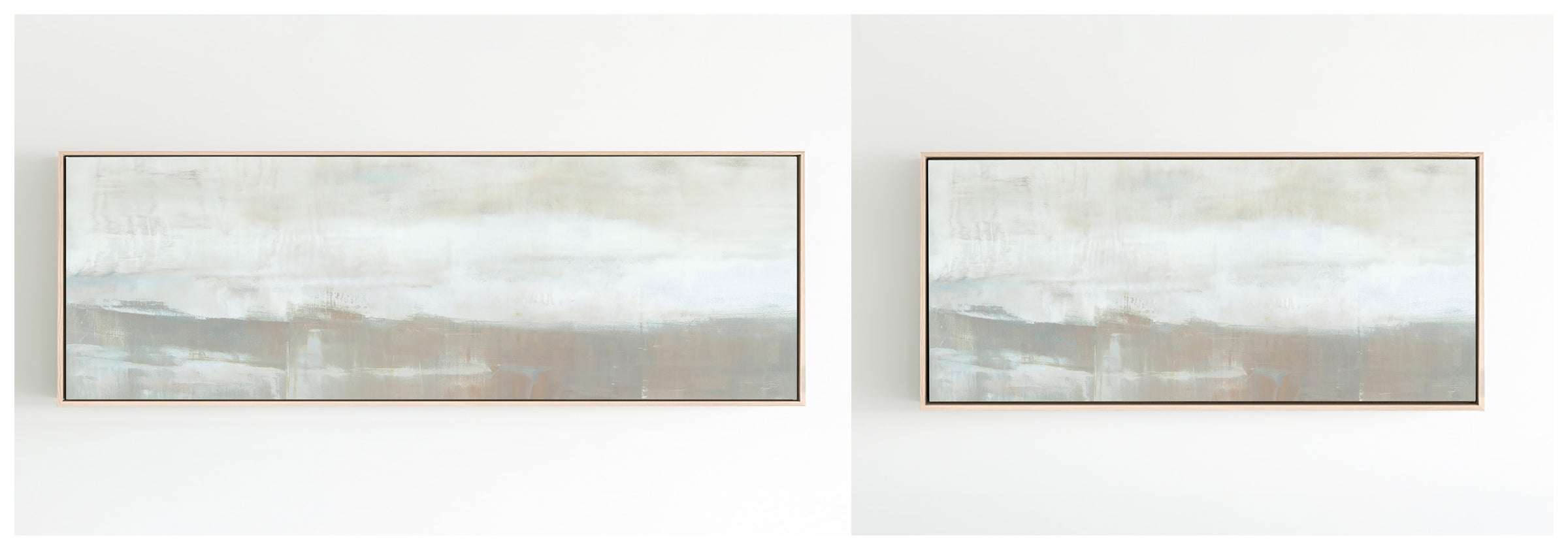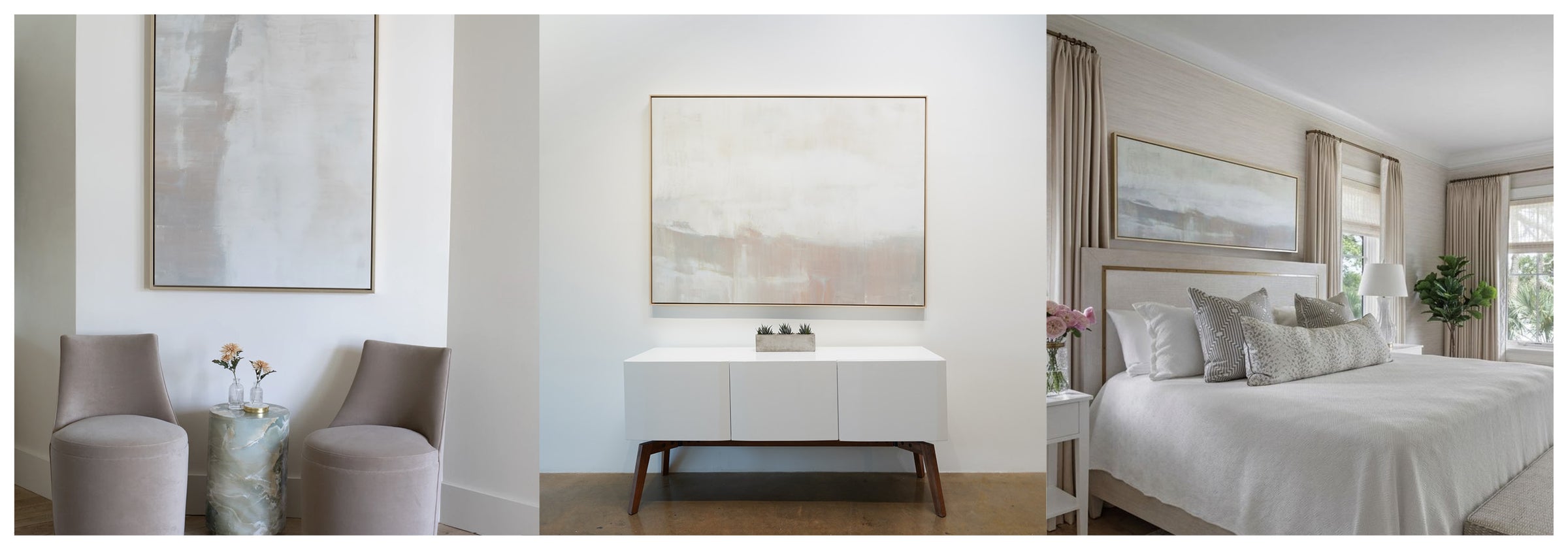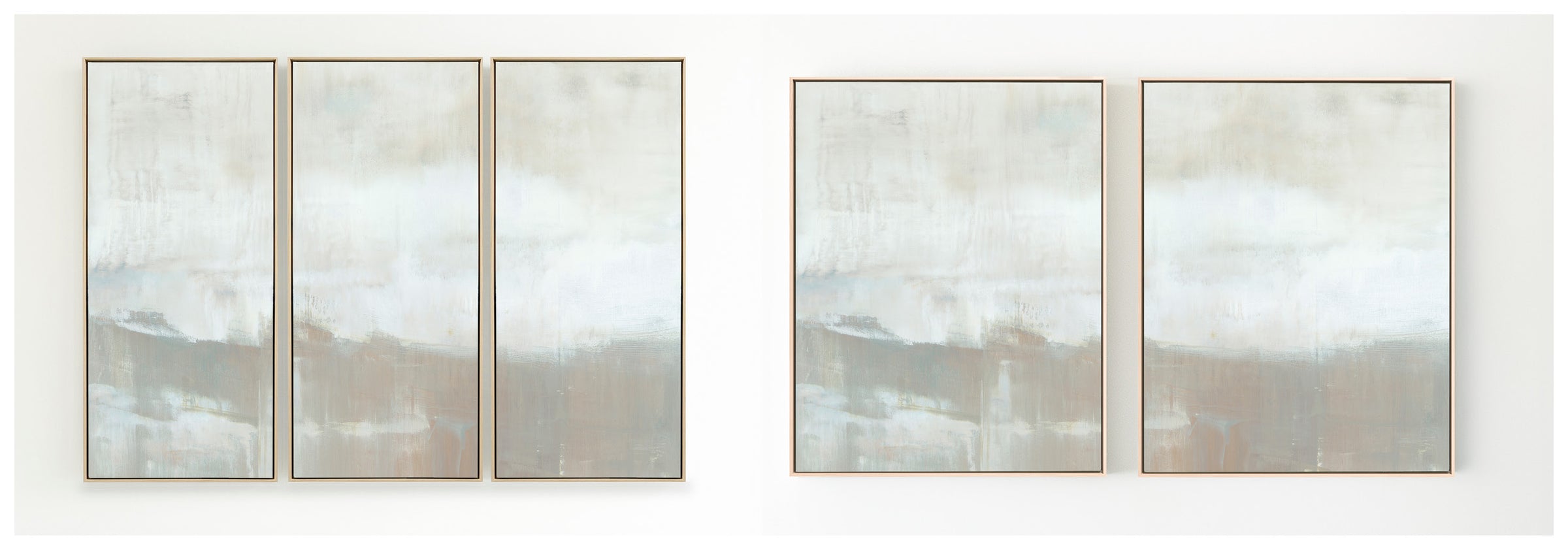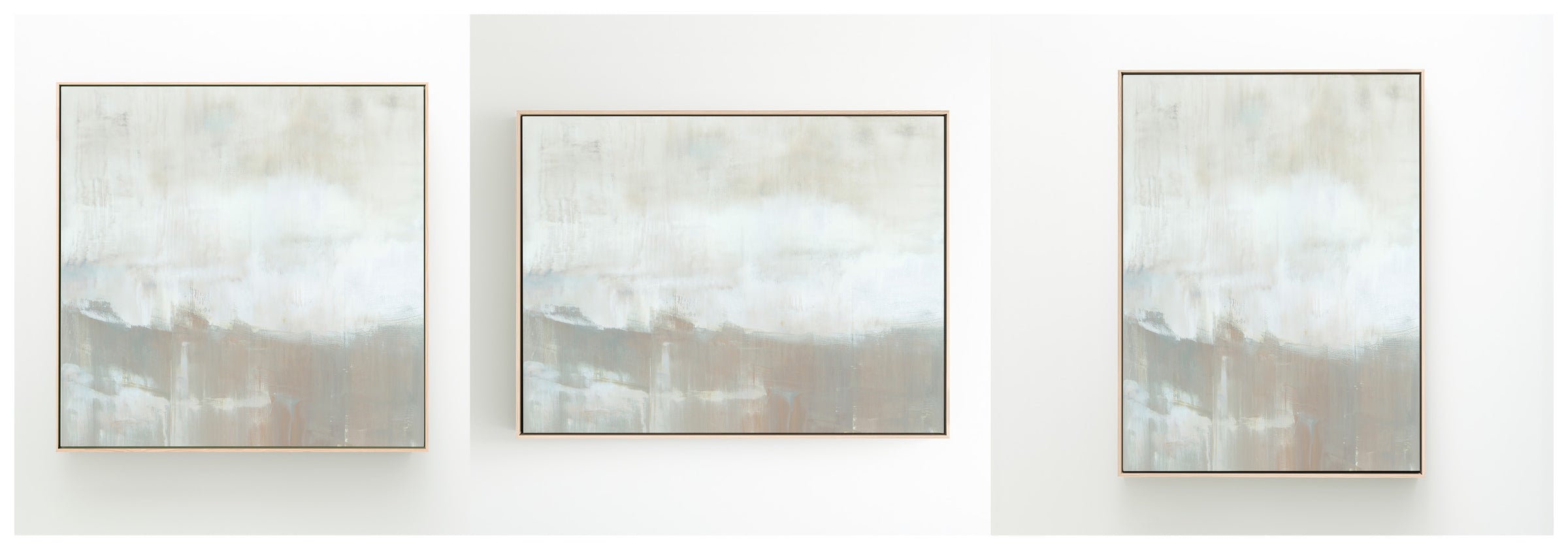 Soft taupes, creams and sage are layered to create a soft landscape. The Collection offers the range of options in various forms. The Canvas Basics format the work in square, horizontal, and vertical canvases. The Canvas Sets extend the painting across multiple canvases as a diptych or triptych. The Narrow Canvas is a great solution for hard to fill spaces, available in a range of sizes. Additional sizing is available as a hand-finished and signed mixed media canvas.