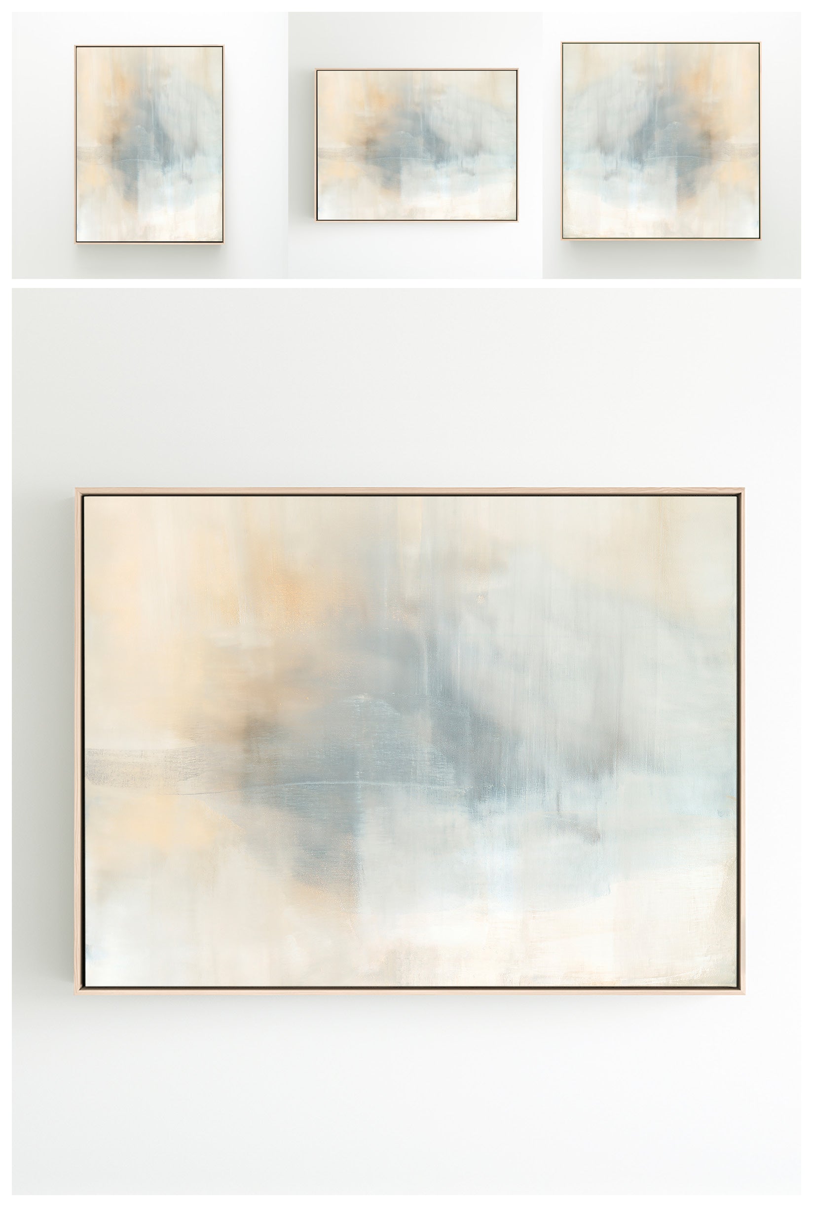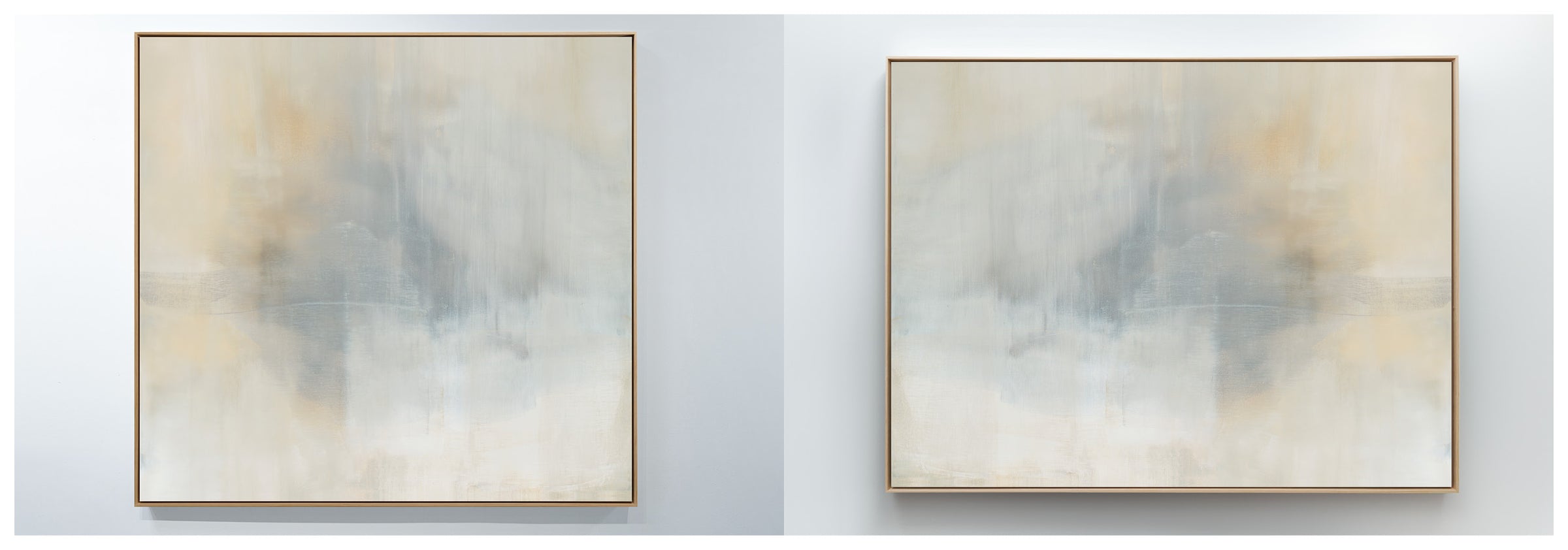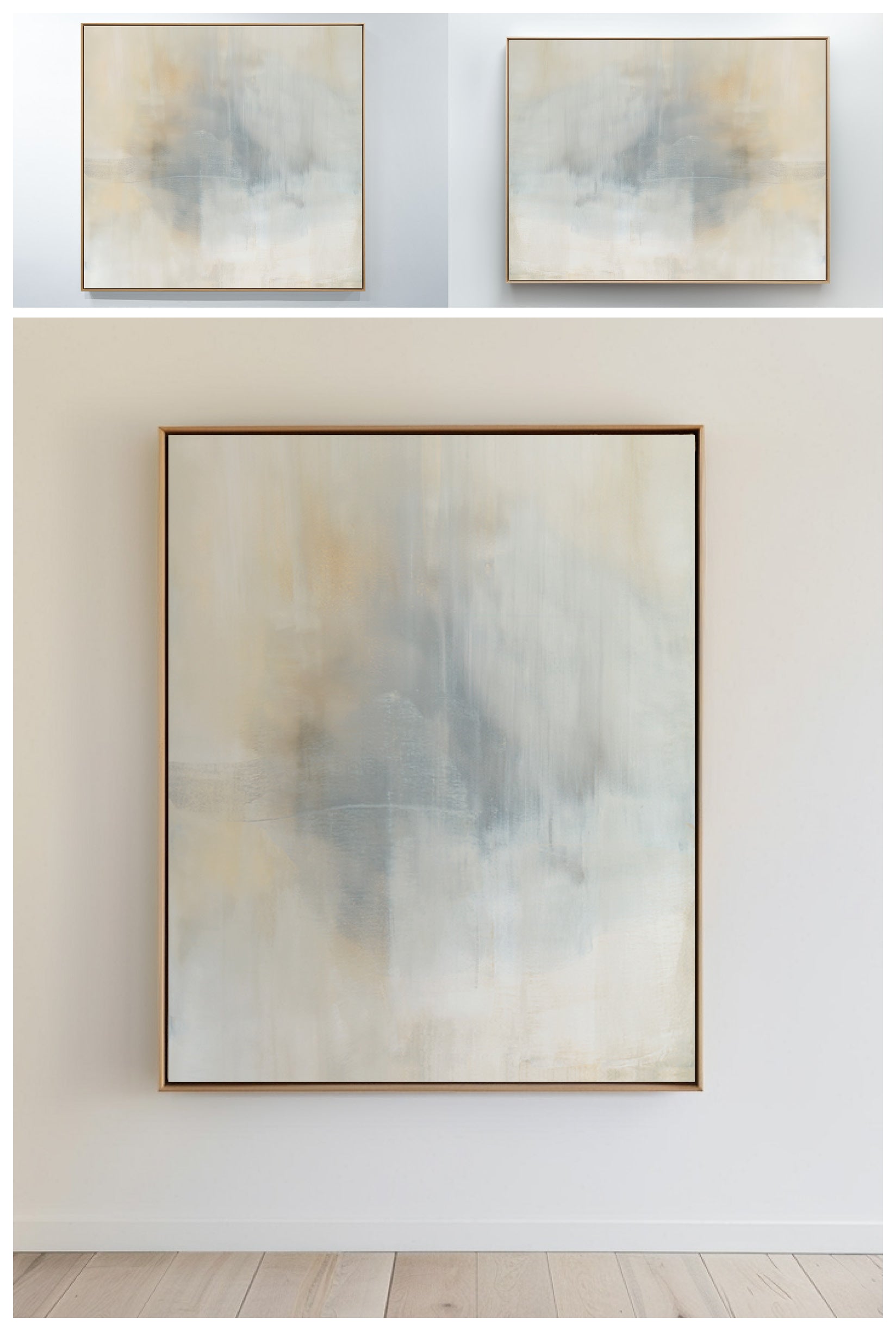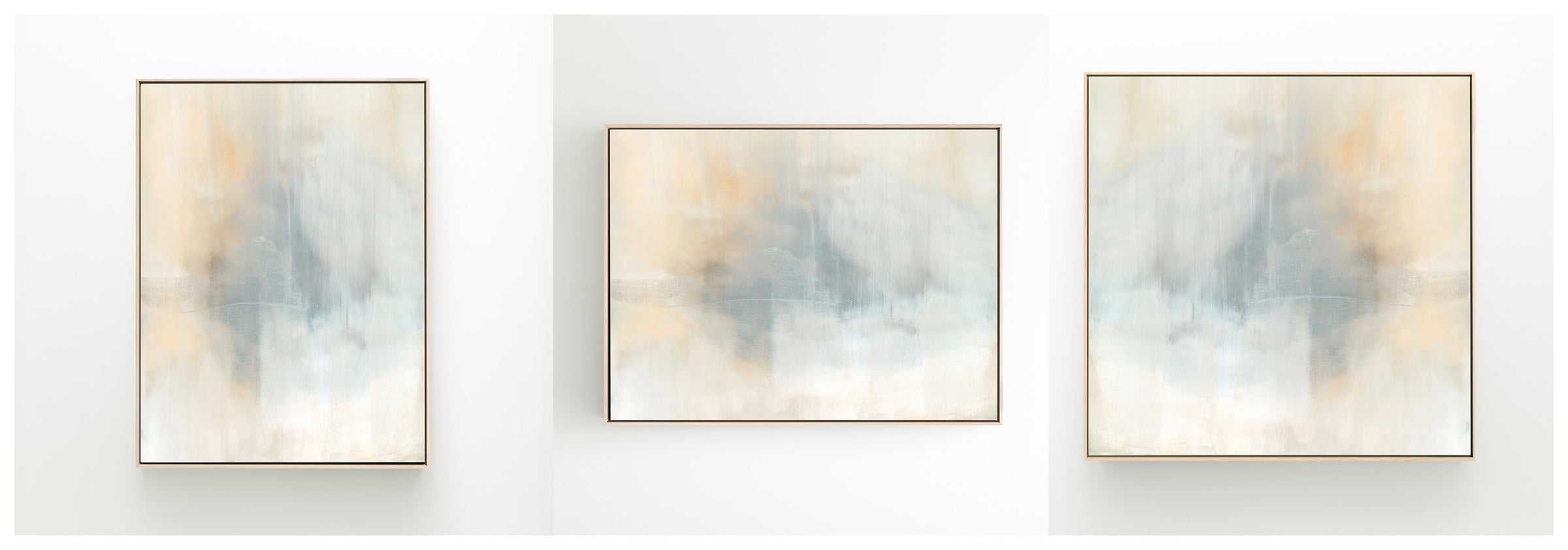 Ethereal movement reflects light in soft grays, taupes, and buttery creams. The Innuendo No.3 Collection offers the work in many forms as a reproduction. The Canvas Basics format the work in square, horizontal, and vertical canvases. The Large Canvases offer our most impactful sizes. The Canvas Sets extend the painting across multiple canvases as a diptych or triptych. The Narrow Canvas is a great solution for hard to fill spaces, available in a range of sizes. Additional sizing is available as a hand-finished and signed mixed media canvas.