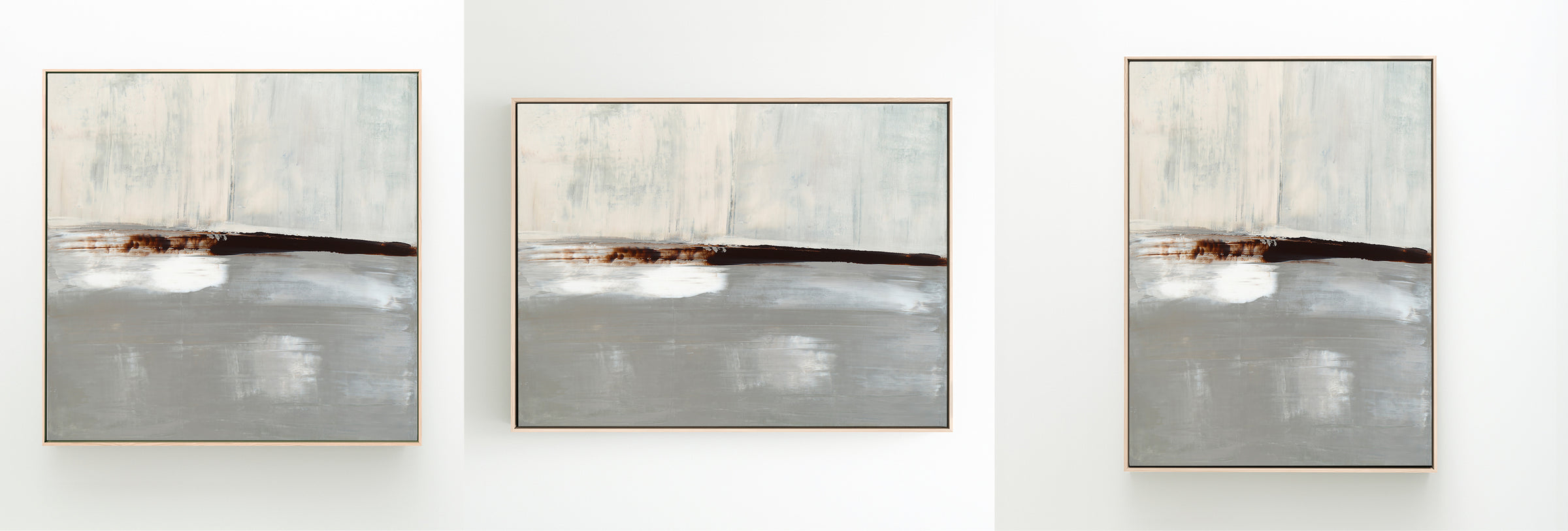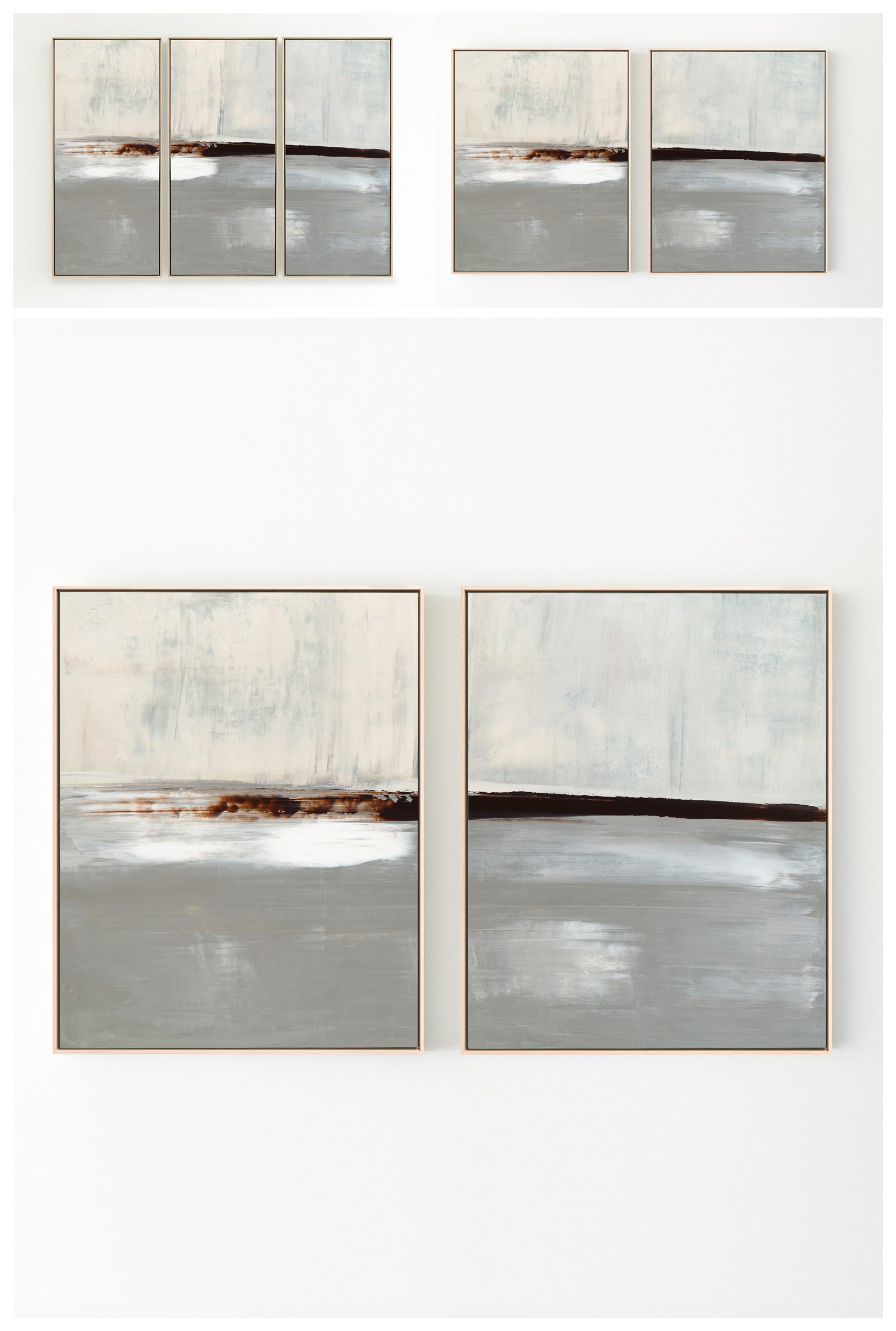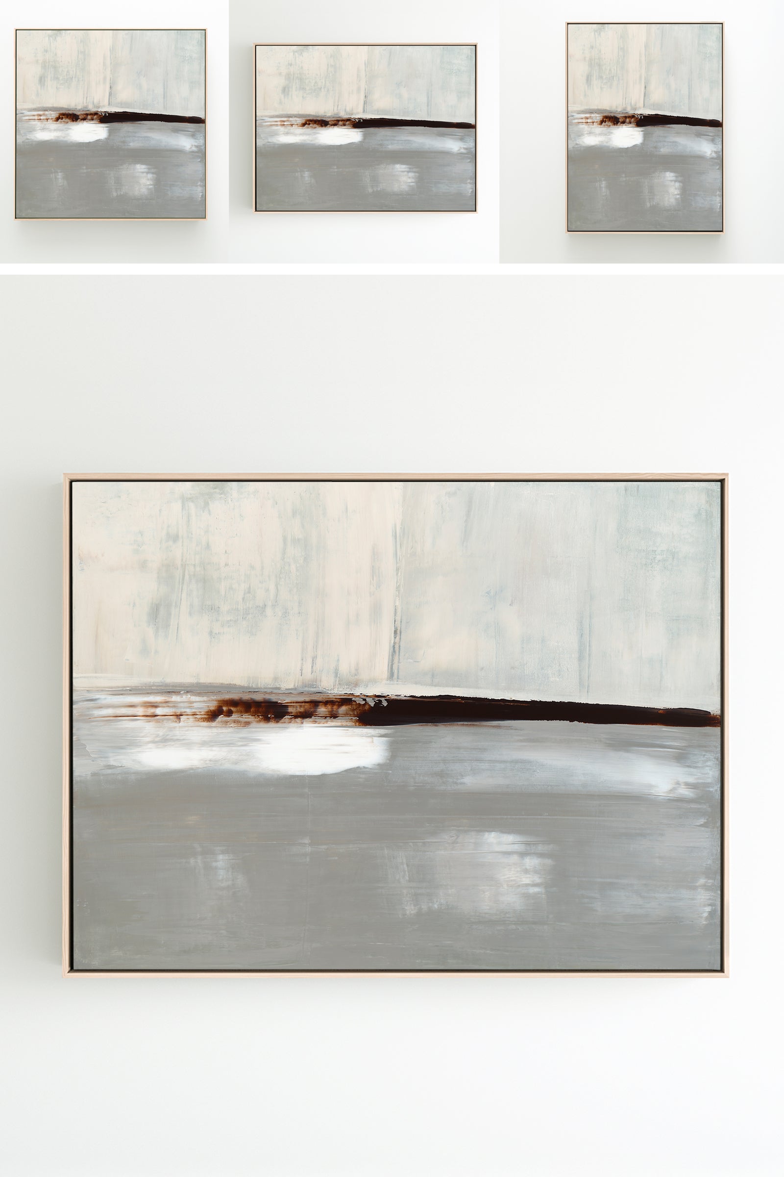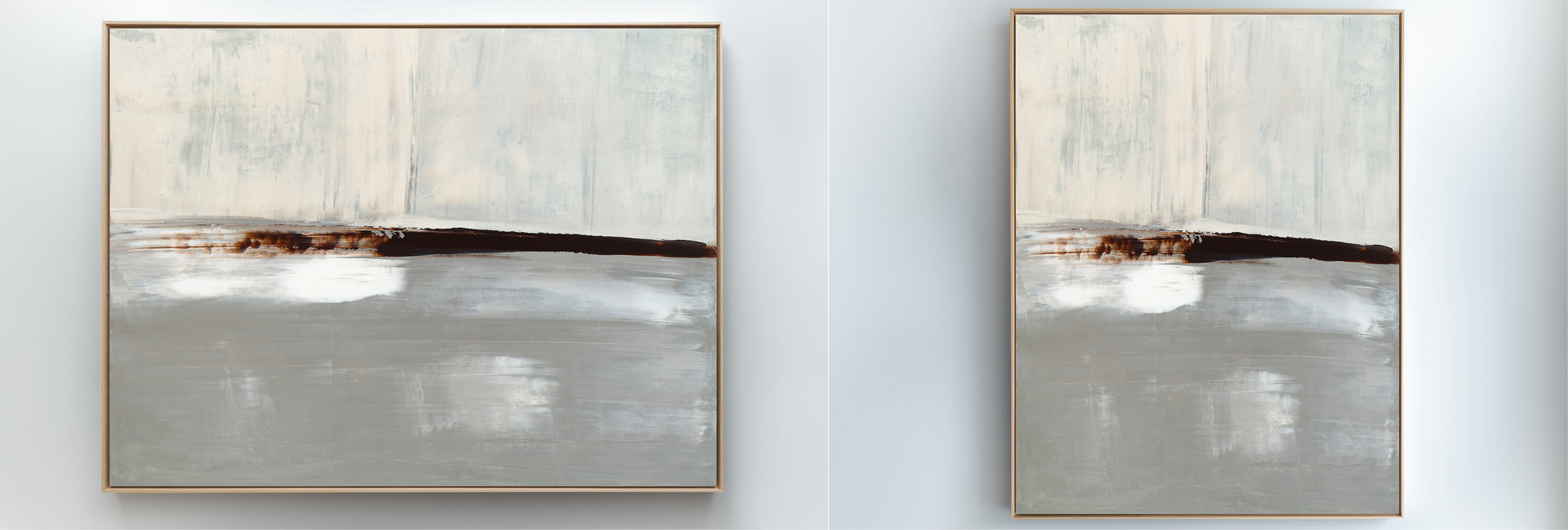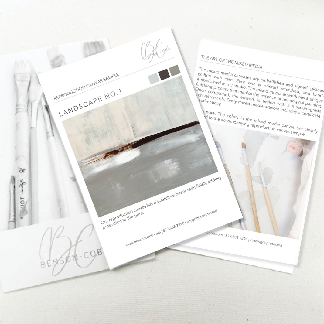 Layered in deep umber, crisp whites and icy grays, The Landscape No.1 Collection offers the work in many forms from the original painting to reproductions in several options. The Canvas Basics format the work in square, horizontal, and vertical canvases. The Large Canvases offer our most impactful sizes. The Canvas Sets extend the painting across multiple canvases as a diptych or triptych. The Narrow Canvas is a great solution for hard to fill spaces, available in a range of sizes. Additional sizing is available as a hand-finished and signed mixed media canvas.
