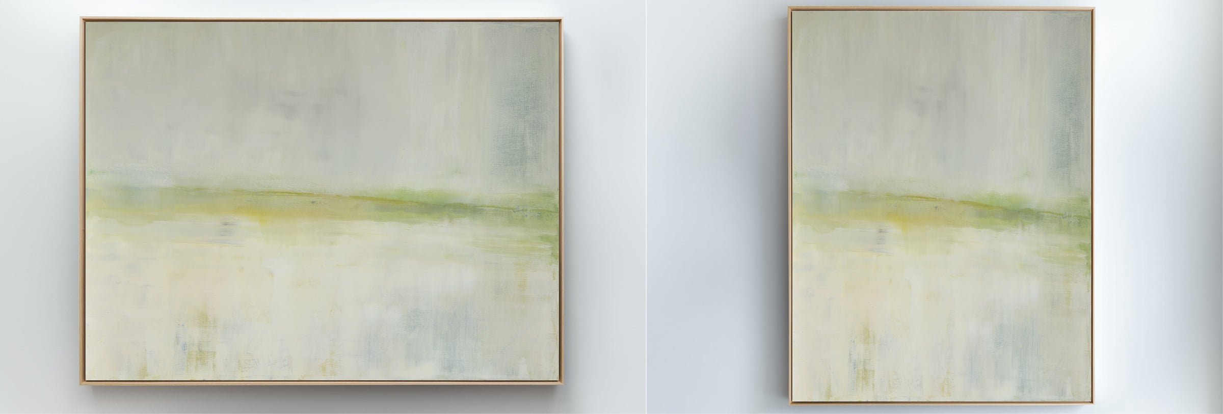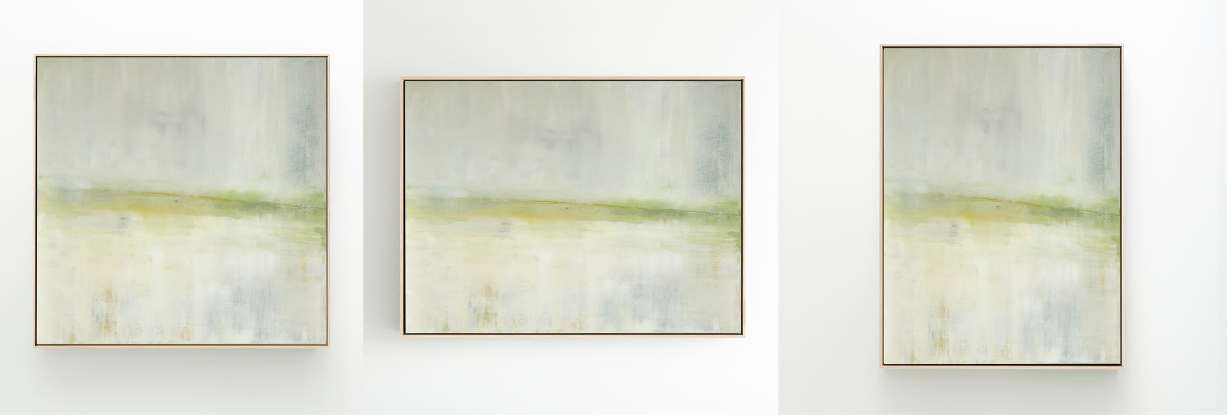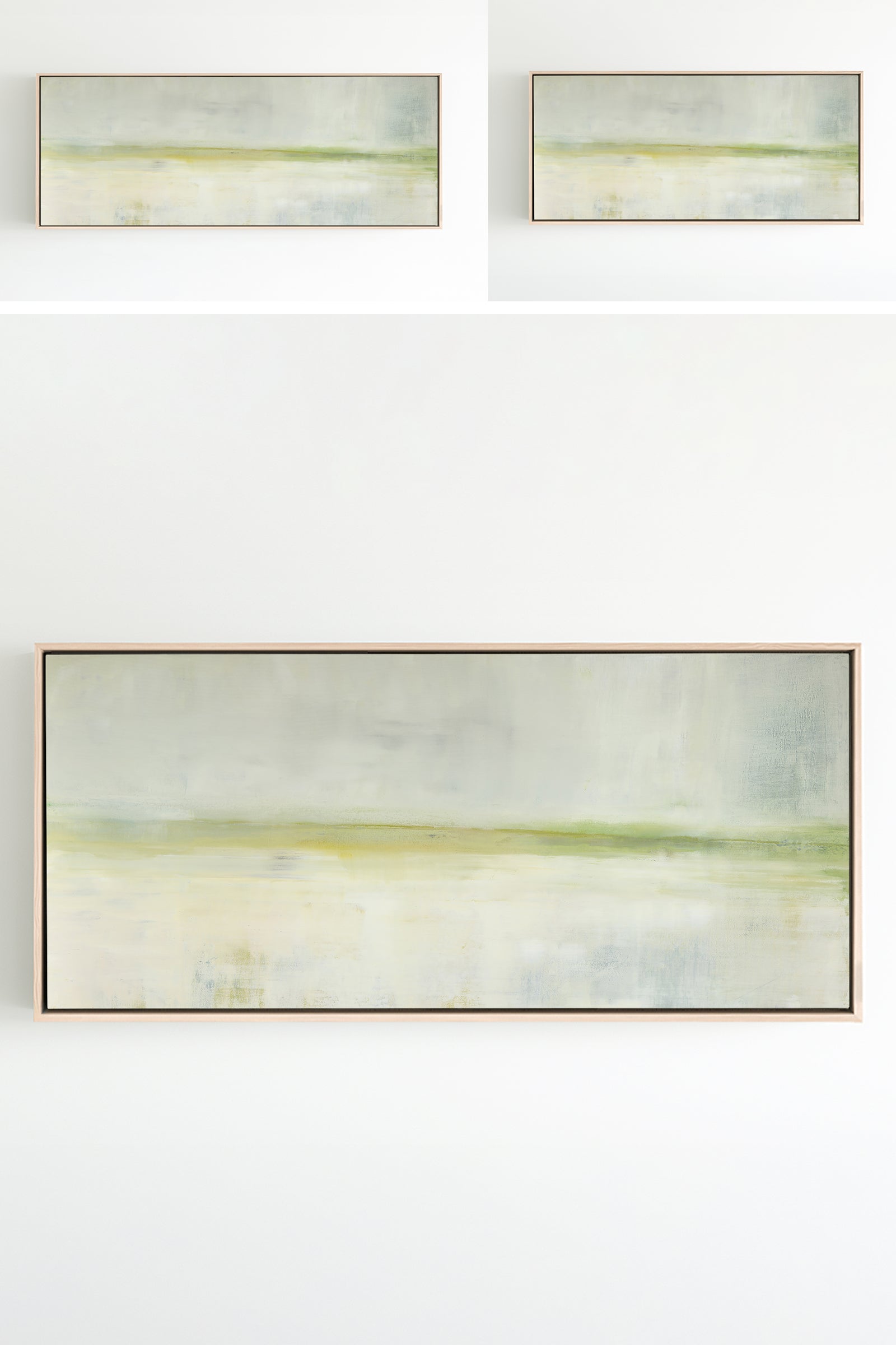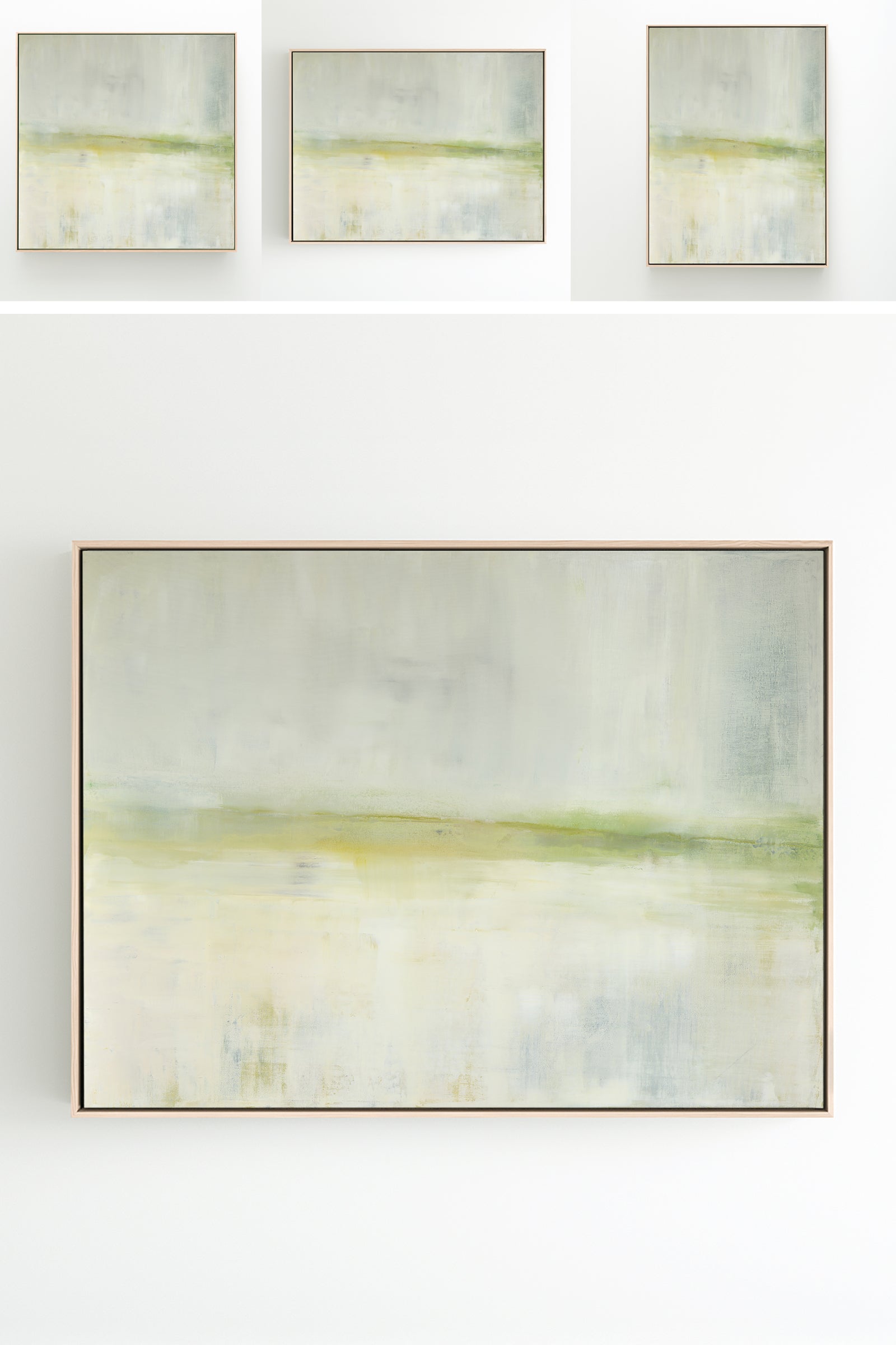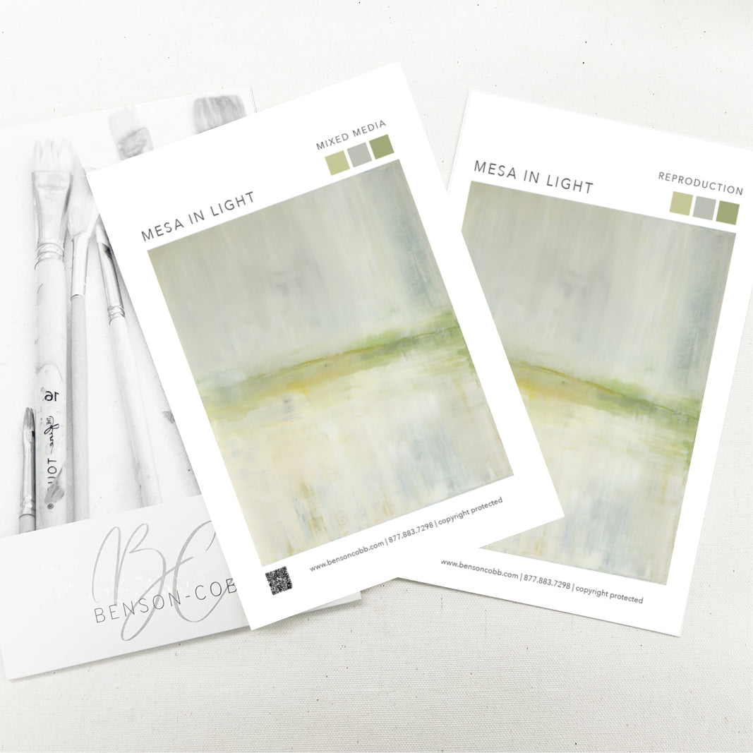A soothing color field of greens, Mesa in Light is a slightly toned version of the original painting, Mesa. The Collection offers the original Mesa as well as a range of reproductions. The Canvas Basics format the work in square, horizontal, and vertical canvases. The Large Canvases offer our most impactful sizes. The Canvas Sets extend the painting across multiple canvases as a diptych or triptych. The Narrow Canvas is a great solution for hard to fill spaces, available in a range of sizes. Additional sizing is available as a hand-finished and signed mixed media canvas.
