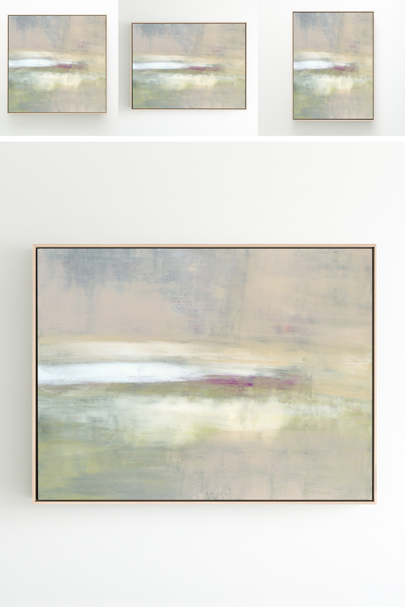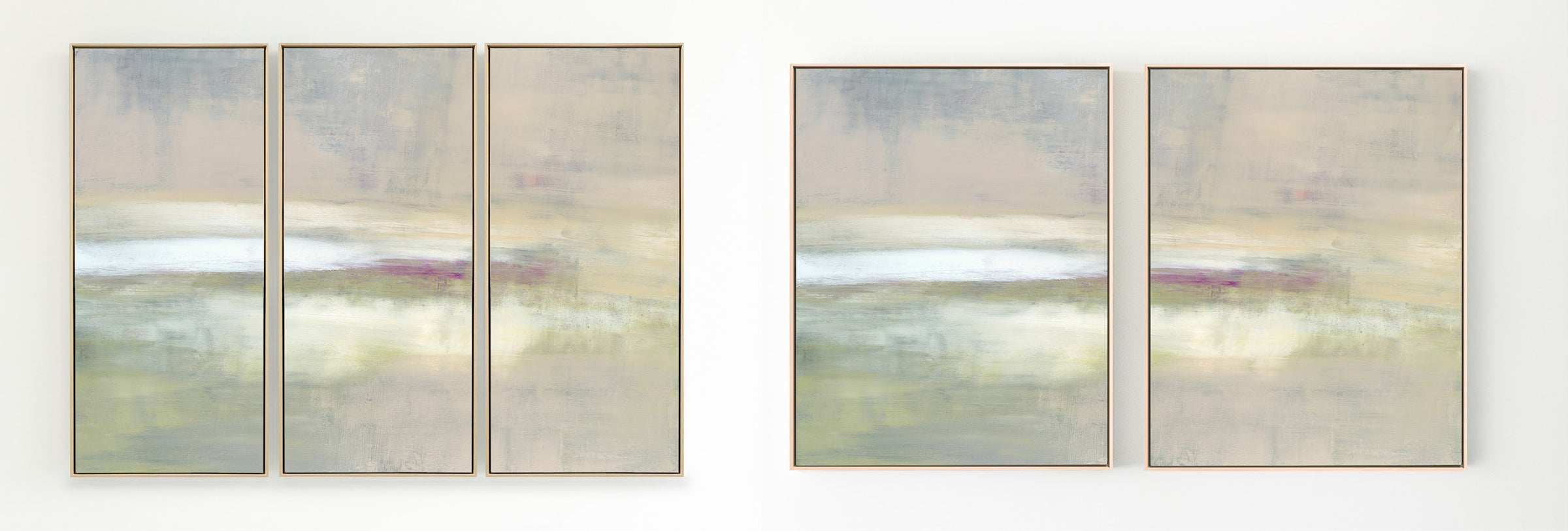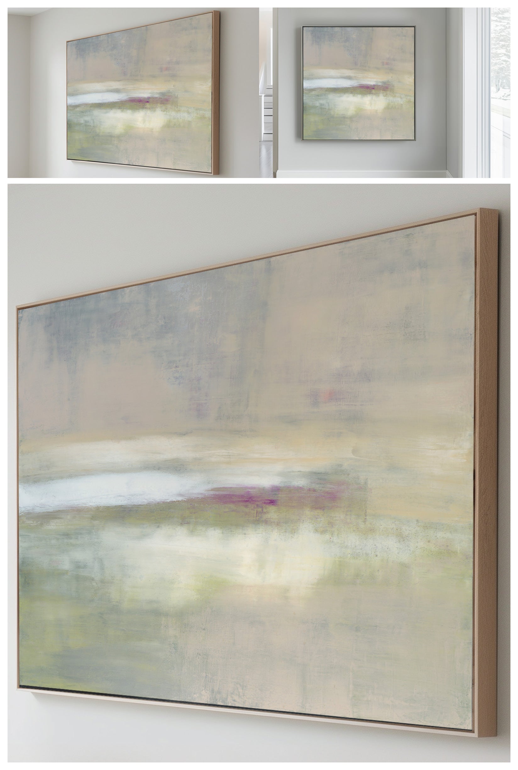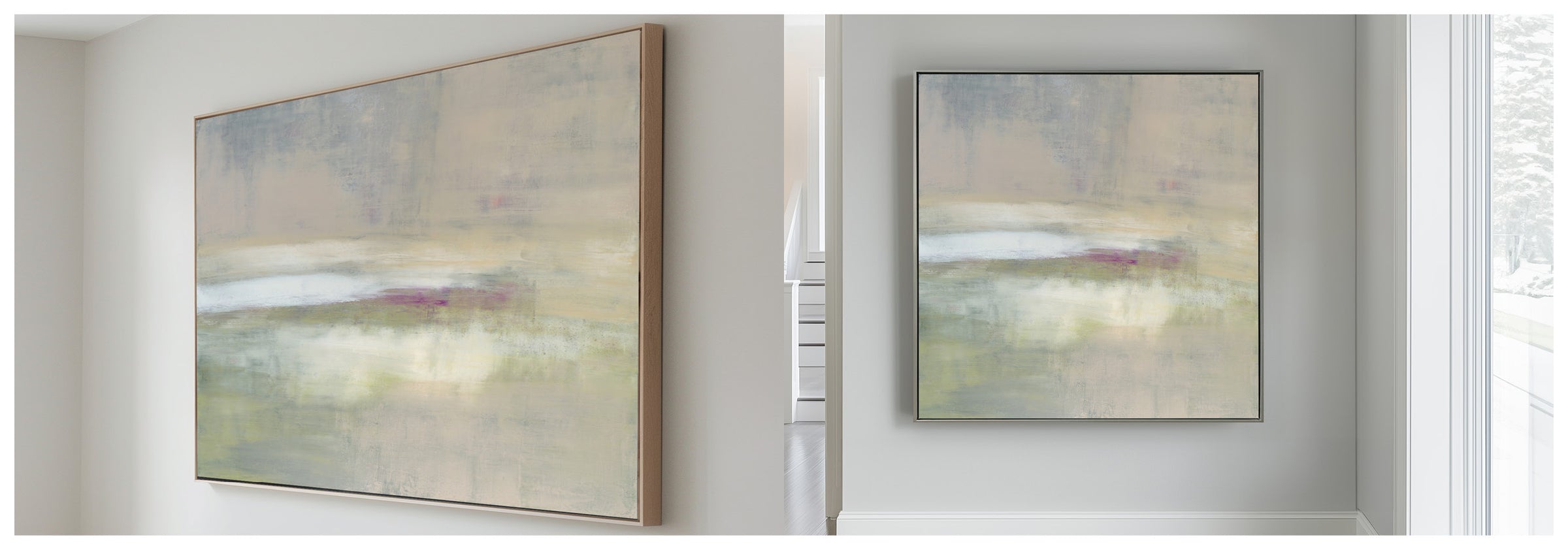 Extensive layering techniques give this soft color field a pearl-like appearance. The Mystic Landscape Collection offers the original painting as well as a range of reproductions. The Canvas Basics format the work in square, horizontal, and vertical canvases. The Large Canvases offer our most impactful sizes. The Canvas Sets extend the painting across multiple canvases as a diptych or triptych. The Narrow Canvas is a great solution for hard to fill spaces, available in a range of sizes. Additional sizing is available as a hand-finished and signed mixed media canvas.