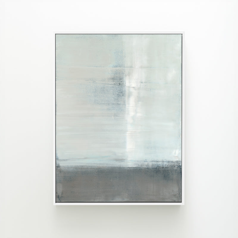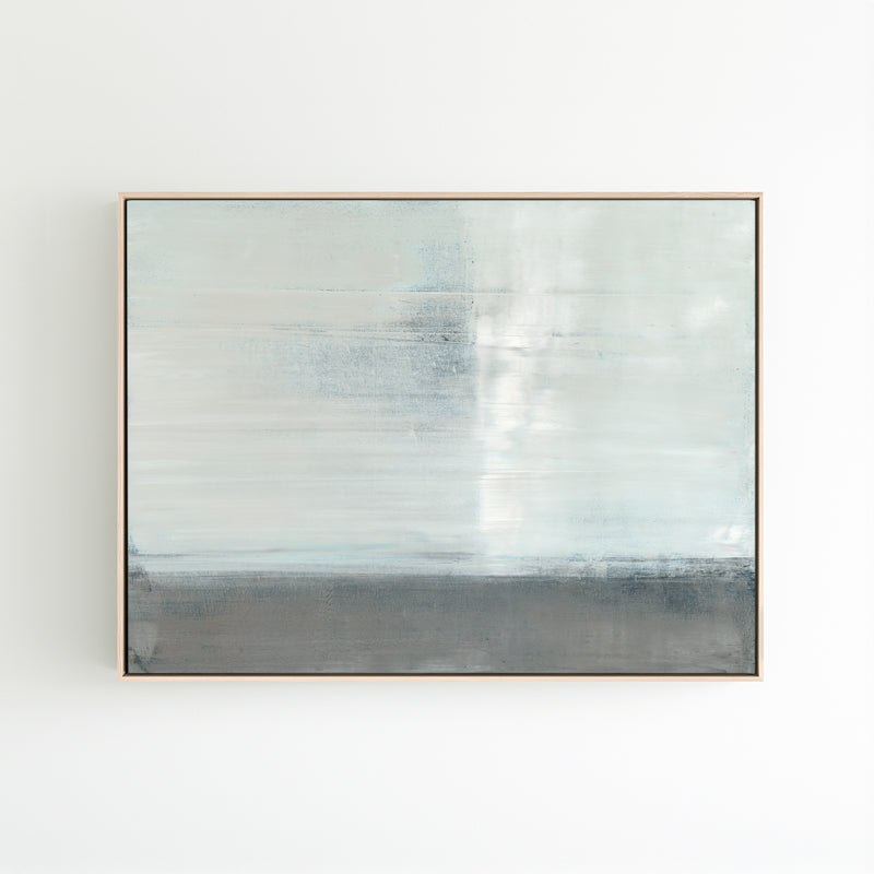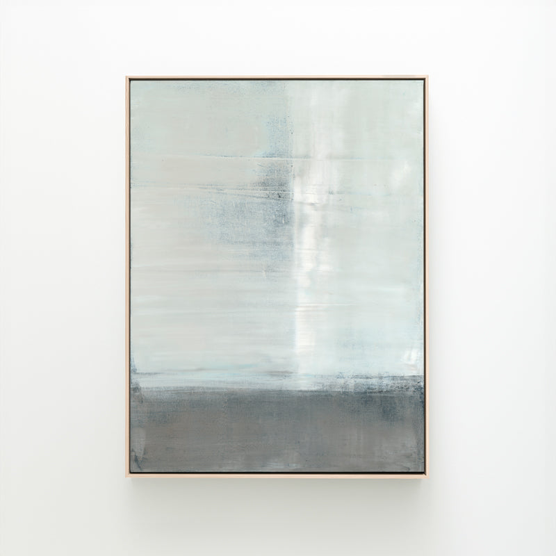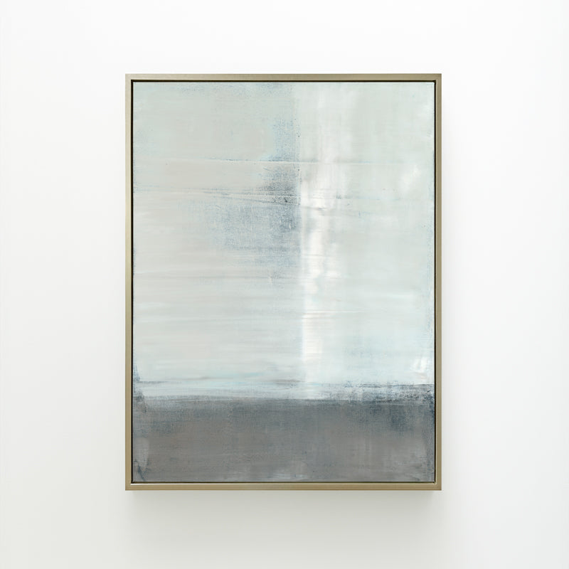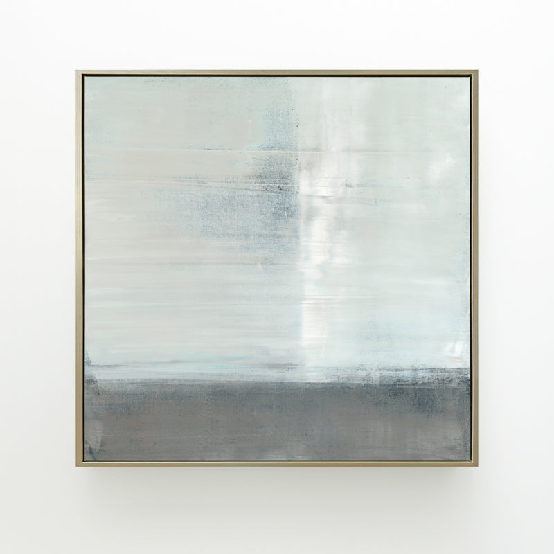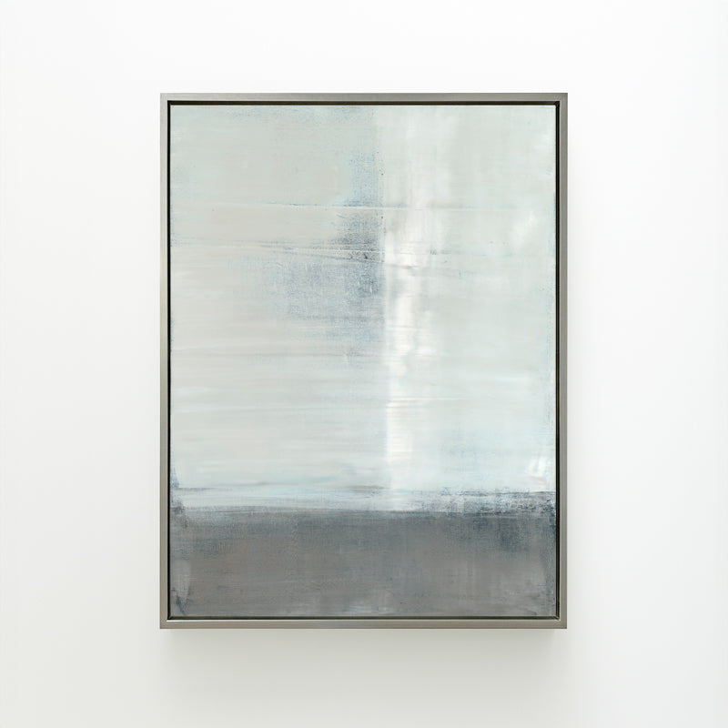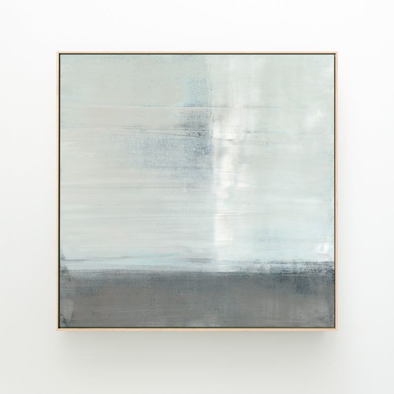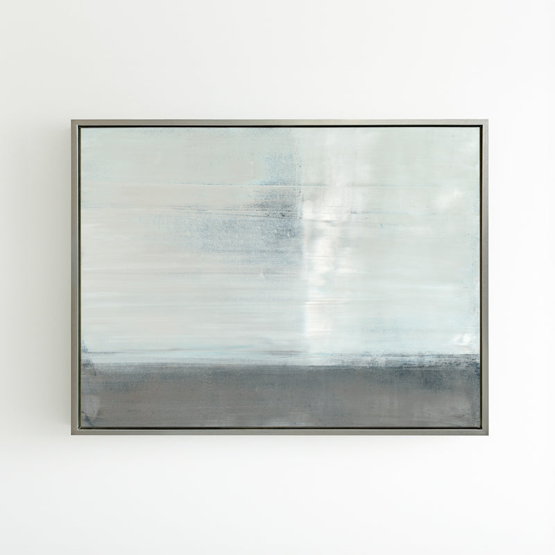 Pale blues and soft grays are layered within the horizon. The abstract work is inspired by the reflections of a canyon landscape.