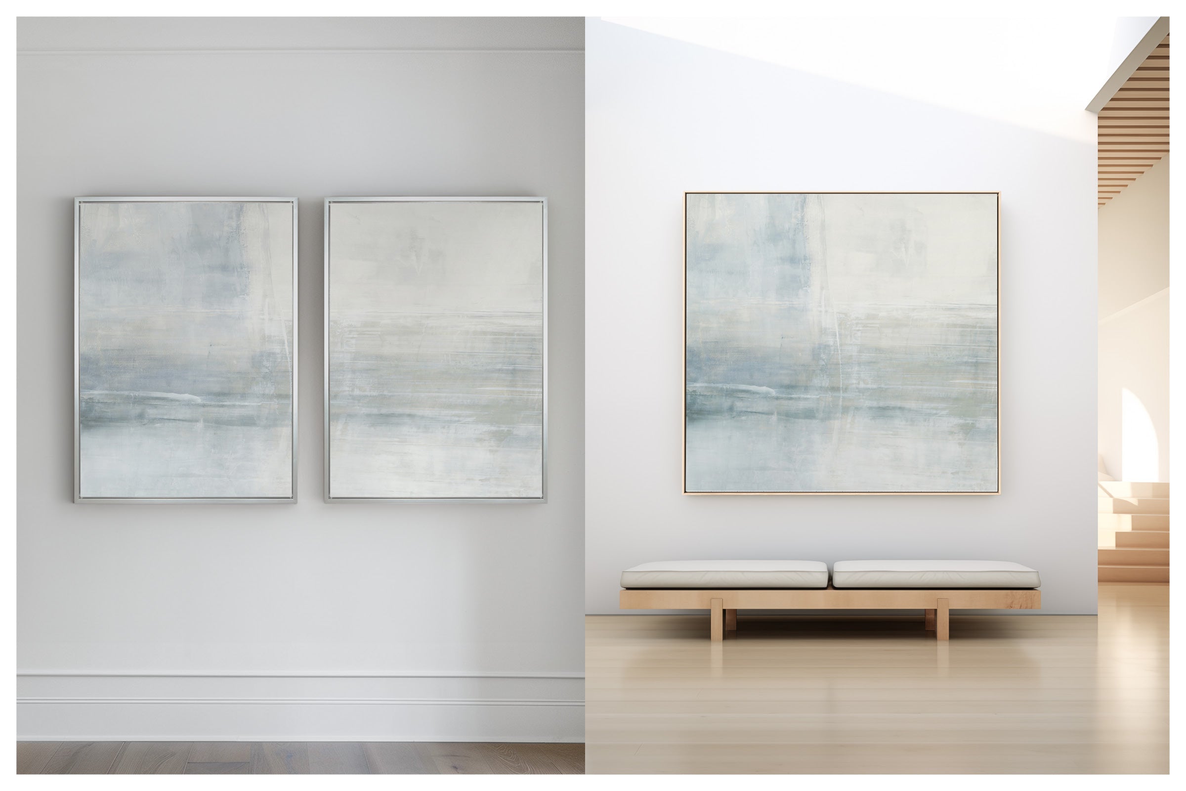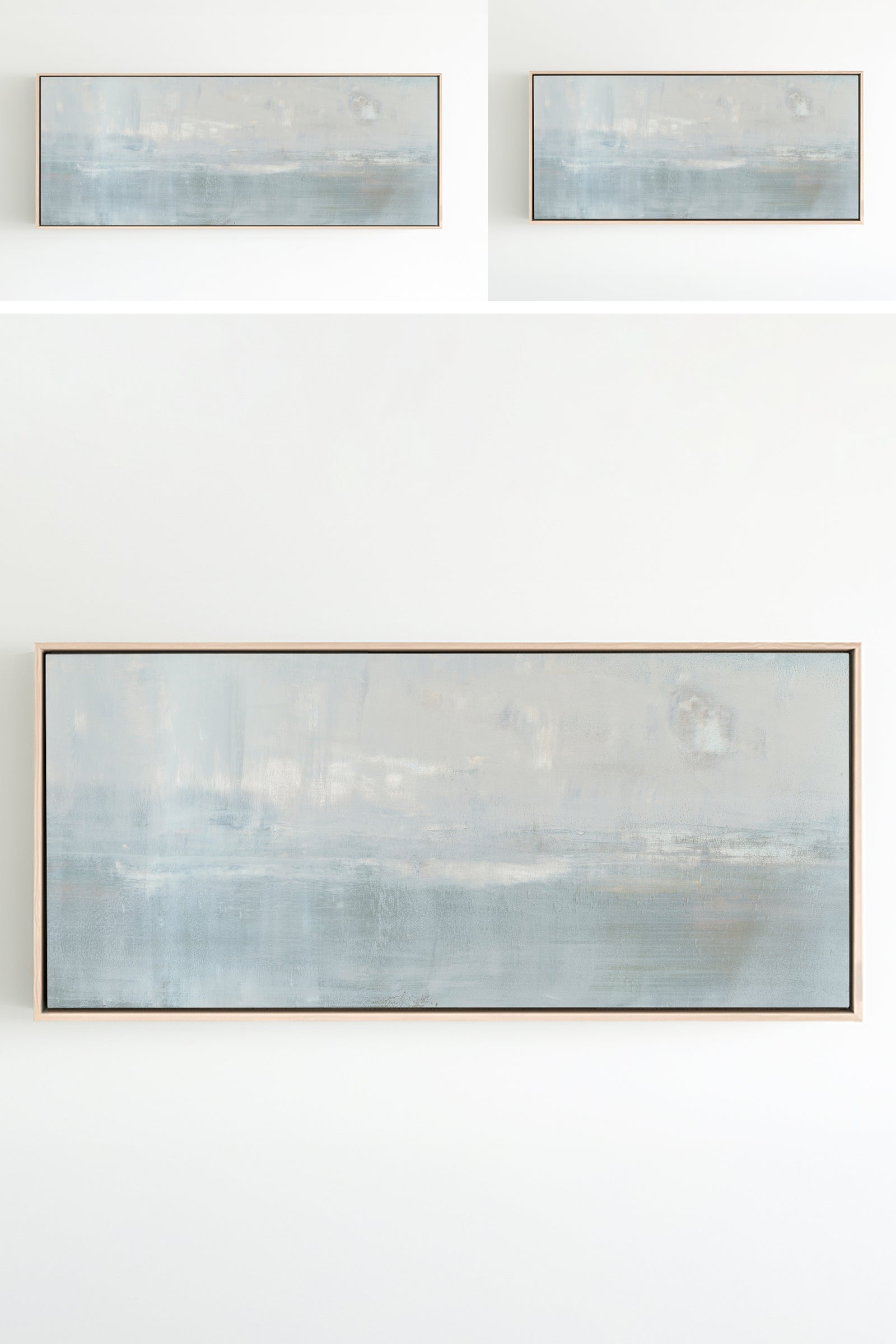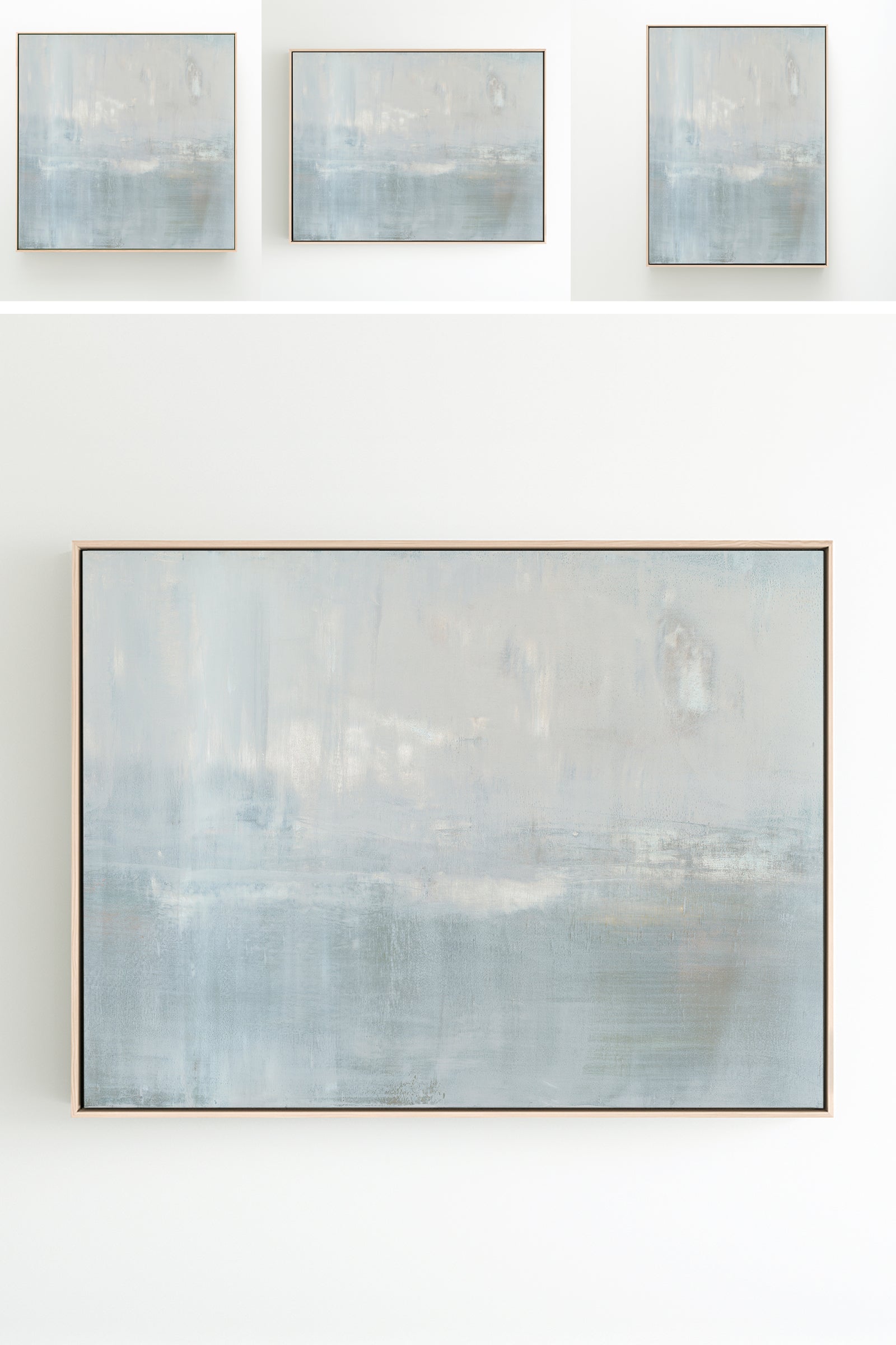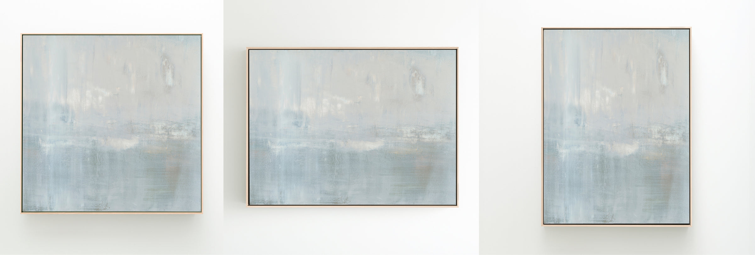 The subtle pale gray with slight gray-blue undertones creates a soothing work of art. The Collection offers the work in many forms, The Canvas Basics format the work in square, horizontal, and vertical canvases. The Canvas Sets extend the painting across multiple canvases as a diptych or triptych. The Narrow Canvas is a great solution for hard to fill spaces, available in a range of sizes. Additional sizing is available as a hand-finished and signed mixed media canvas.