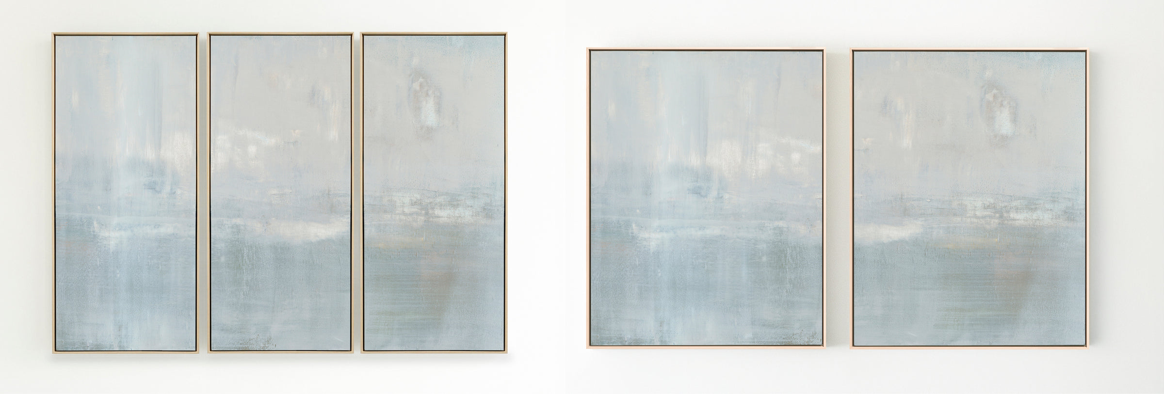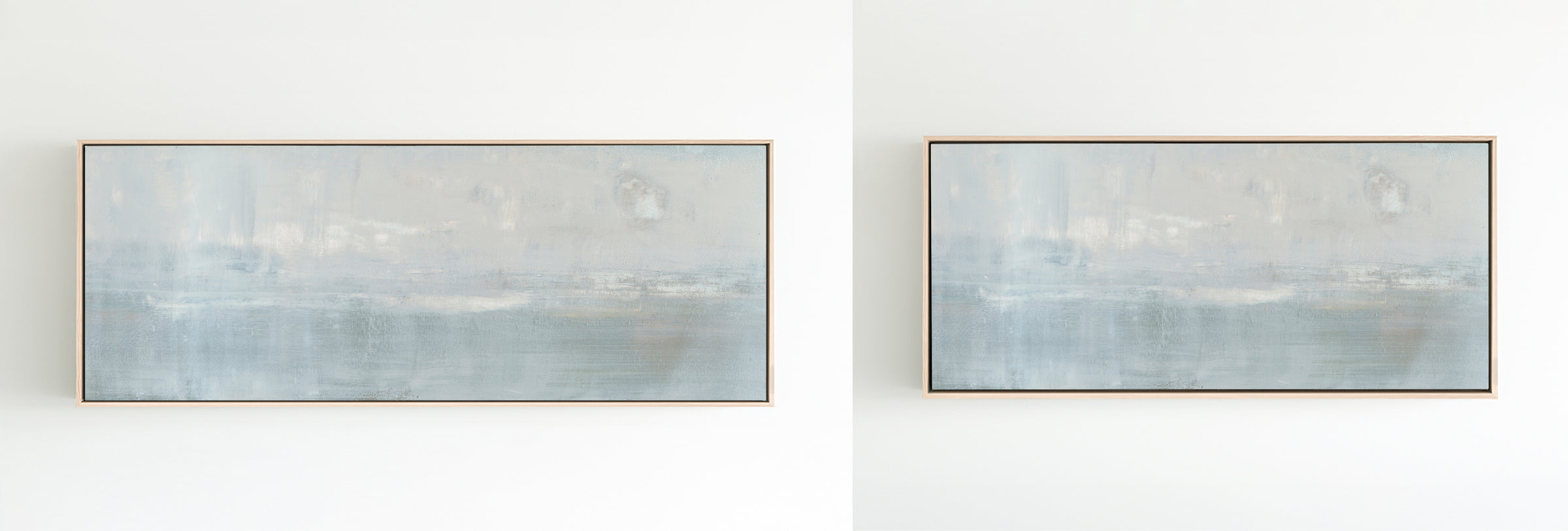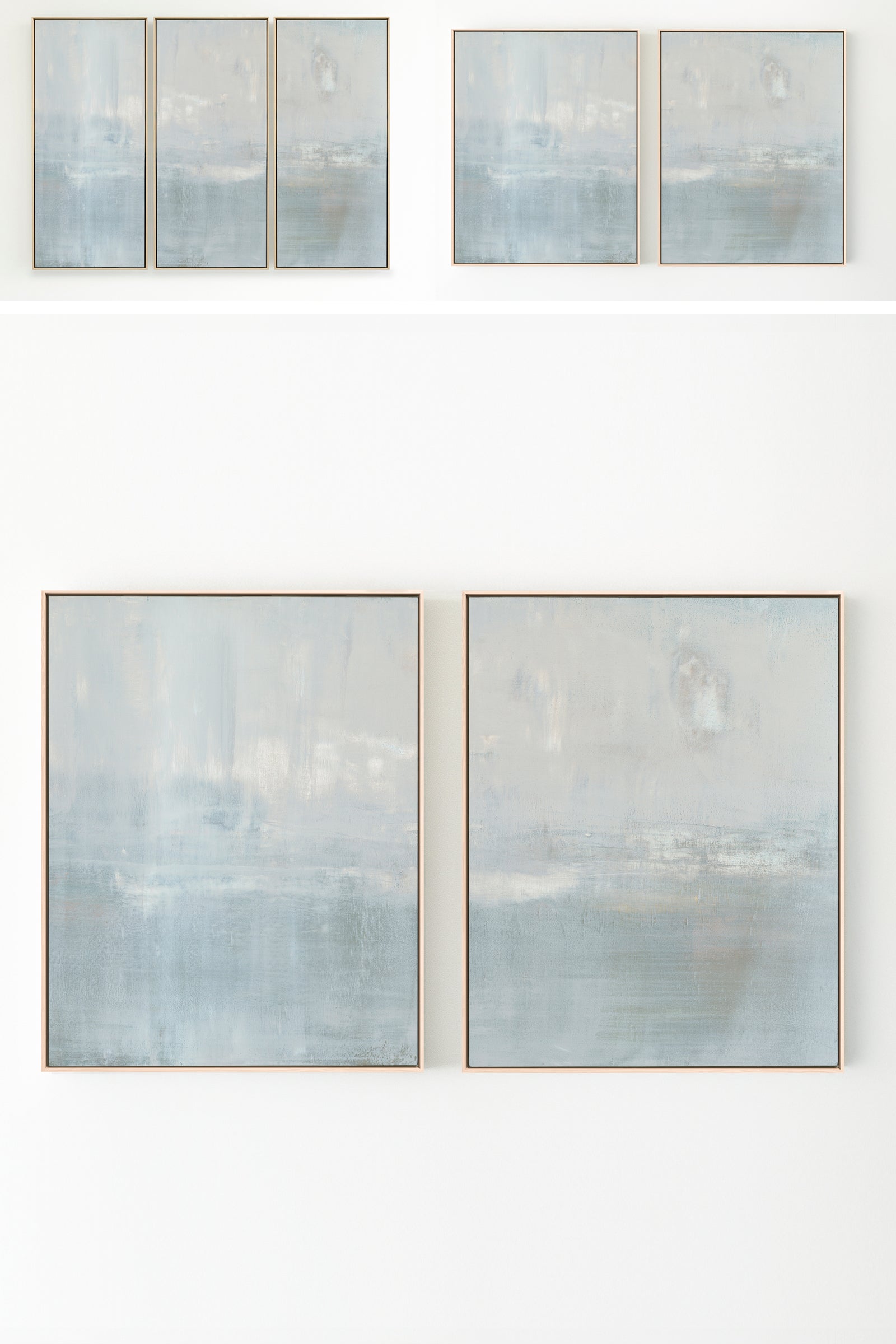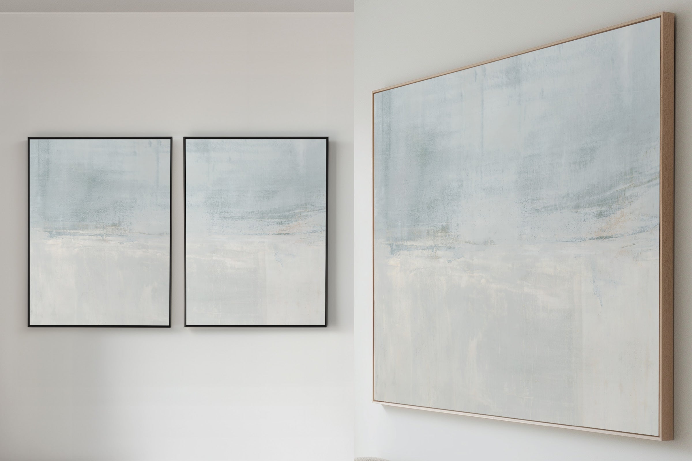 The subtle pale gray with slight gray-blue undertones creates a soothing work of art. The Collection offers the work in many forms, The Canvas Basics format the work in square, horizontal, and vertical canvases. The Canvas Sets extend the painting across multiple canvases as a diptych or triptych. The Narrow Canvas is a great solution for hard to fill spaces, available in a range of sizes. Additional sizing is available as a hand-finished and signed mixed media canvas.