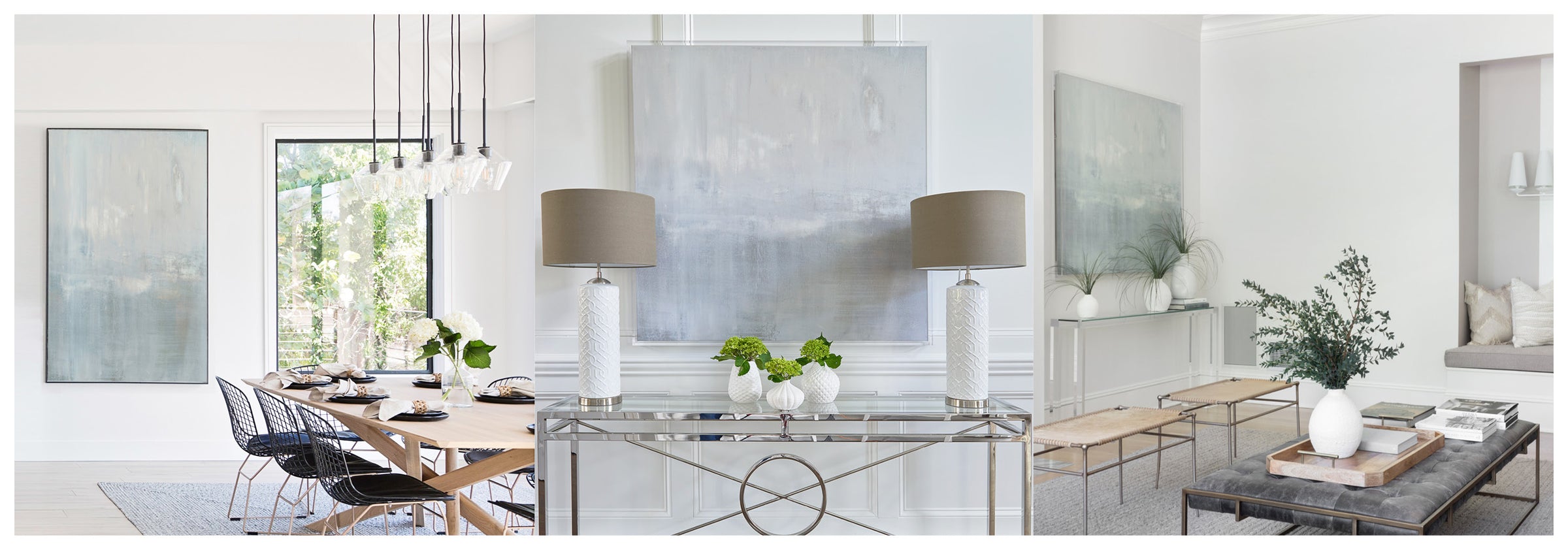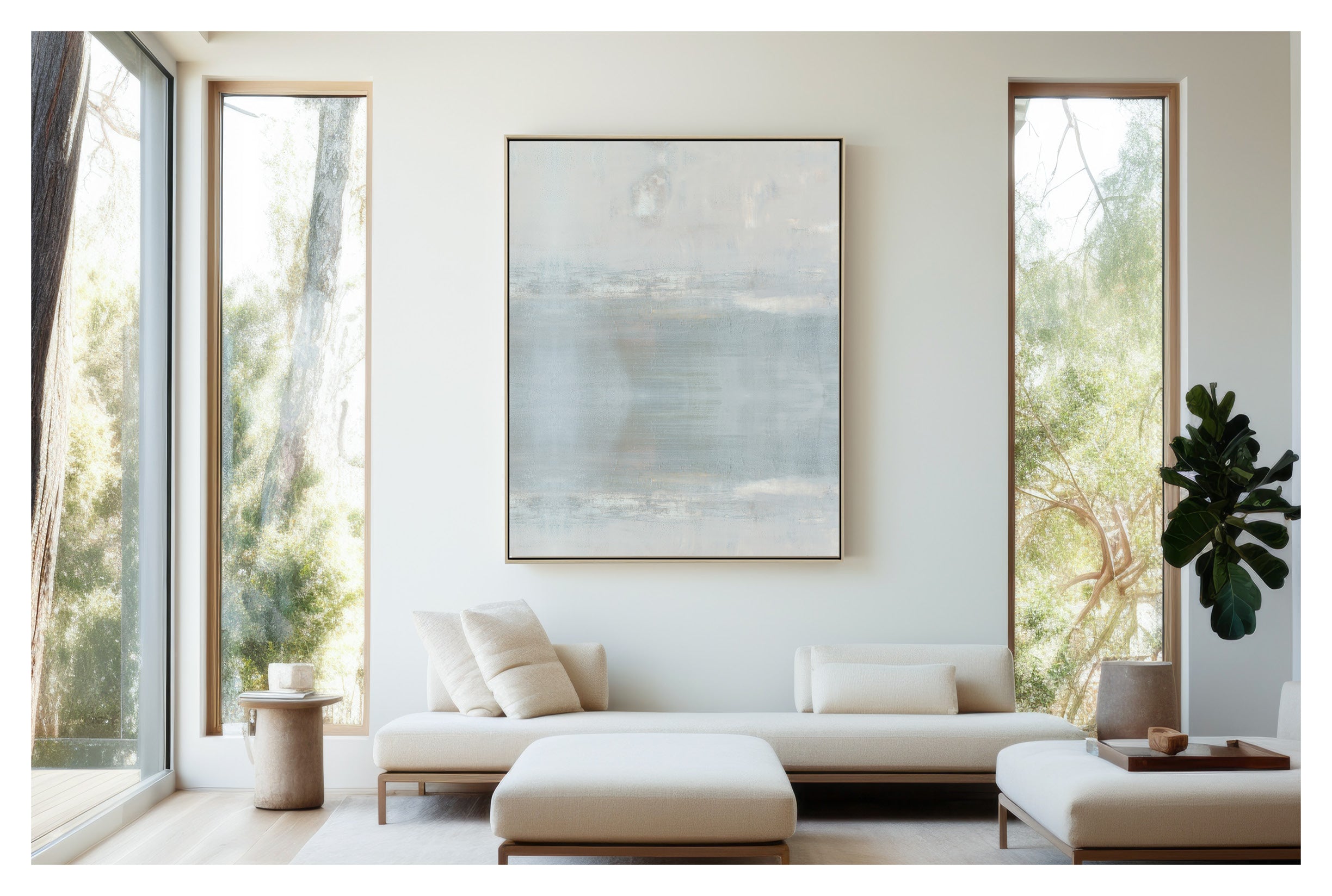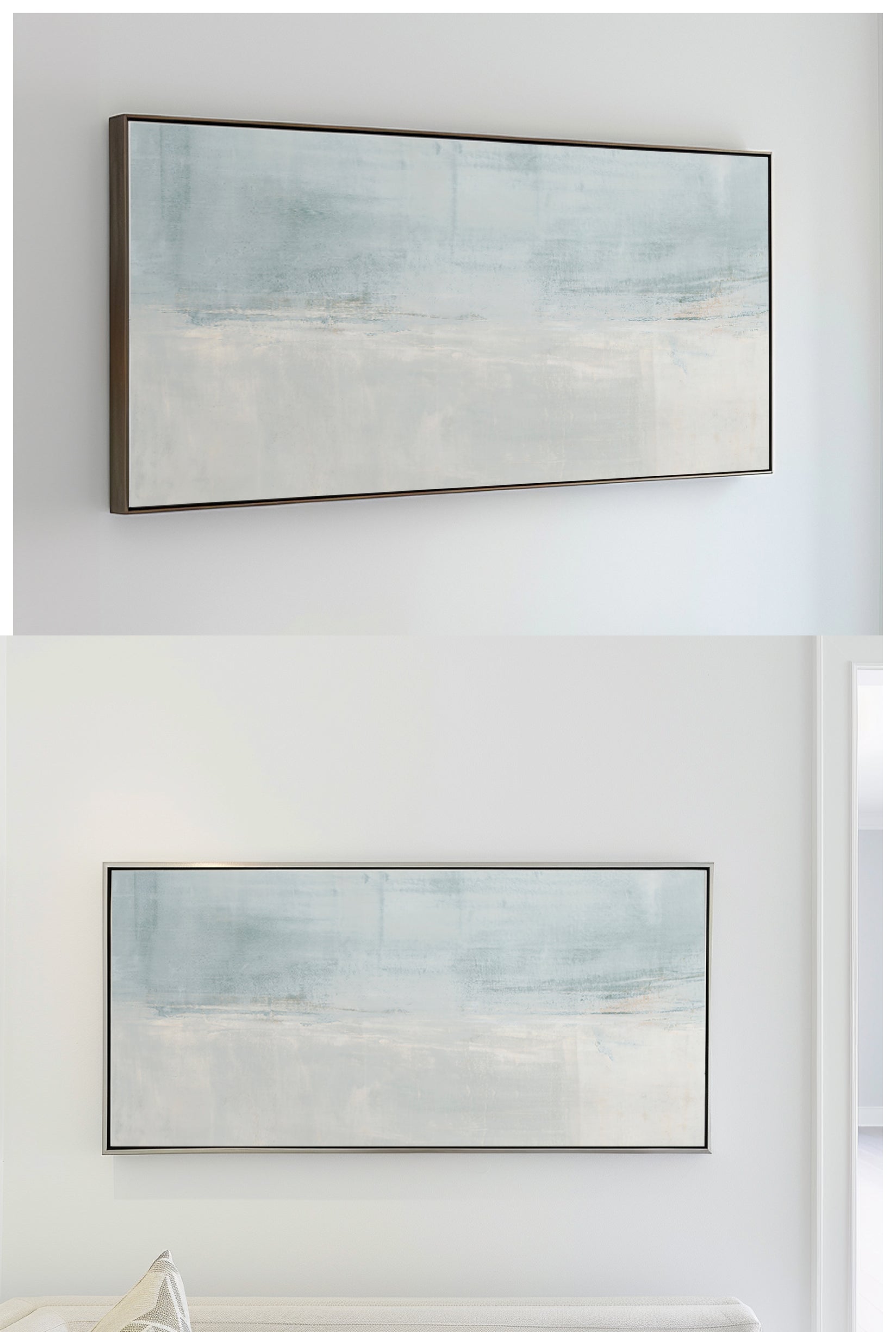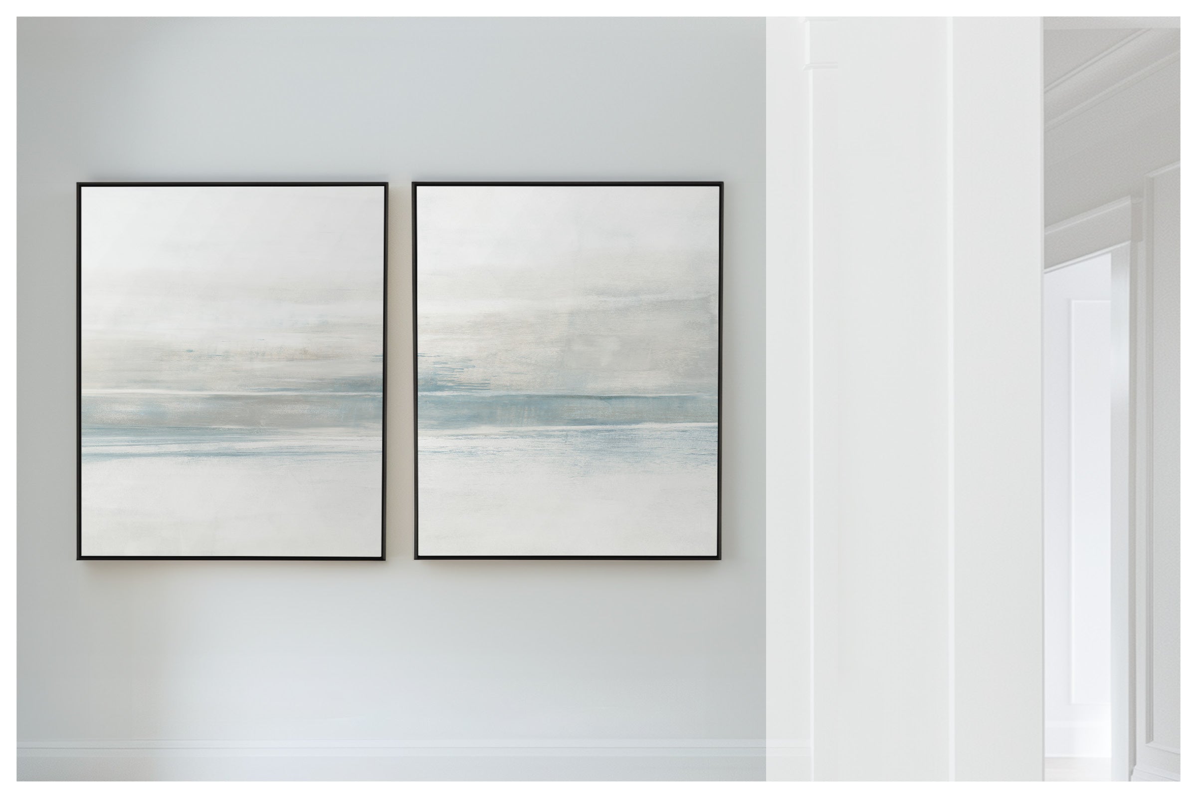 The subtle pale gray with slight gray-blue undertones creates a soothing work of art. The Collection offers the work in many forms, The Canvas Basics format the work in square, horizontal, and vertical canvases. The Canvas Sets extend the painting across multiple canvases as a diptych or triptych. The Narrow Canvas is a great solution for hard to fill spaces, available in a range of sizes. Additional sizing is available as a hand-finished and signed mixed media canvas.