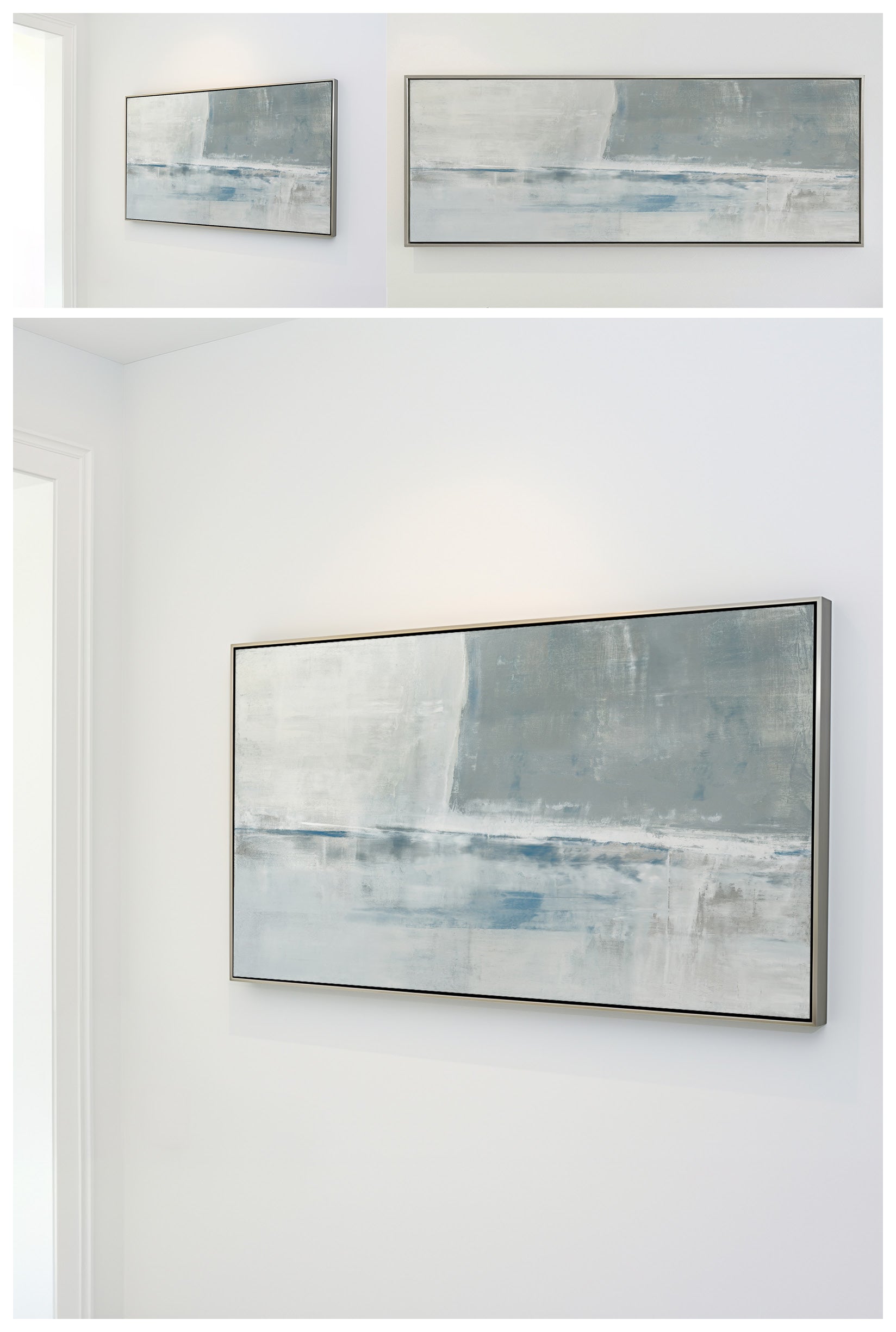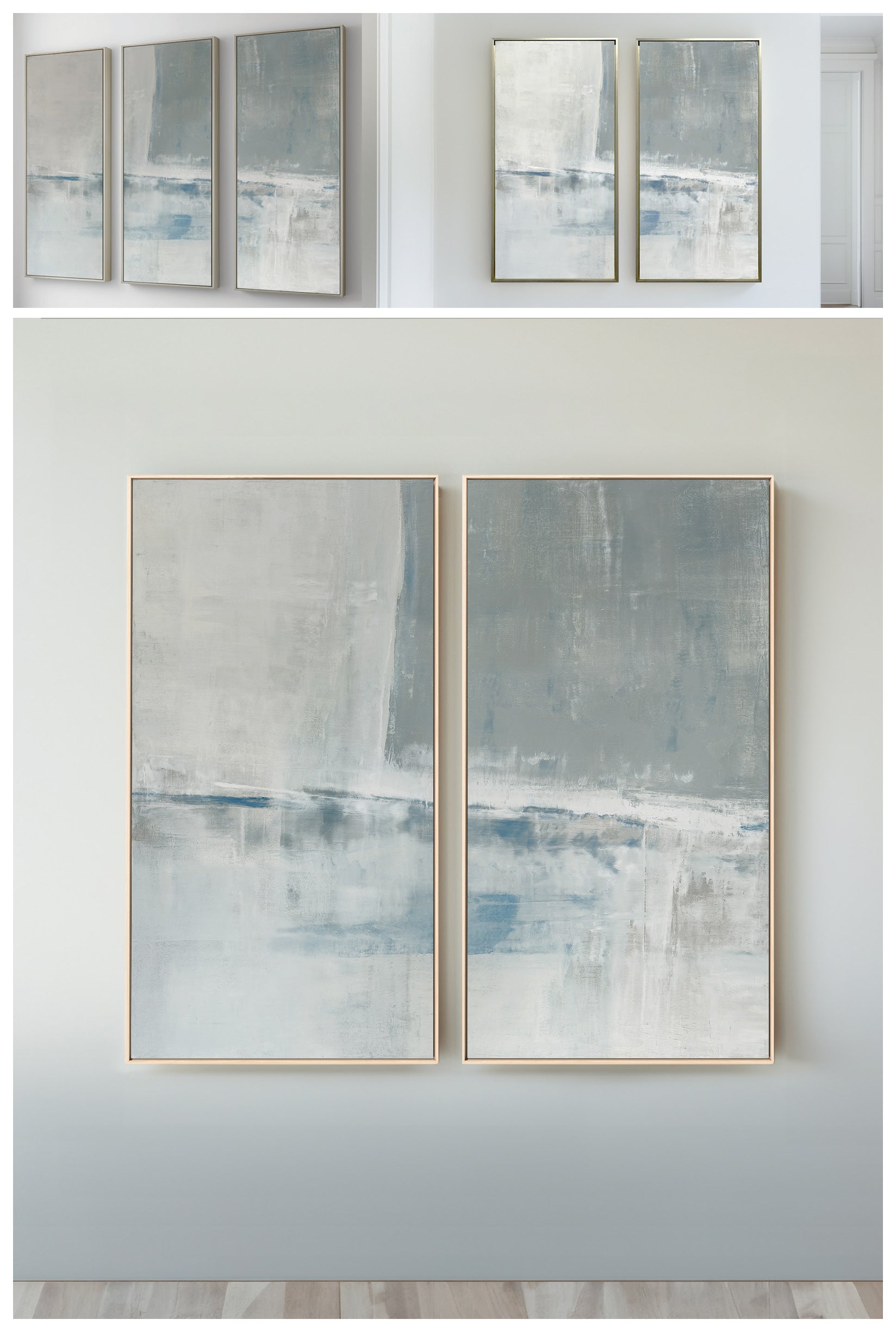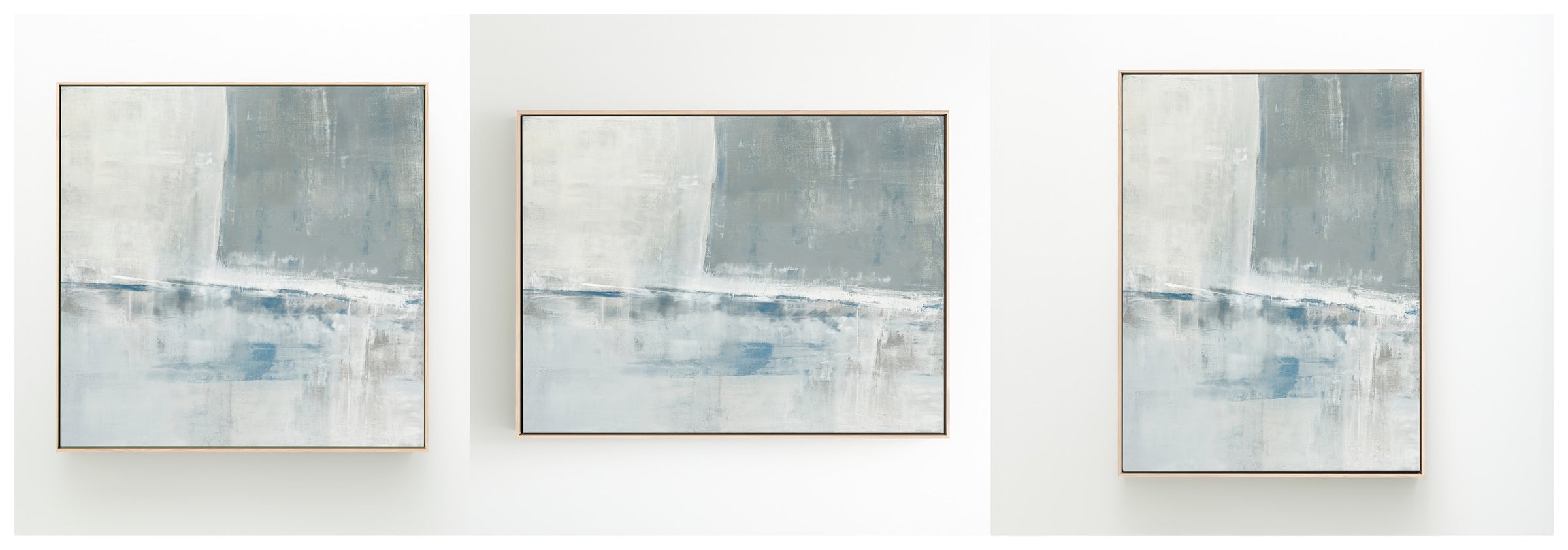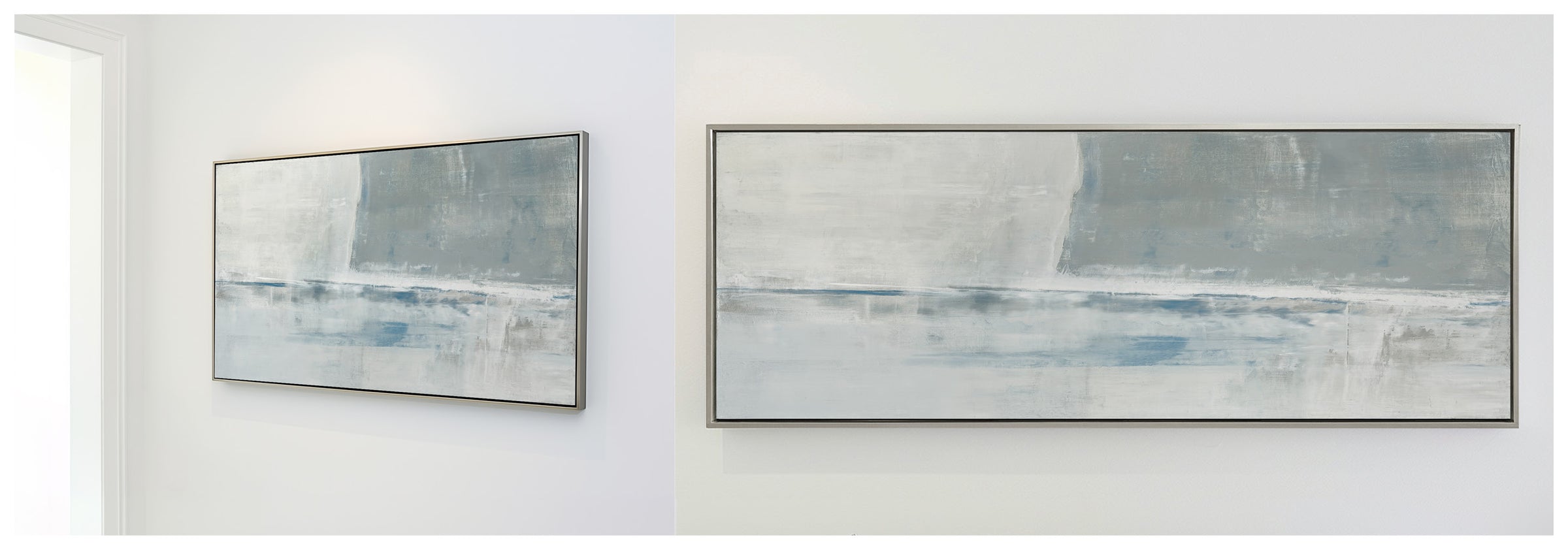 Subtle color shifts from the original painting, Shallow in Gray is layered in slate blues merging with creams and pale grays. The Collection offers the work in many forms, The Canvas Basics format the work in square, horizontal, and vertical canvases. The Large Canvases offer our most impactful sizes. The Canvas Sets extend the painting across multiple canvases as a diptych or triptych. The Narrow Canvas is a great solution for hard to fill spaces, available in a range of sizes. Additional sizing is available as a hand-finished and signed mixed media canvas.