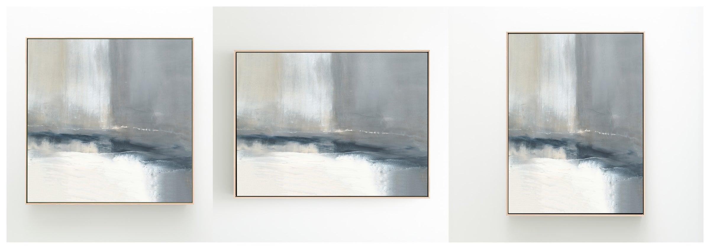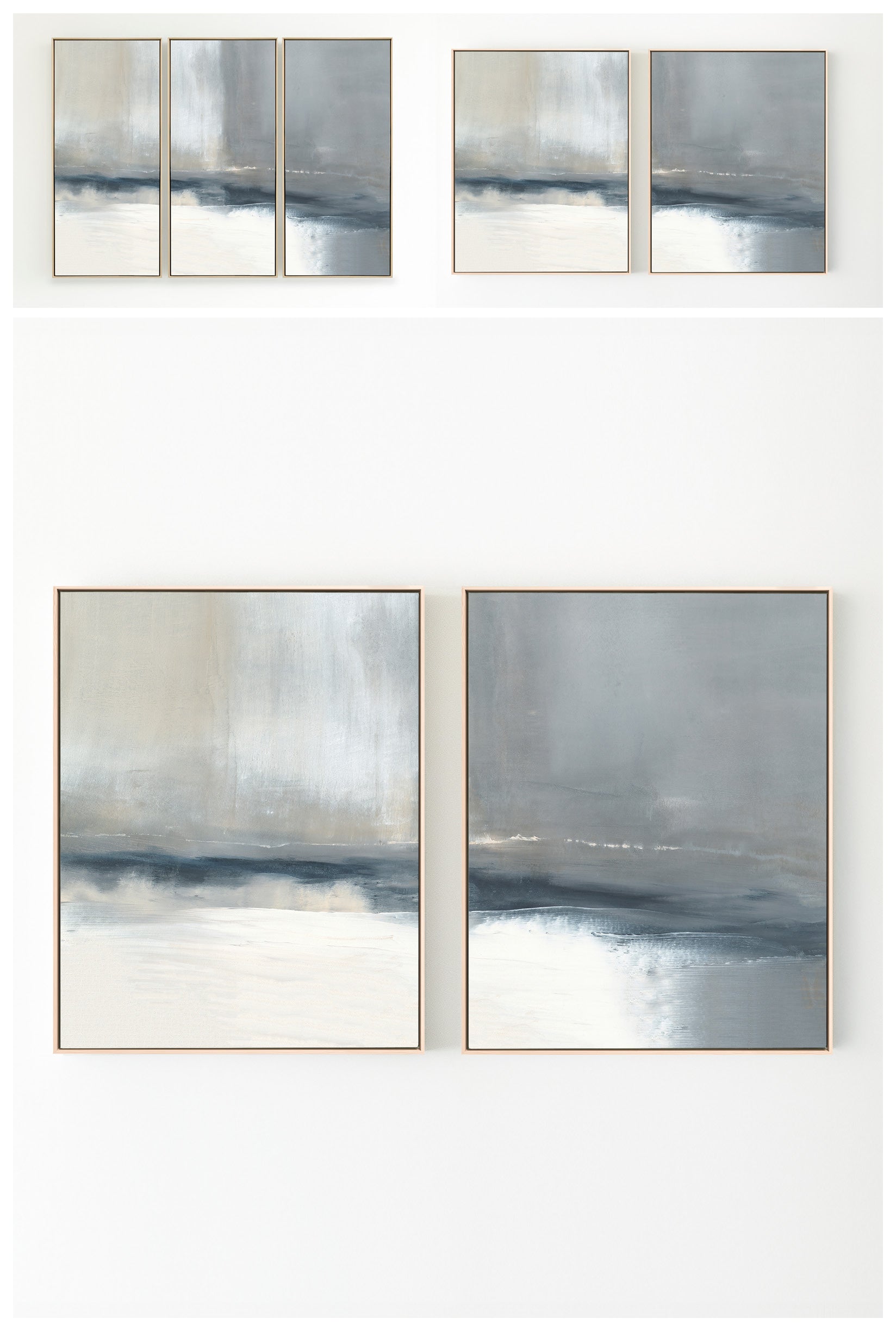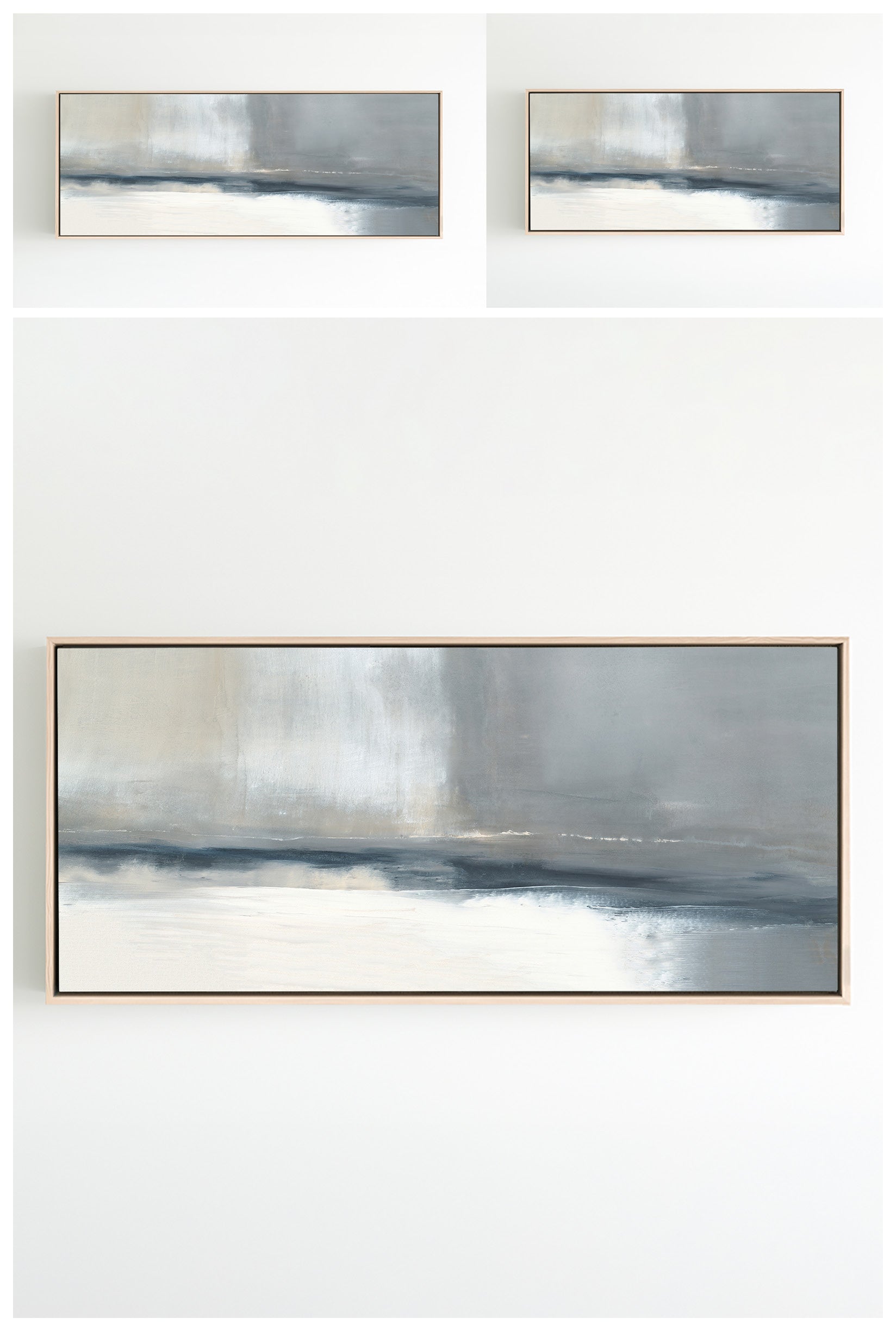 The artwork has a coastal stormy mood, layered in deep blues. The Collection offers a range of options. The Canvas Basics format the work in square, horizontal, and vertical canvases. The Canvas Sets extend the painting across multiple canvases as a diptych or triptych. The Narrow Canvas is a great solution for hard to fill spaces, available in a range of sizes. Additional sizing is available as a hand-finished and signed mixed media canvas.