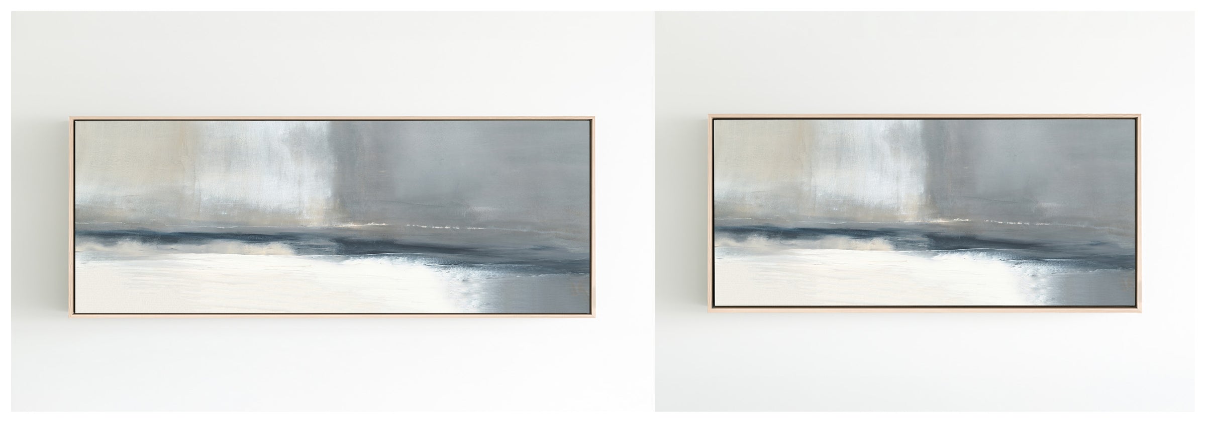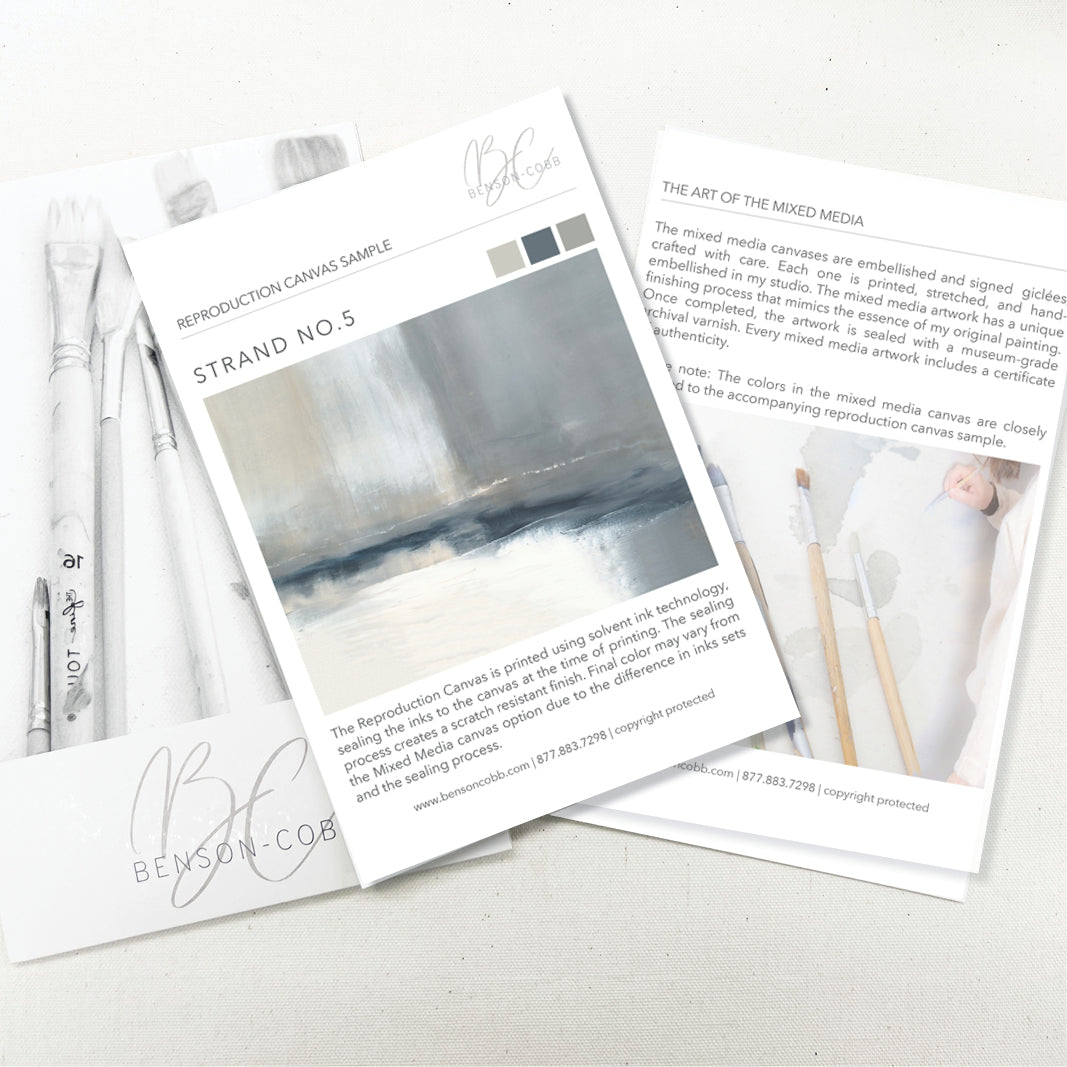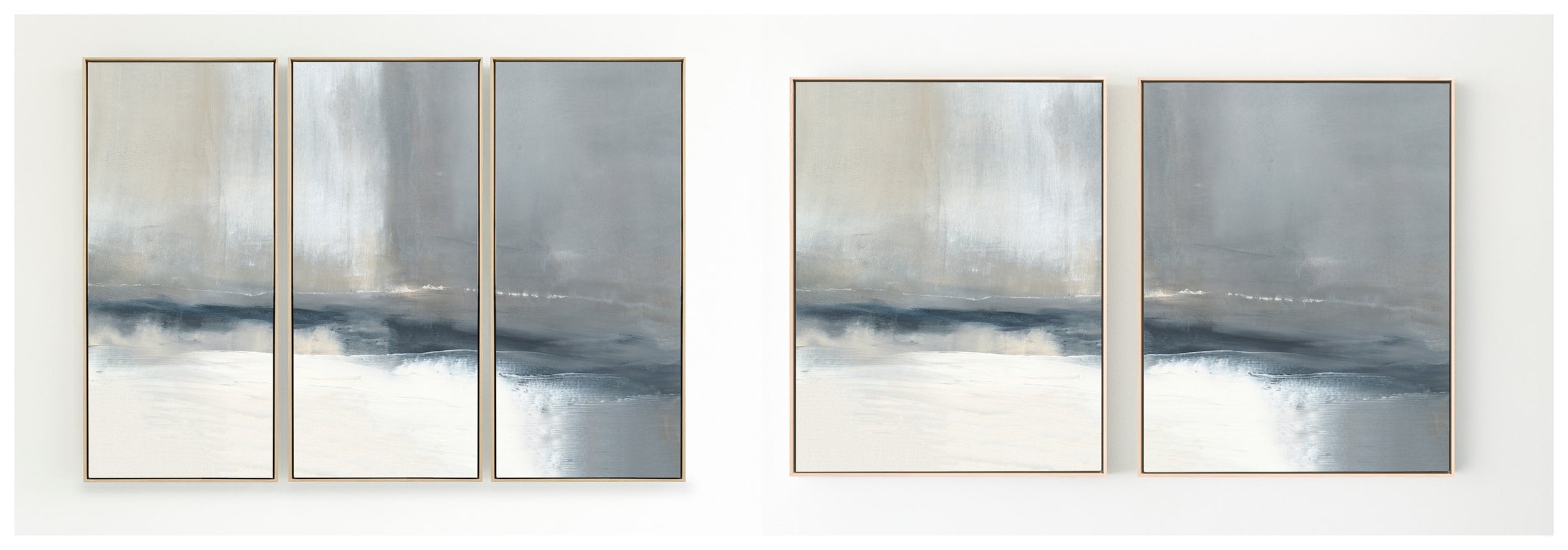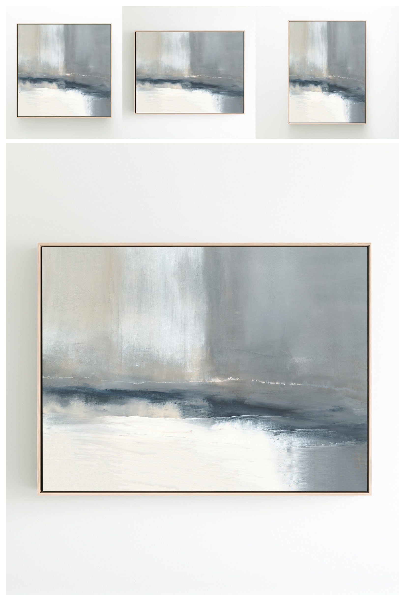 The artwork has a coastal stormy mood, layered in deep blues. The Collection offers a range of options. The Canvas Basics format the work in square, horizontal, and vertical canvases. The Canvas Sets extend the painting across multiple canvases as a diptych or triptych. The Narrow Canvas is a great solution for hard to fill spaces, available in a range of sizes. Additional sizing is available as a hand-finished and signed mixed media canvas.
