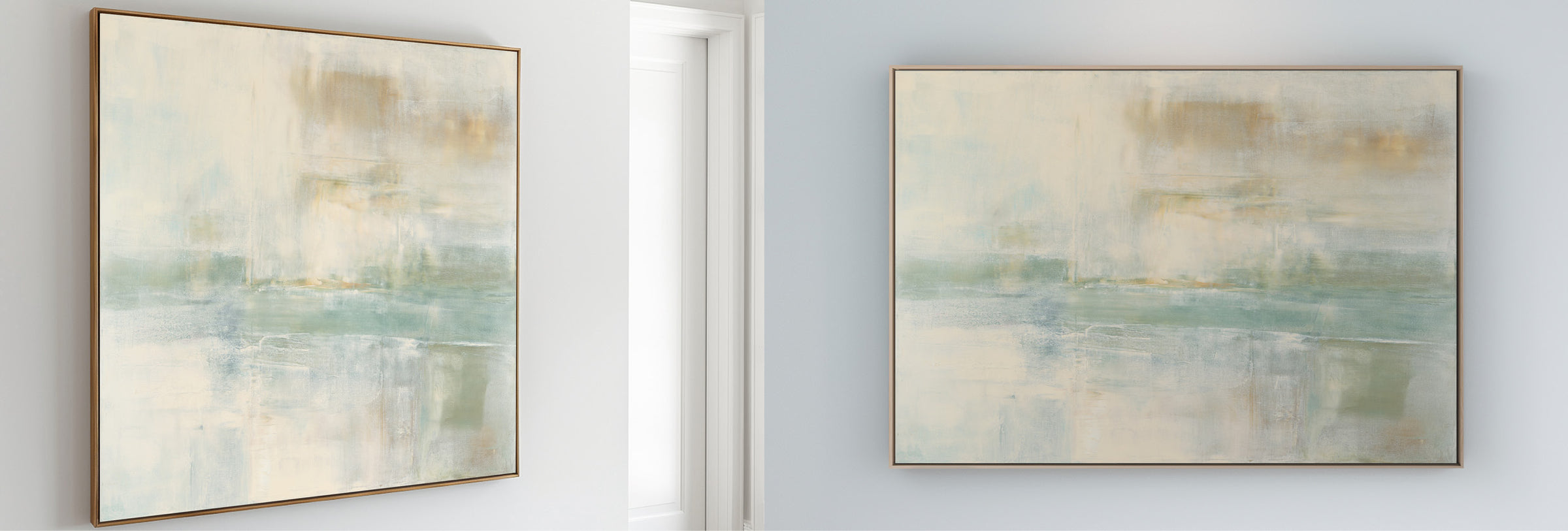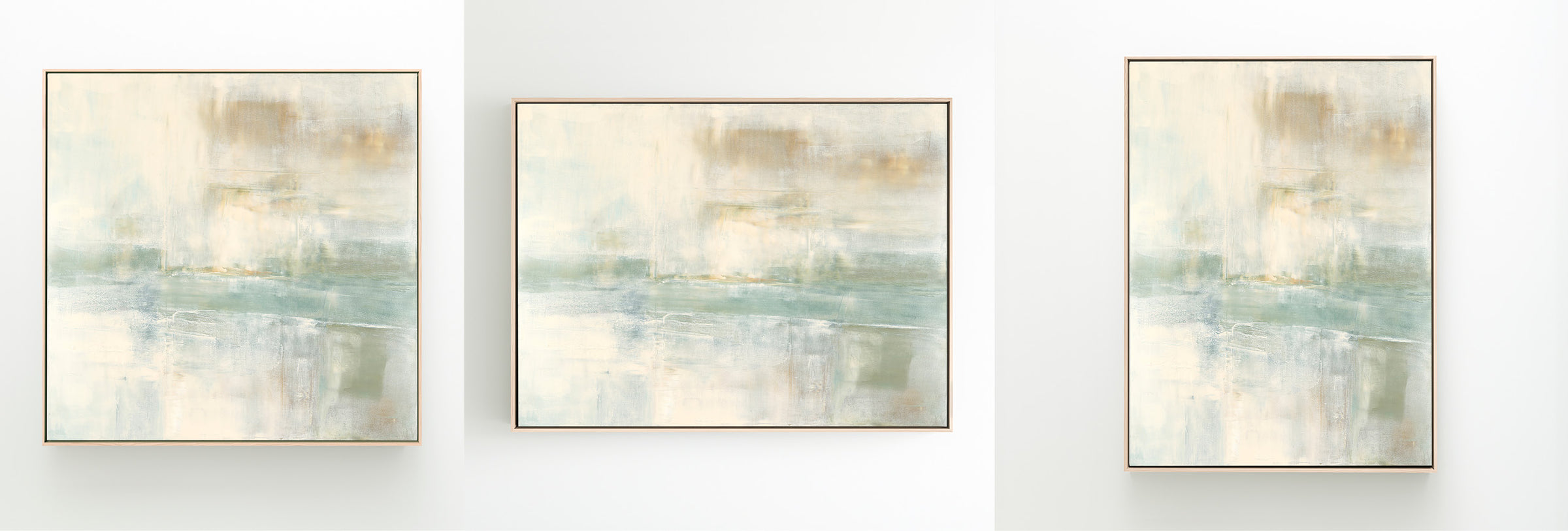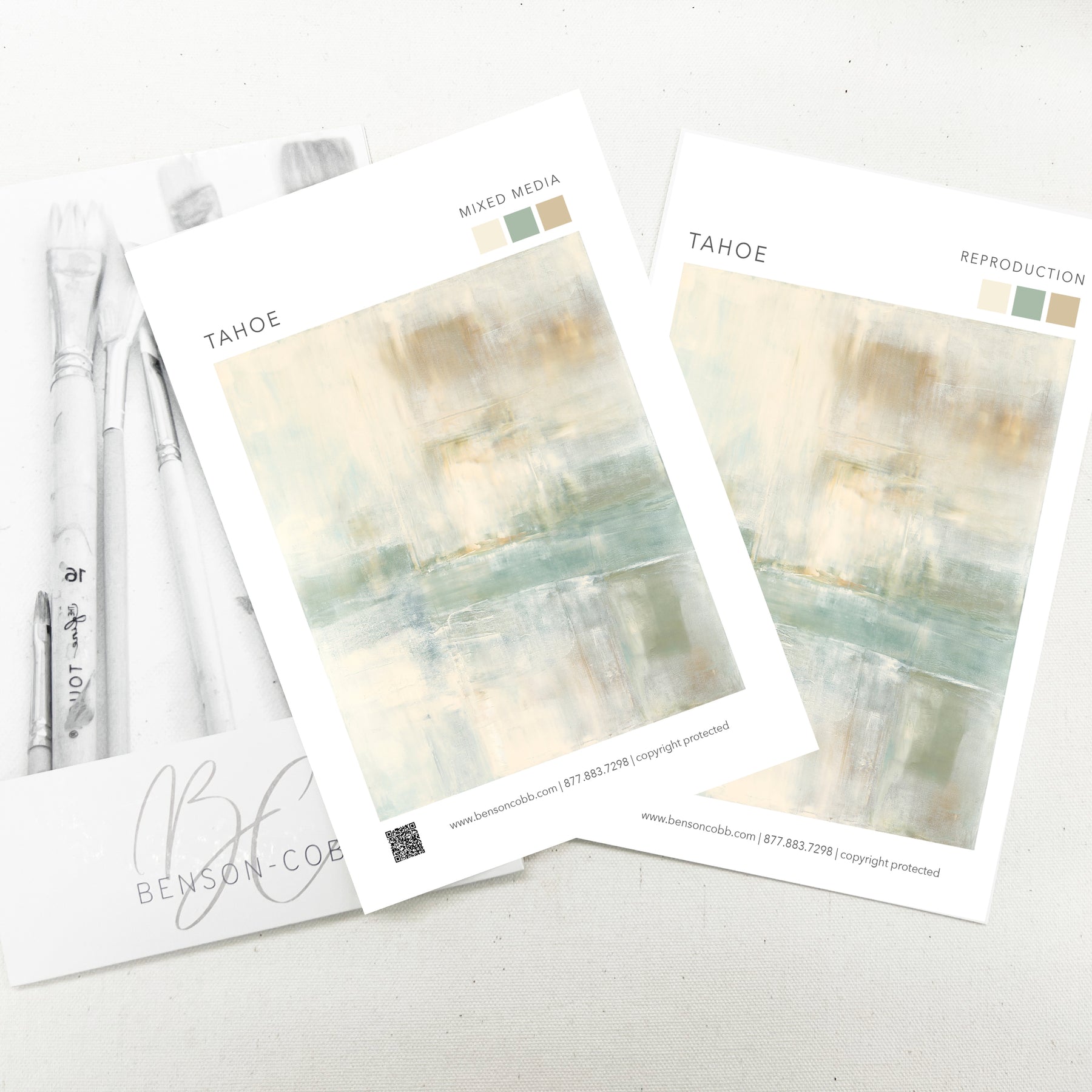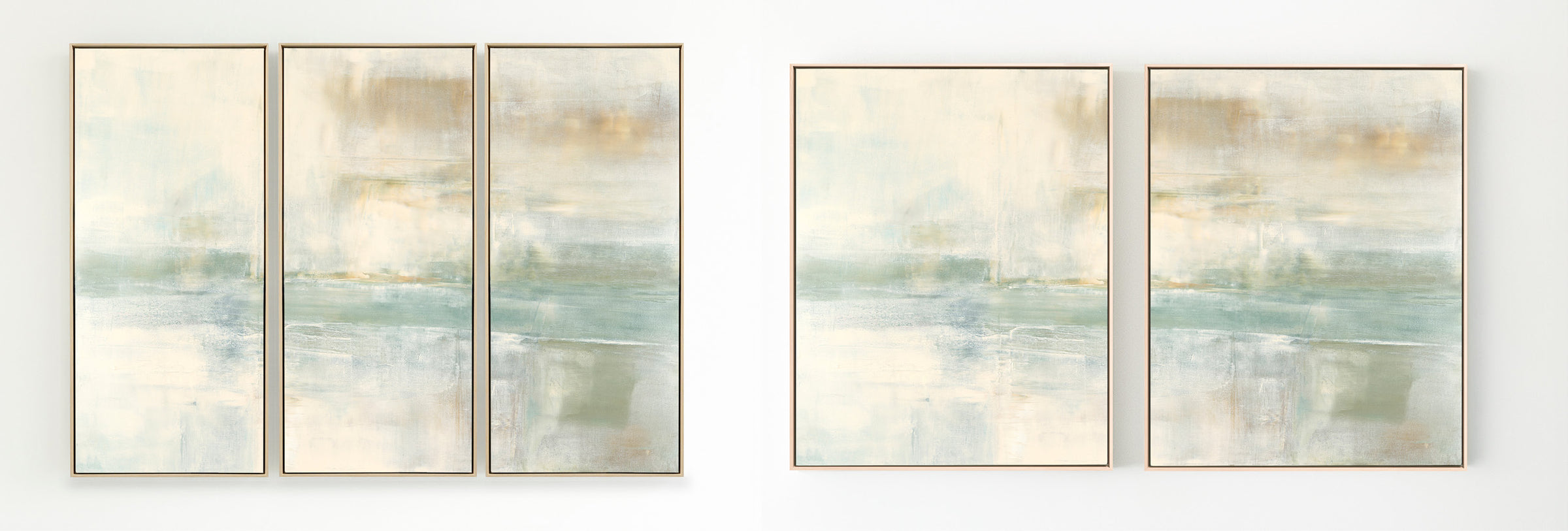 Released in 2016, the top-selling work is layered in sage greens and buttery tones. The Tahoe Collection offers the original painting as well as a range of reproductions. The Canvas Basics format the work in square, horizontal, and vertical canvases. The Large Canvases offer our most impactful sizes. The Canvas Sets extend the painting across multiple canvases as a diptych or triptych. The Narrow Canvas is a great solution for hard to fill spaces, available in a range of sizes. Additional sizing is available as a hand-finished and signed mixed media canvas.