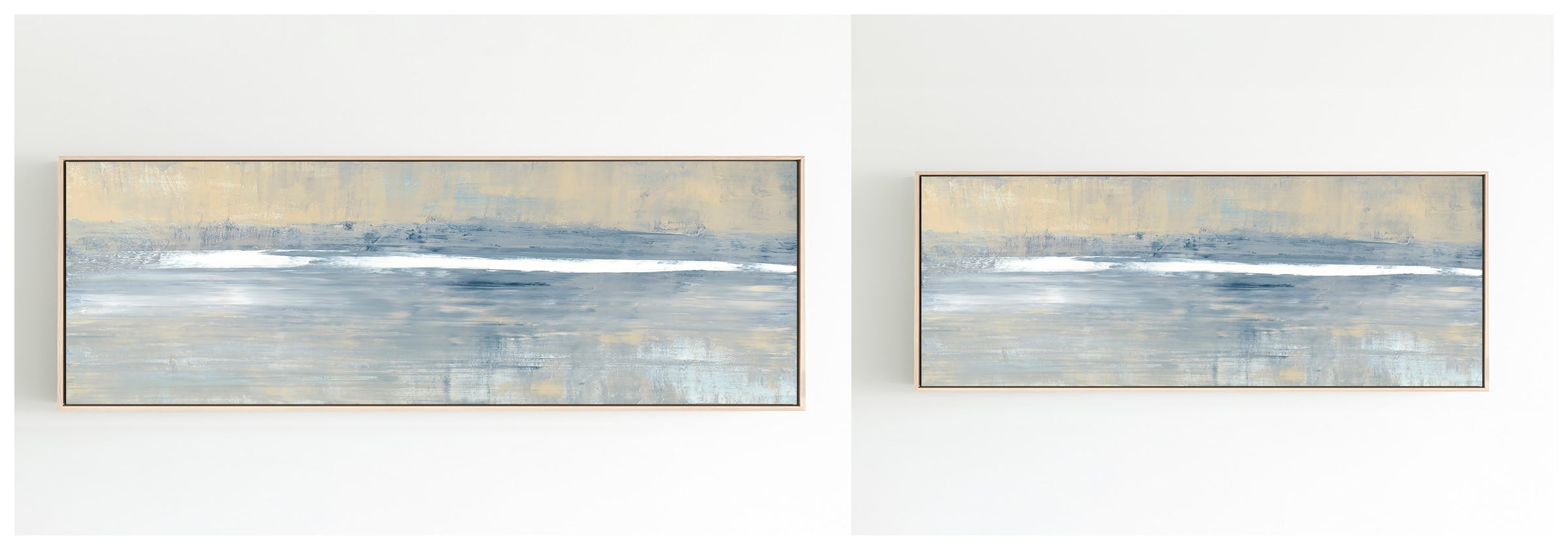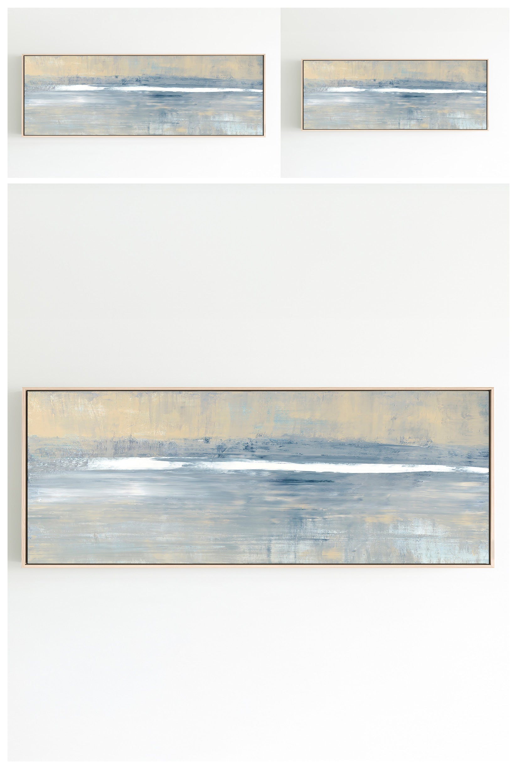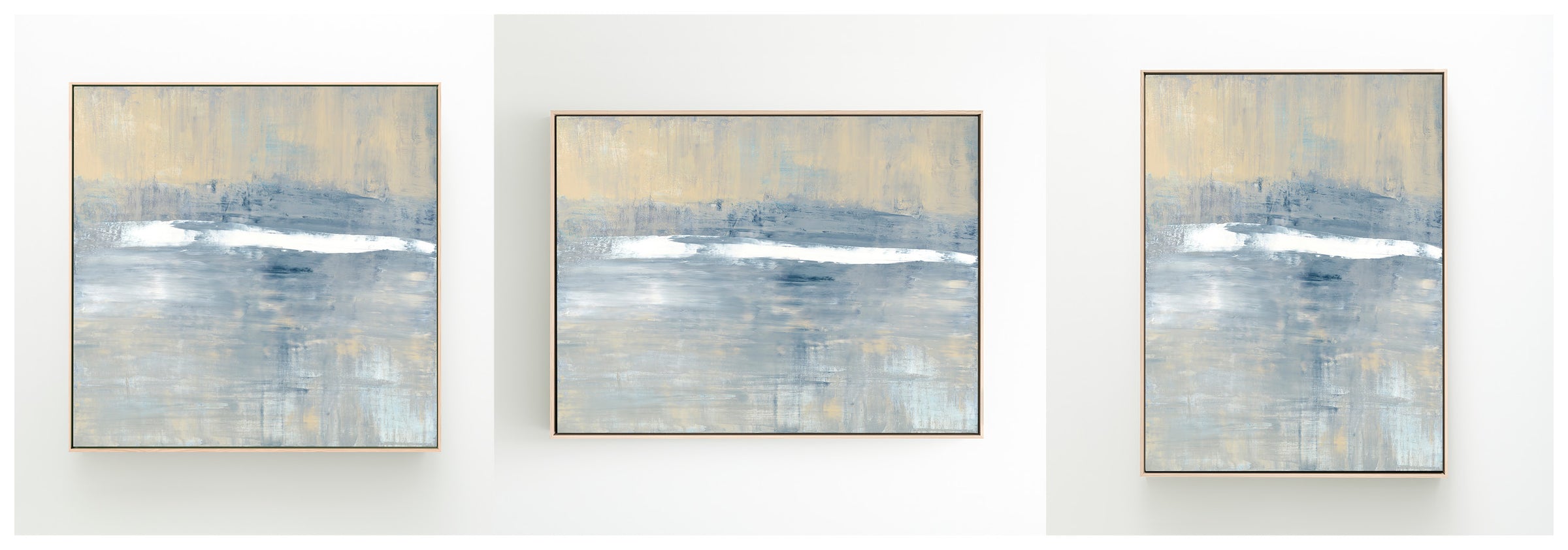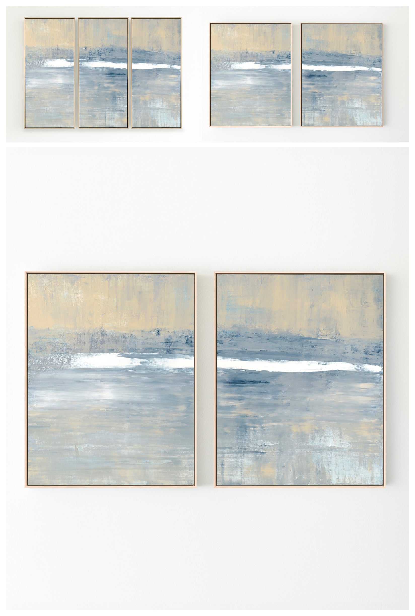 Layered in blues and creams, the original 60x60 canvas was painted in 2016. The Collection offers the work in many forms as a reproduction. The Canvas Basics format the work in square, horizontal, and vertical canvases. The Large Canvases offer our most impactful sizes. The Canvas Sets extend the painting across multiple canvases as a diptych or triptych. The Narrow Canvas is a great solution for hard to fill spaces, available in a range of sizes. Additional sizing is available as a hand-finished and signed mixed media canvas.