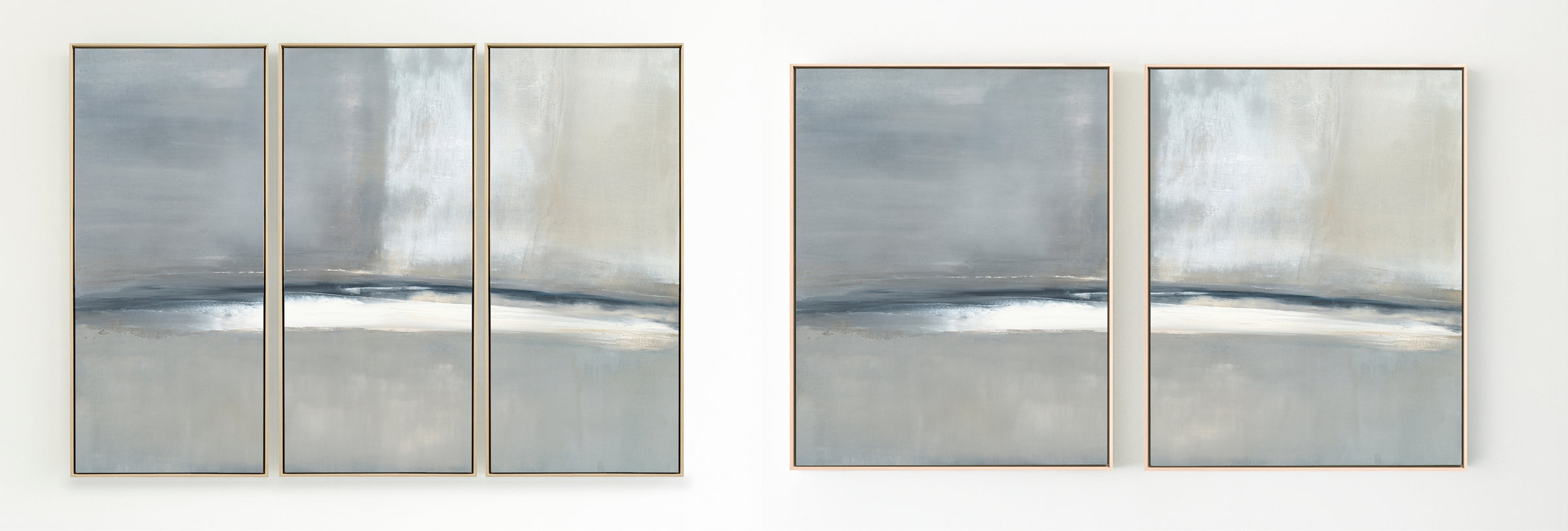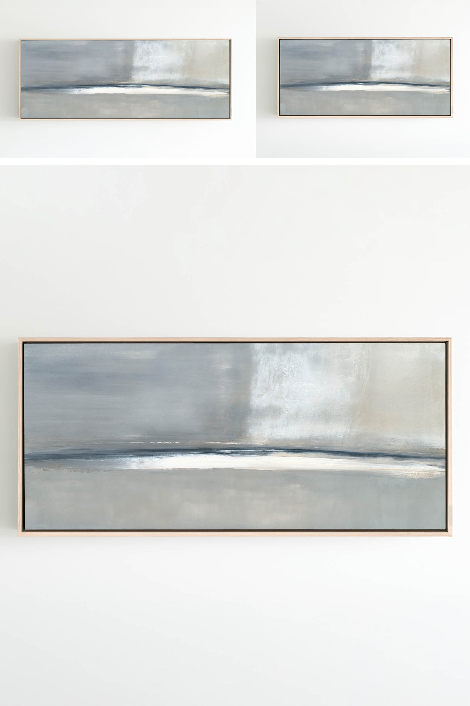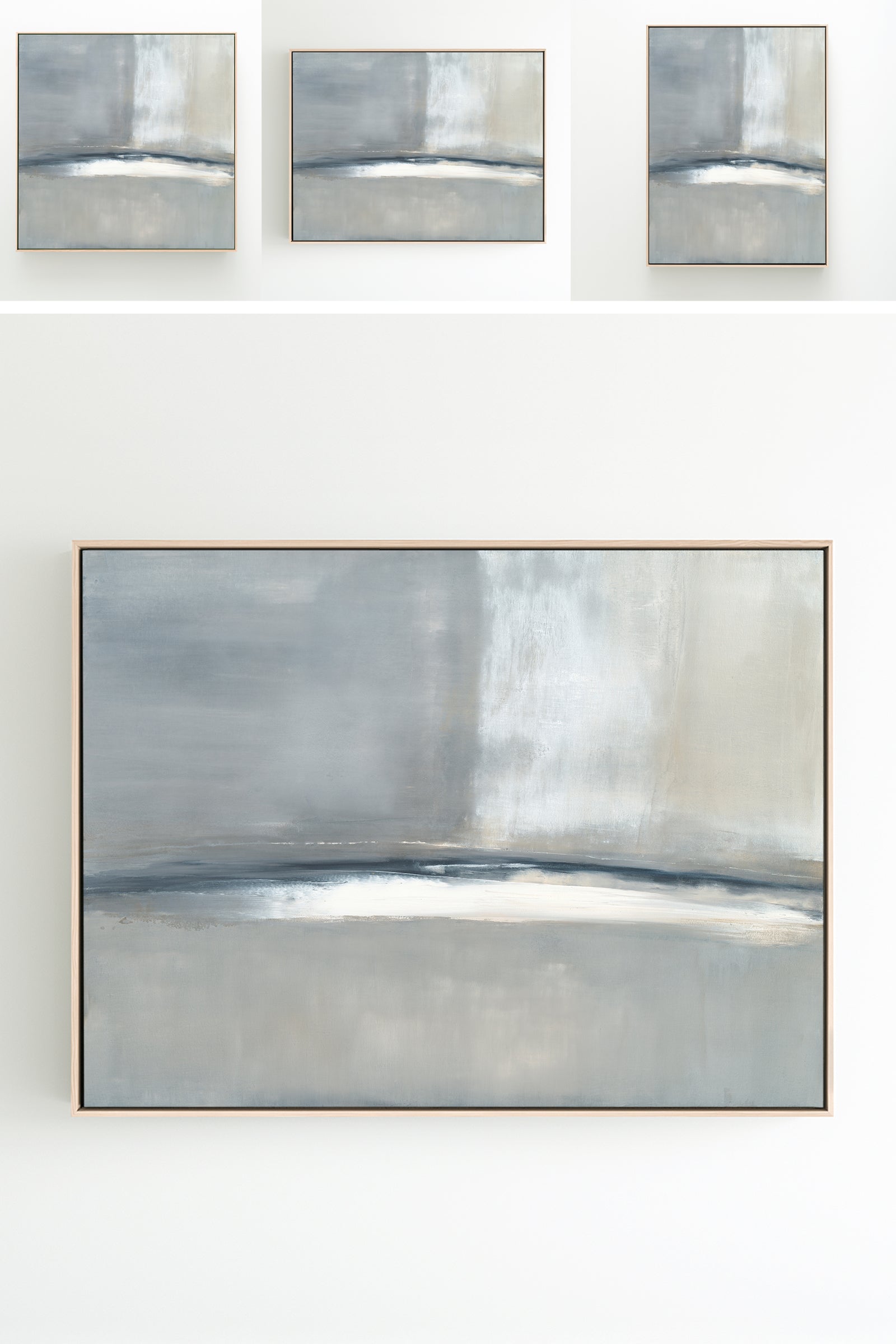 Subtle gray-blues with strokes of deep navy create interest and movement in this coastal inspired work. The original painting was sold to a private collector in 2011. The Strand Collection offers the painting in a range of reproductions. The Canvas Basics format the work in square, horizontal, and vertical canvases. The Large Canvases offer The Strand in our largest sizes. The Canvas Sets extend the painting across multiple canvases as a diptych or triptych. The Narrow Canvas is a great solution for hard to fill spaces, available in a range of sizes. Additional sizing is available has a hand-finished and signed mixed media canvas.