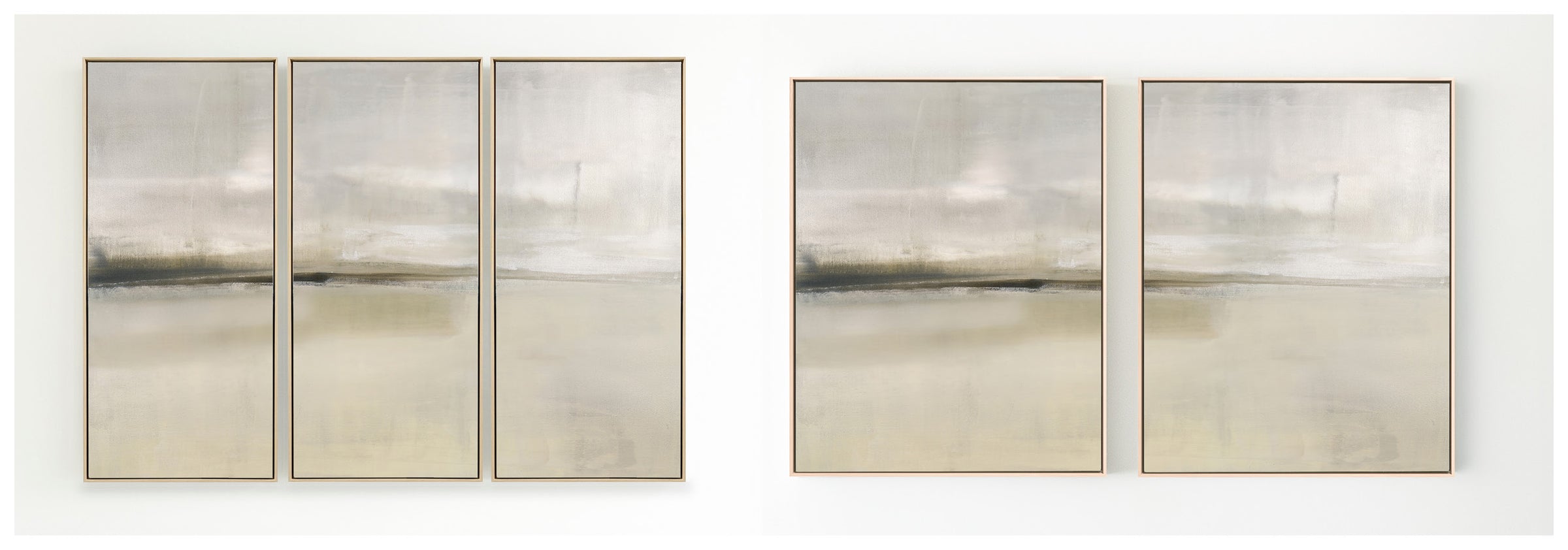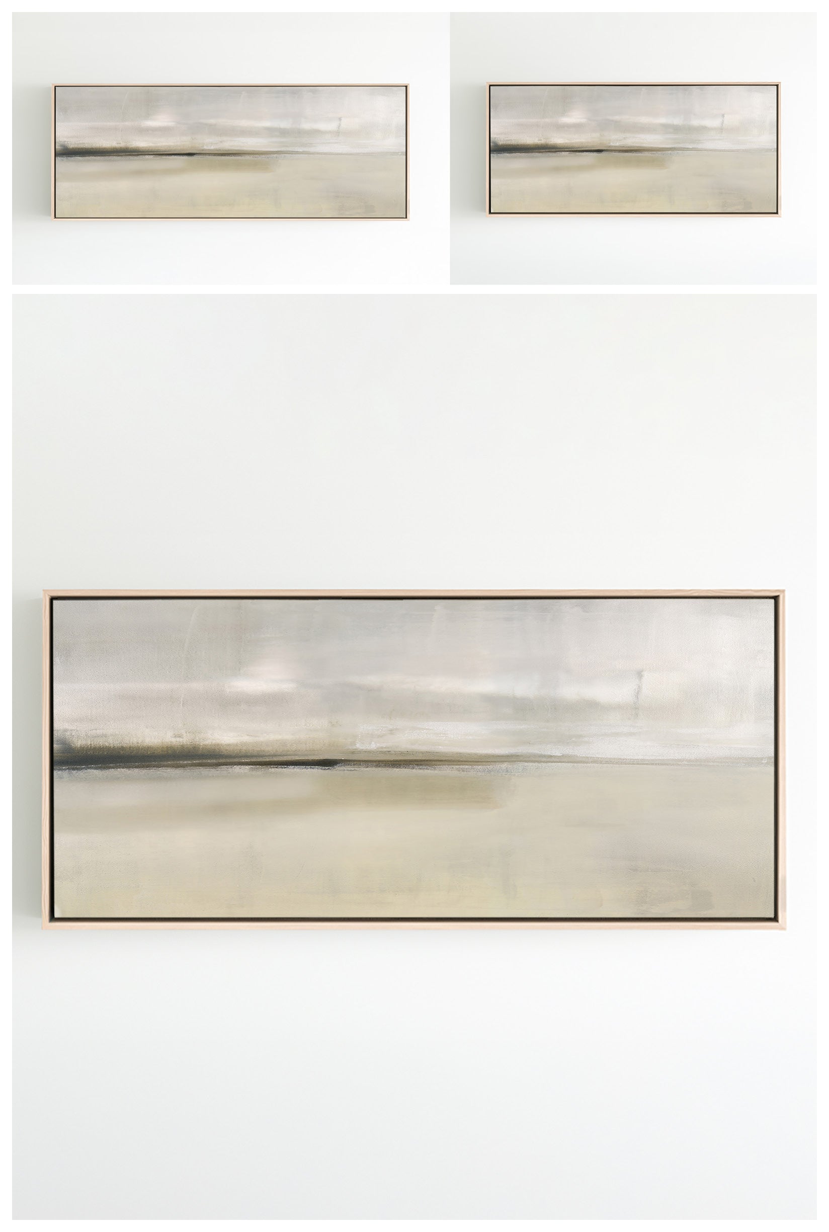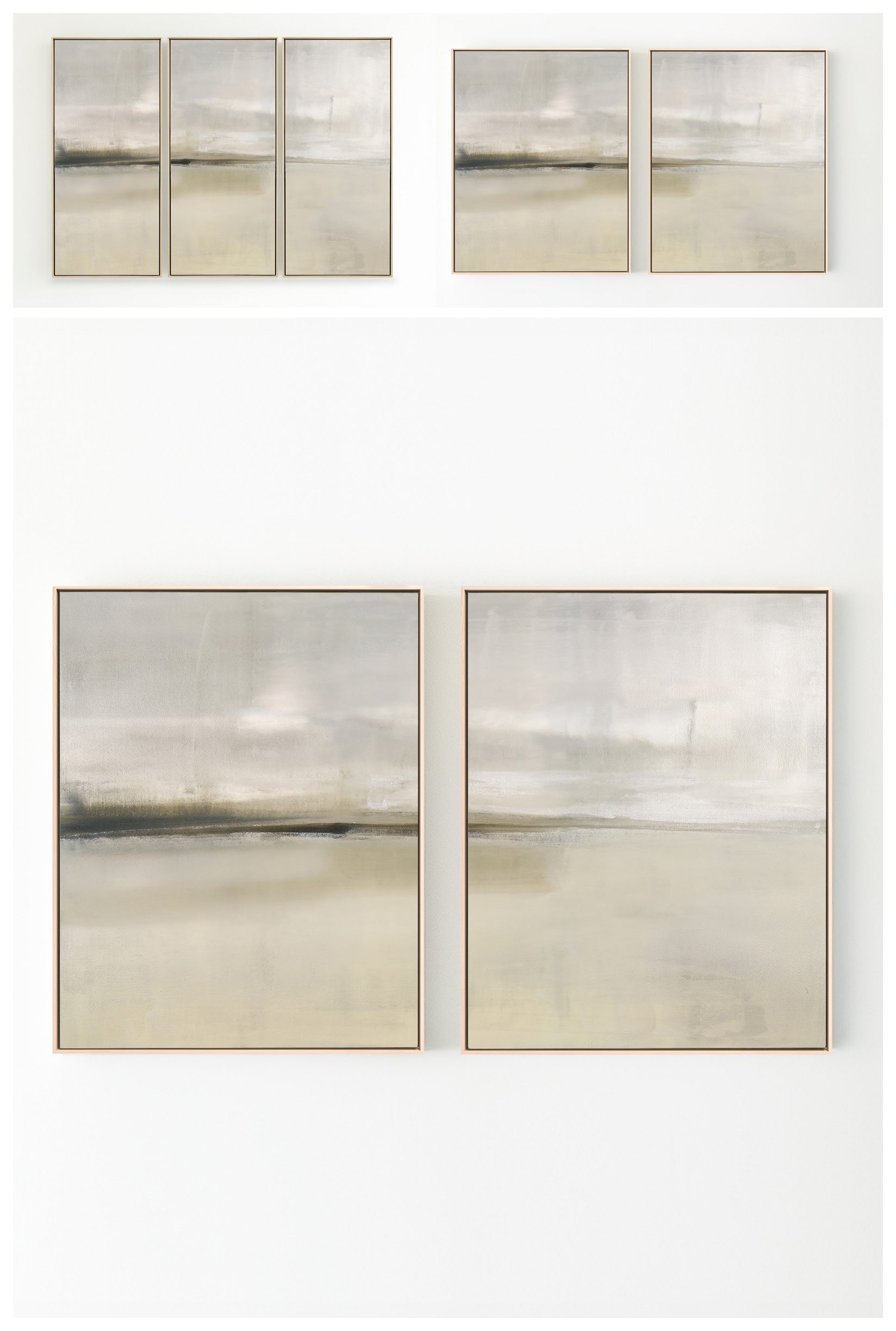 Released in 2012, the soft landscape is layered in minimalistic strokes of creams, charcoals, and deep browns. The Collection offers the painting in several options, from the canvas basics in square, horizontal, and vertical formats, to canvas sets and a narrow adaptation in a range of sizes. Additional customization is available as a hand-finished mixed media canvas.